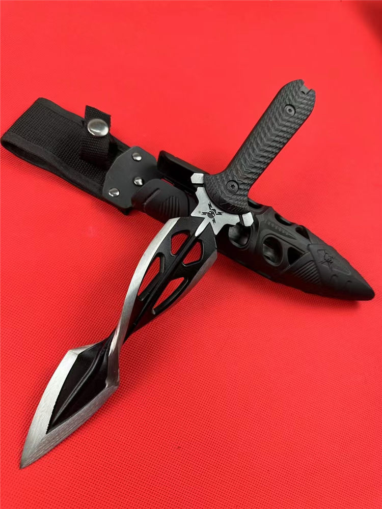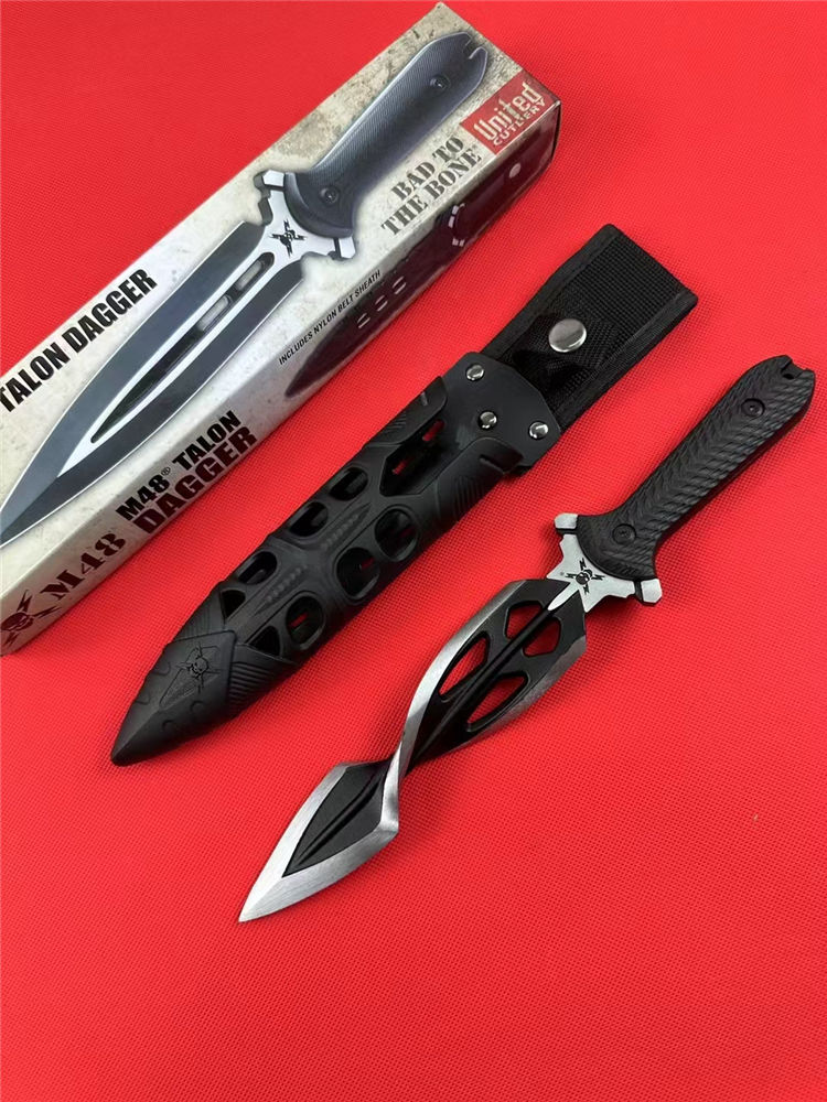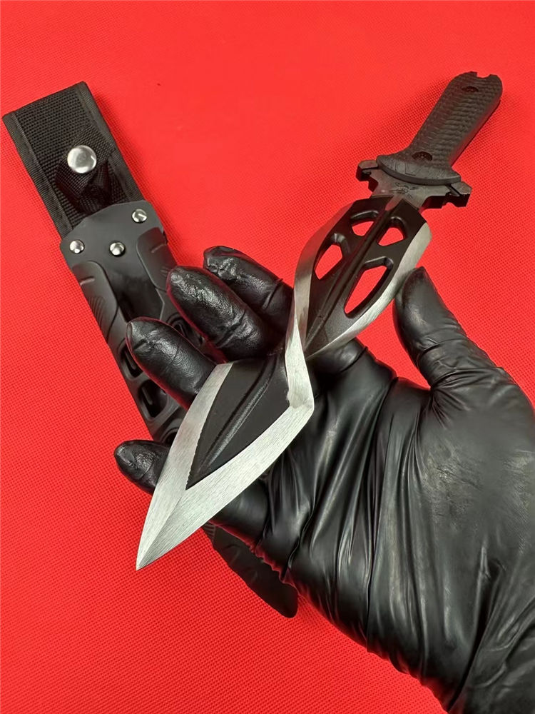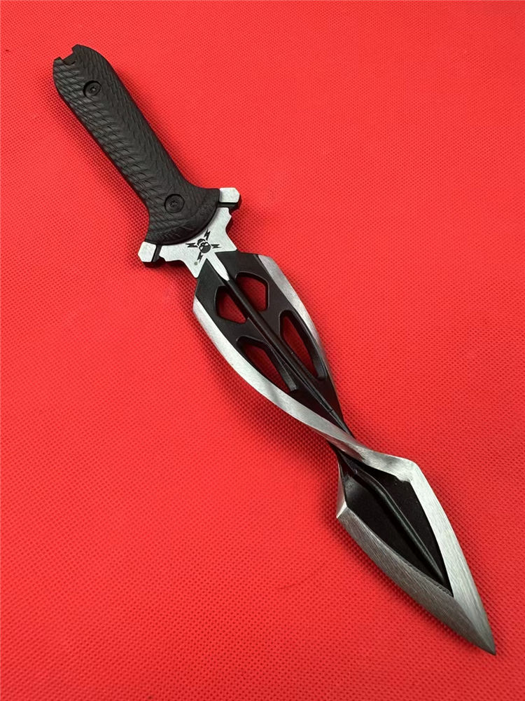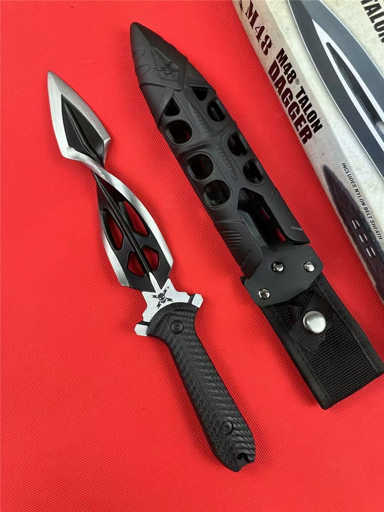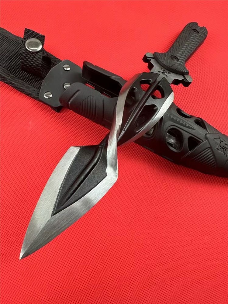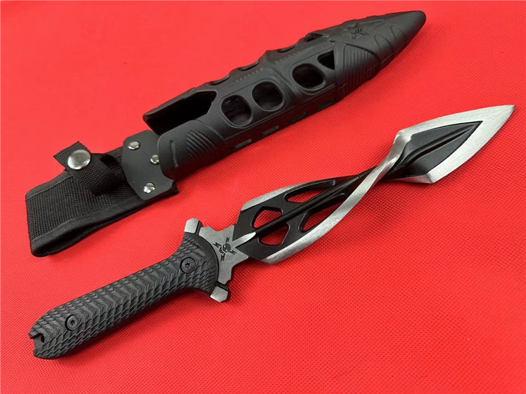 M48螺旋双刃直刀 全长:31.5cm 刃长:16.5cm 柄长:12.5cm 刃材:铸造高铬钢(喷砂黑) 刃厚:8mm 刃宽:4cm 柄材:G10黑柄 刀鞘:ABS塑胶鞘