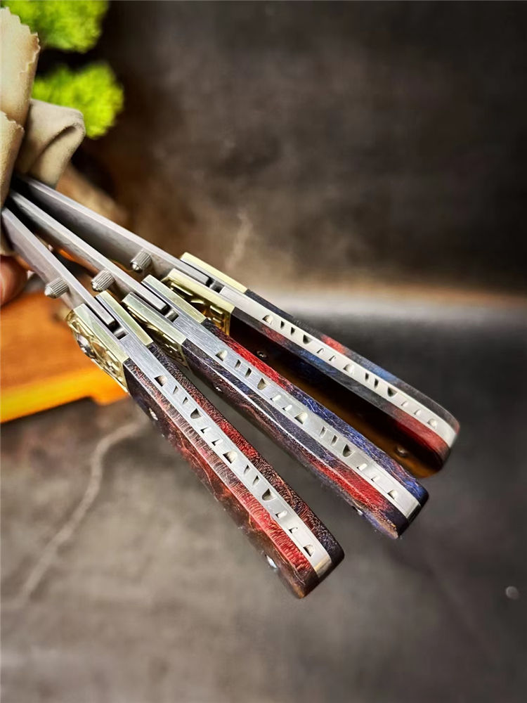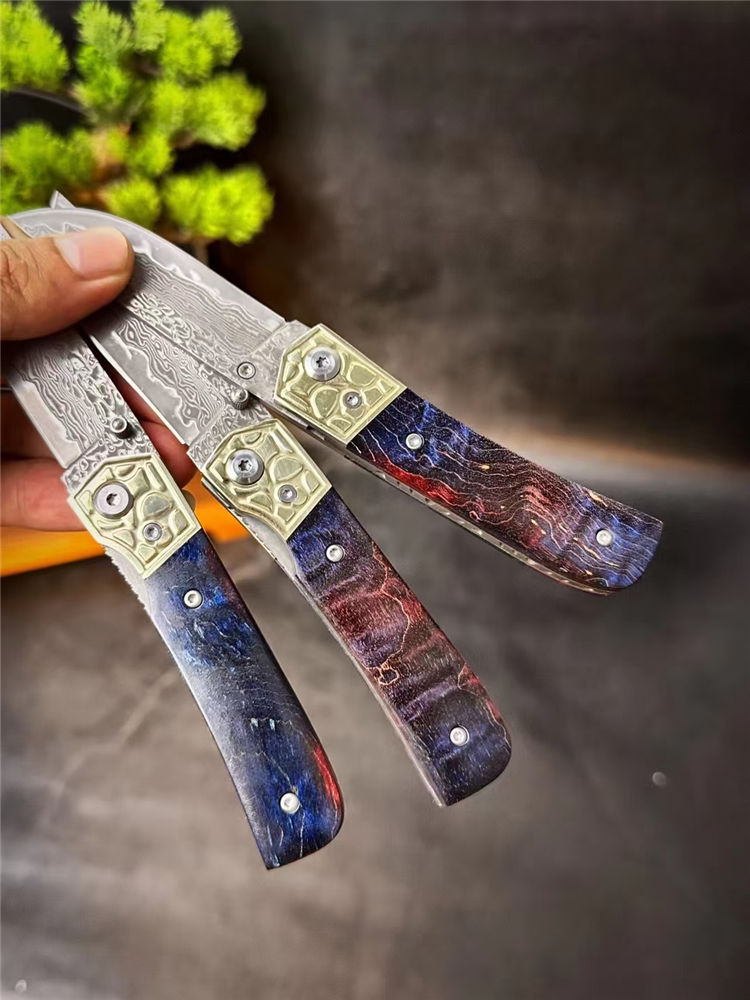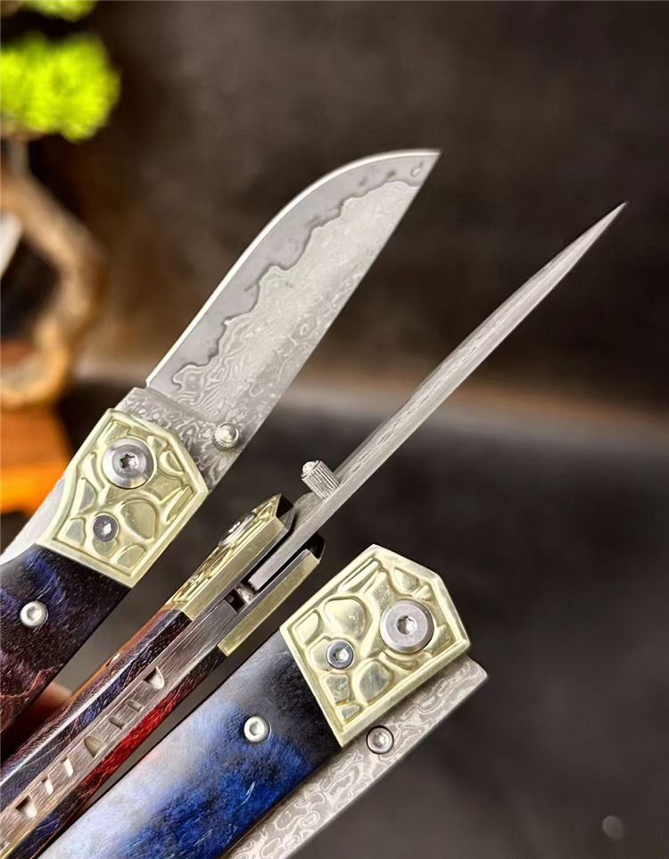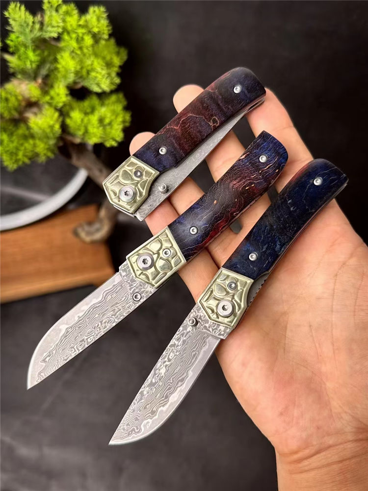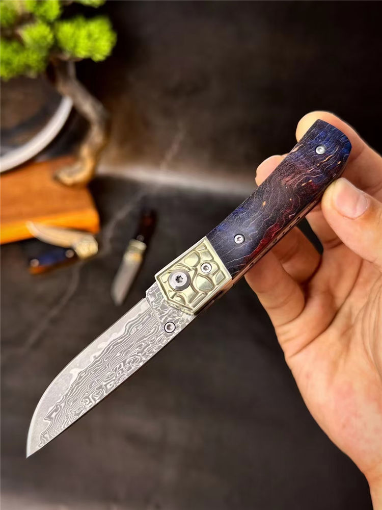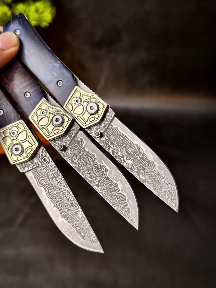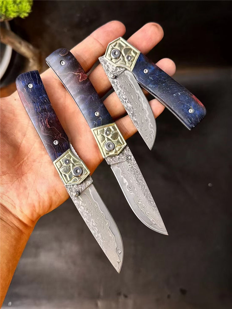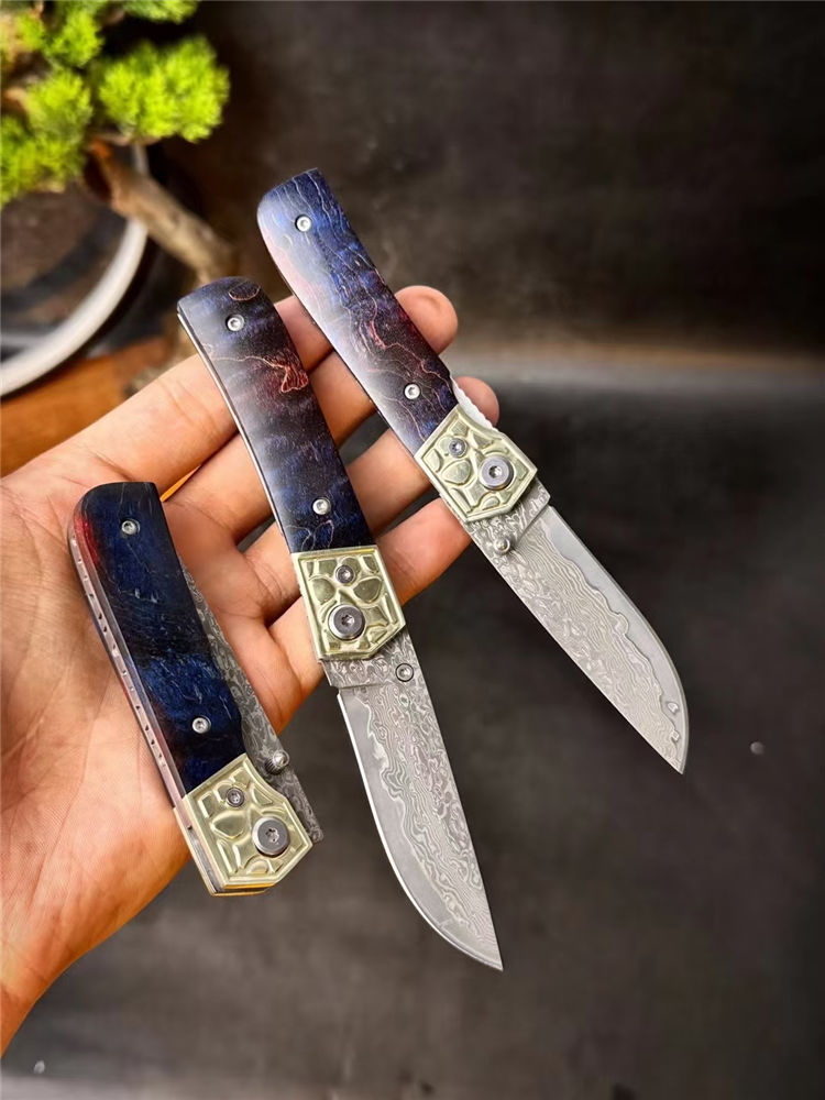 大马士革星辰折刀 总长:16cm 刀刃:7cm 手柄:9cm 刃厚:2.5mm 刀宽:1.8cm 刃材:进口锻造大马士革钢 硬度:60HRC 柄材:黄铜+进口稳定木 重量:105g 包装:黑色手工小盒