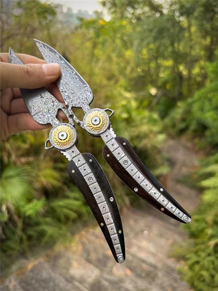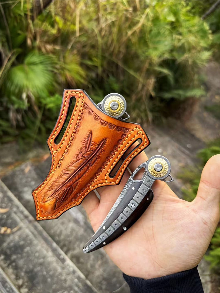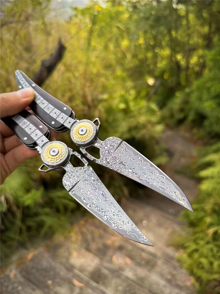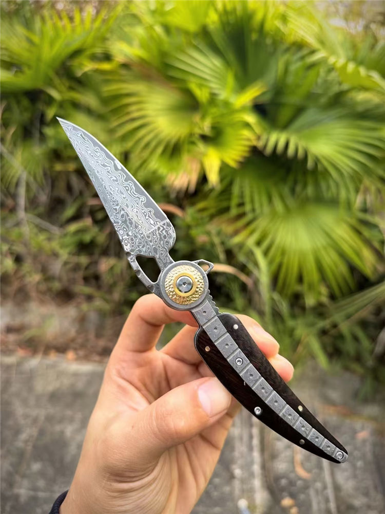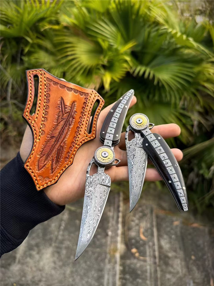 大马士革柳叶折刀 总长:21.2cm 刃长:8.6cm 柄长:12cm 厚度:3MM 宽度:2.7cm 钢材:进口锻造大马士革钢(85层) 硬度:60HRC 热处理:真空热处理 柄材:一体锻造大马士革钢+纯黄铜+黑檀木 重量:145g(净重) 包装:黑色手工盒