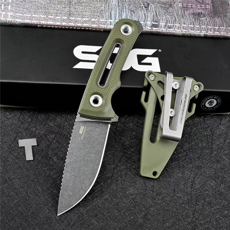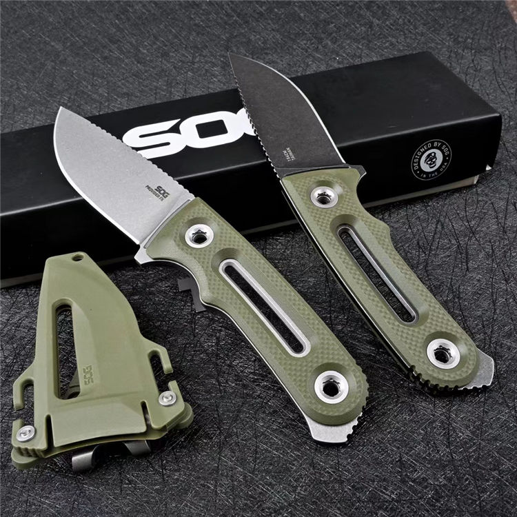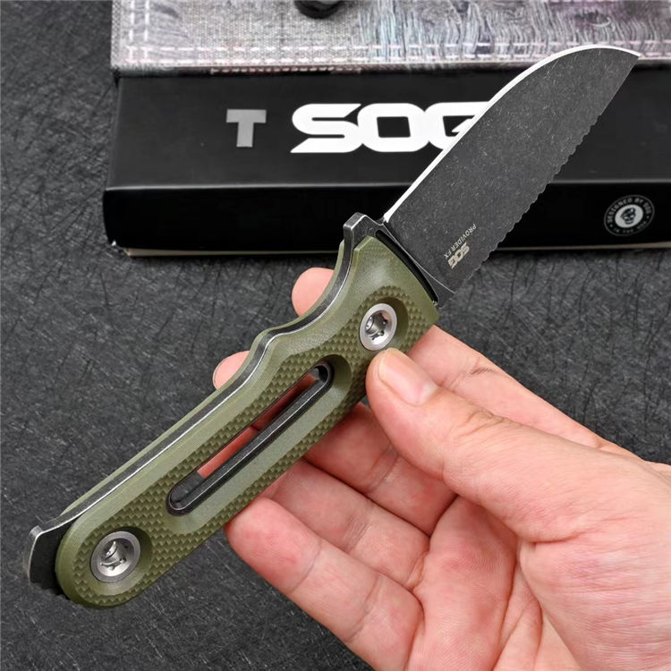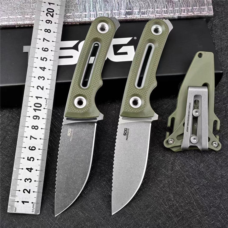 SOG-FX17-35-01-57直刀 全长:20.8cm 刃长:9.5cm 柄长:11cm 刃厚:0.33cm 刃宽:3.3cm 刀重:140g (单刀) 毛重:295g 钢材:154CM 柄材:绿色G10 硬度:58-60HRC 表面:数控磨石洗 包装:原厂礼盒 刀鞘:尼龙玻璃纤维+钢夹 附件:送拆刀工具
