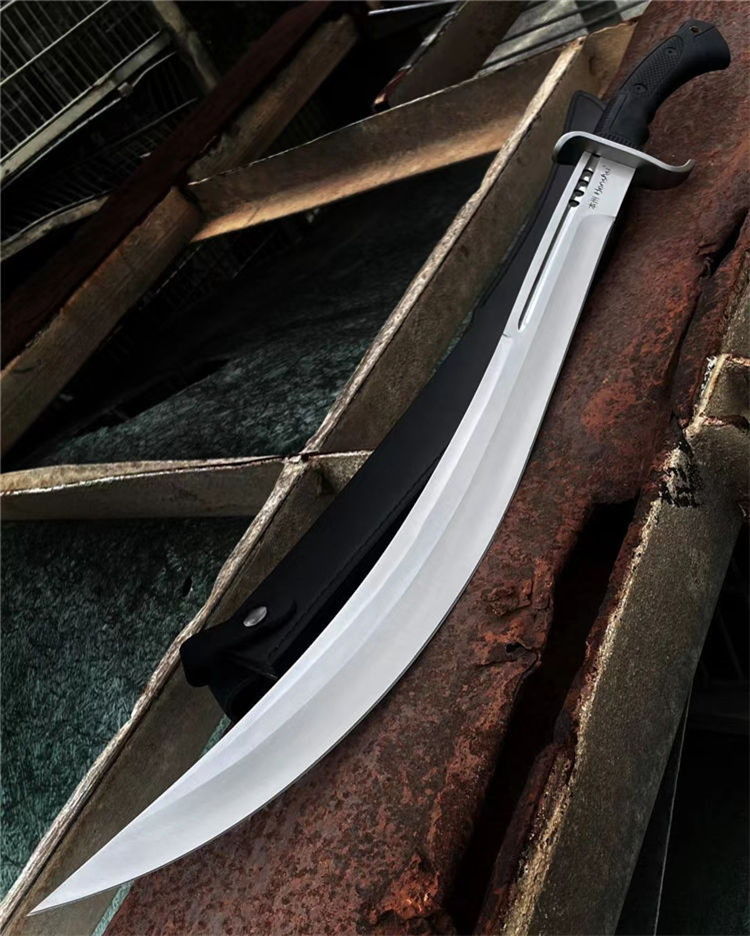 本州战术开山砍刀 全长:73cm 材质:1065高碳钢锻造而成 表面:拉丝抛光 刃厚:5毫米 劈砍性能强悍,叨背开槽开孔处理。TPR材料手柄,防滑性能优越,保证全天候优良手感。配皮鞘收纳,外形霸气