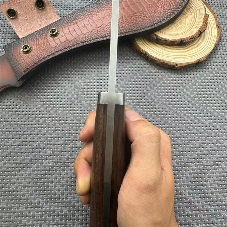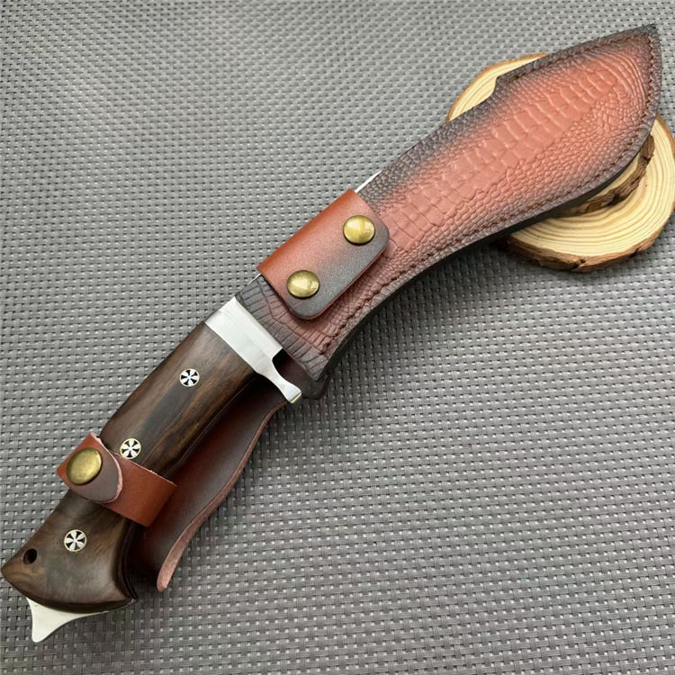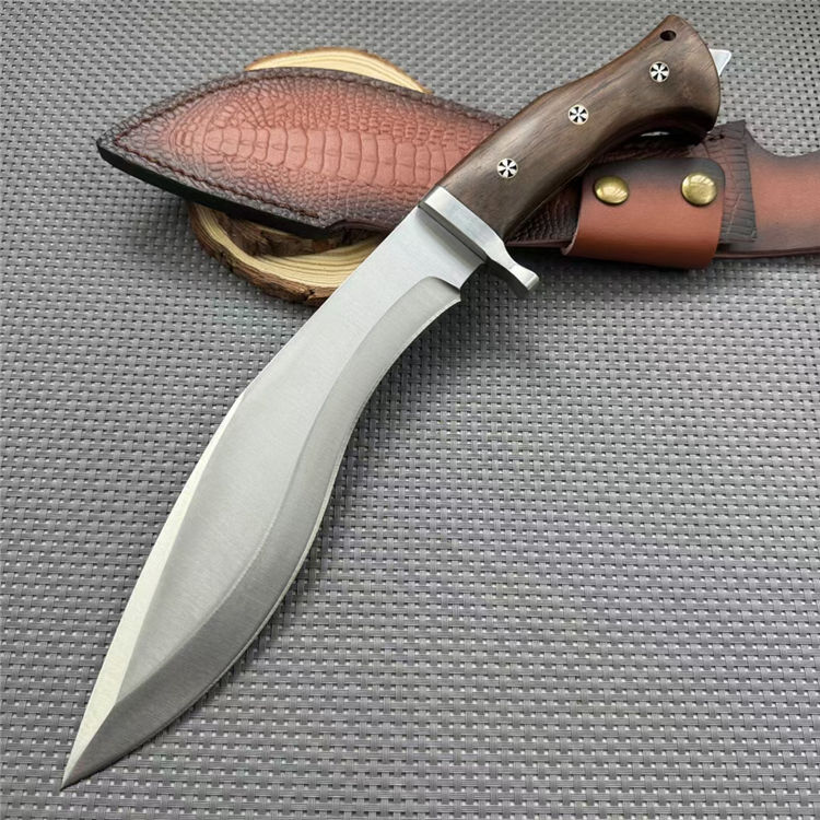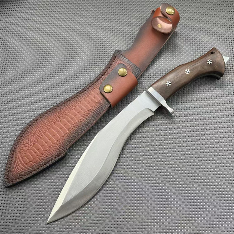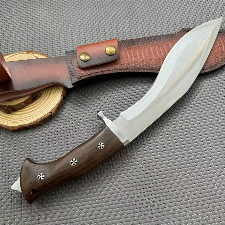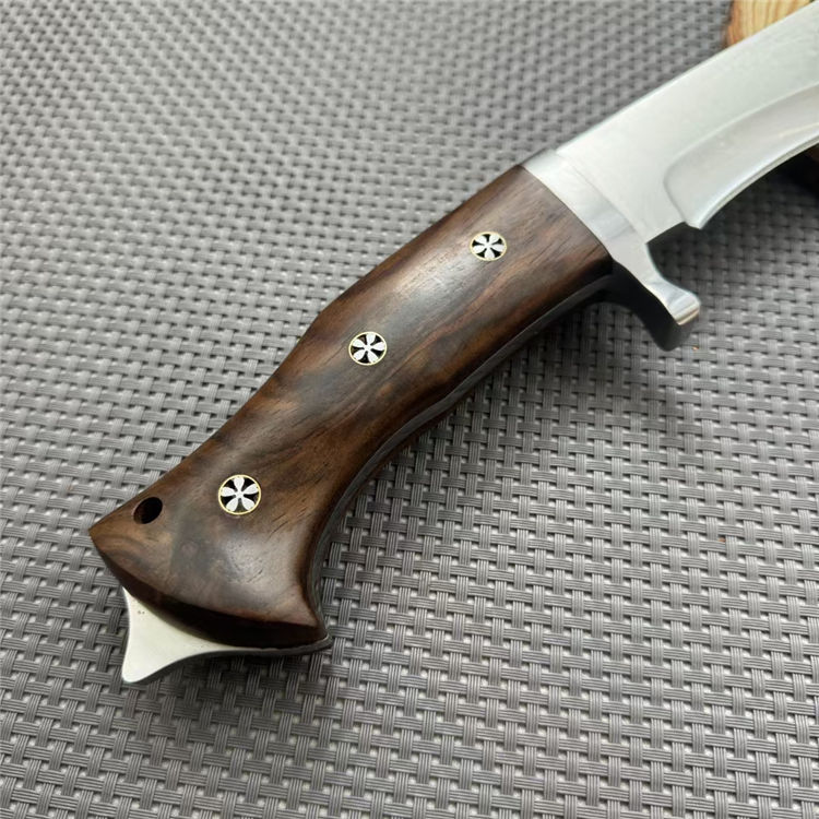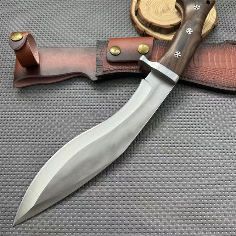 廓尔喀重击狗腿弯刀 全长:39mm 刃长:230mm 柄长:140mm 刃宽:55mm 刃厚:6mm 刃材:5cr13钢 净重:670g 毛量:784g(含皮套包装物) 硬度:59HRC 柄材:酸枝木 配套:皮套+礼盒包装
