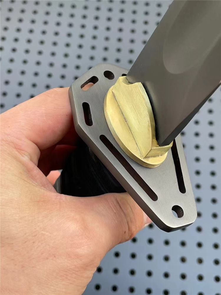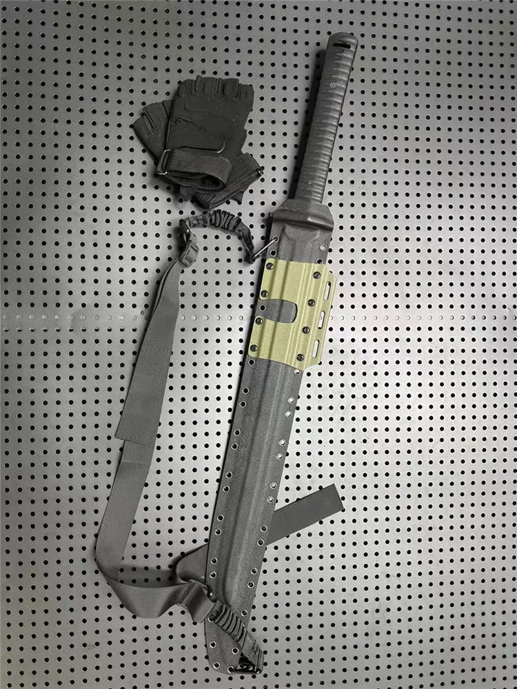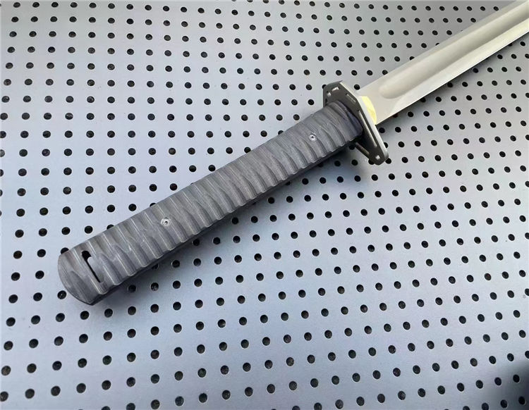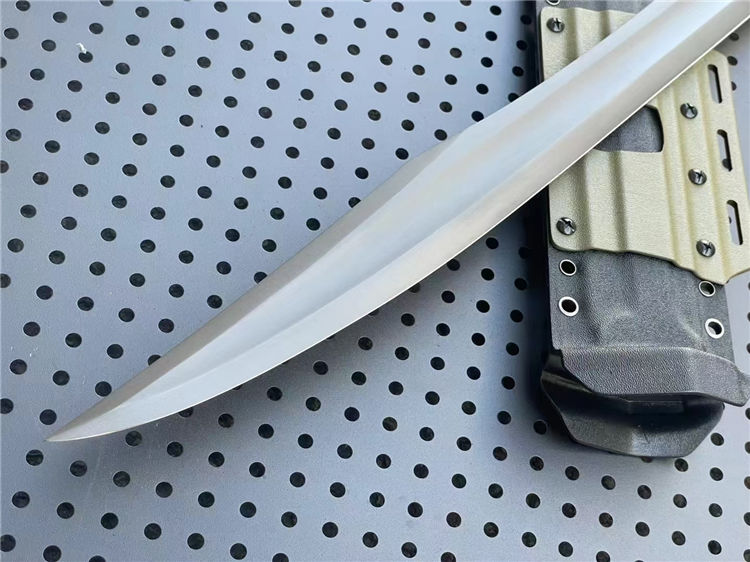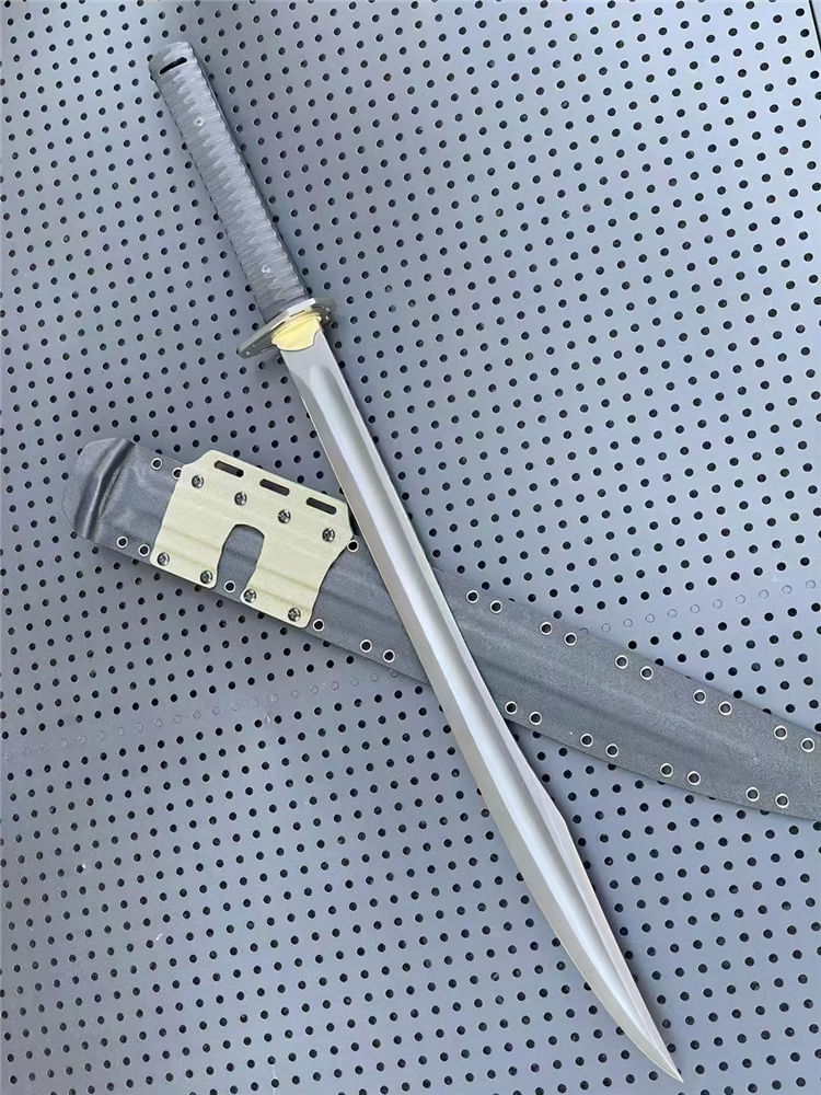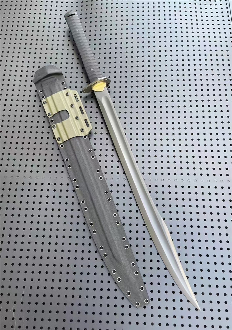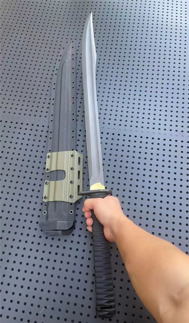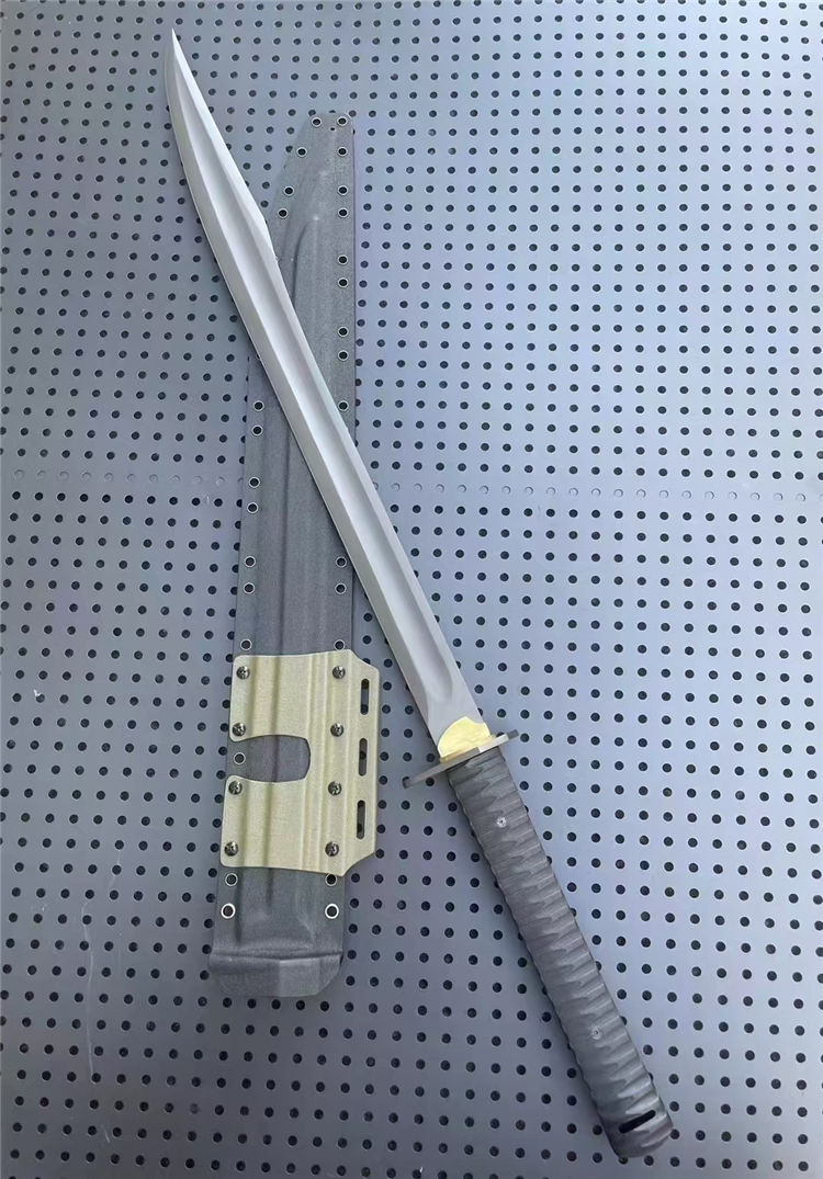 变异斯巴达猛士开山砍刀 全长:86cm 刃长:60cm 最宽:4cm 厚度:0.6cm 刃材:60Si2CrVA 柄材:G10 护手:不锈钢镀钛 表面:真空镀钛 刀鞘:K鞘+背带扣 带鞘重约:1580g 去鞘重约:1240g