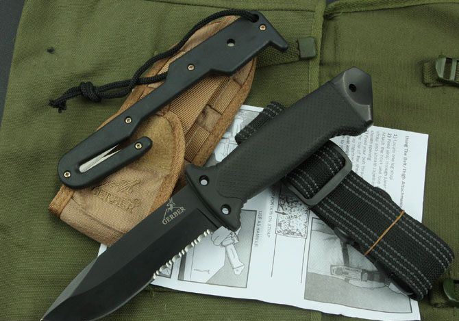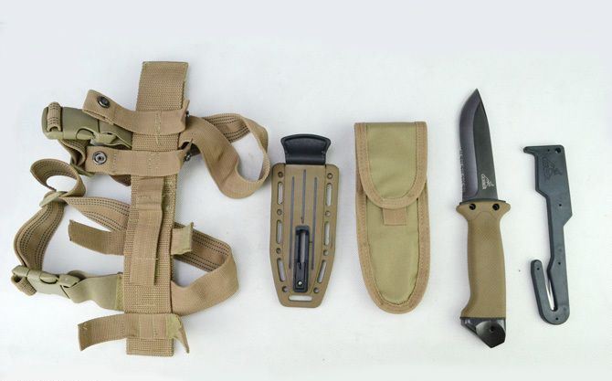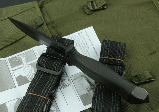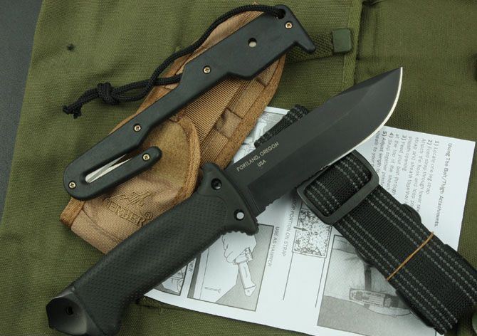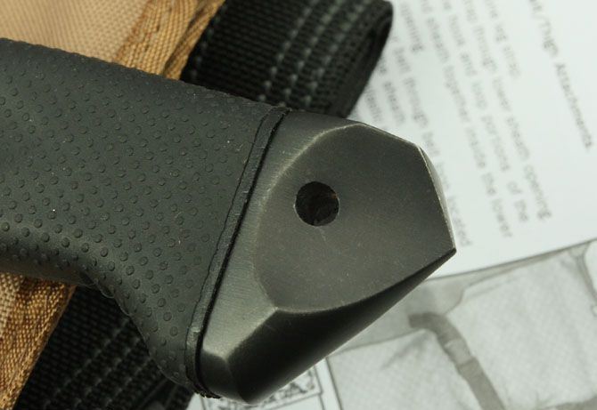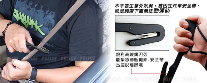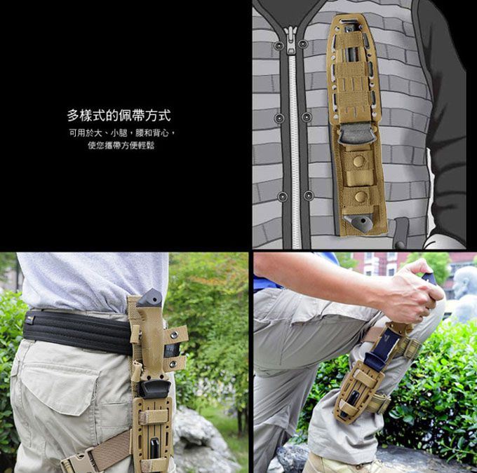 1.把手尾端可做击破器,榔头 2.把手可跟木棍捆绑做为茅 3.内附磨刀石 4.安全刀套设计 5.附刀套及伸缩带