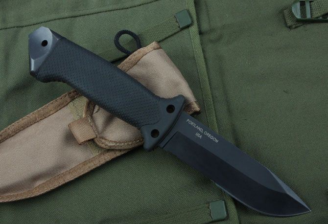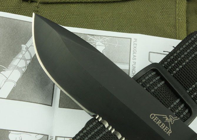 戈博—生存者步兵直刀(黑色柄) 全 长: 269mm 刀 长: 123mm 刃 材: 12C 27 硬 度: 58-60HRC 表 面: 黑色特弗龙涂层 刃 厚: 4.8mm 柄 长: 146mm 柄 材: FRN 玻璃纤维强化尼龙 重 量: 320g 原产地: 国内代工 1.把手尾端可做击破器,榔头 2.把手可跟木棍捆绑做为茅 3.内附磨刀石 4.安全刀套设计 5.附刀套及伸缩带
