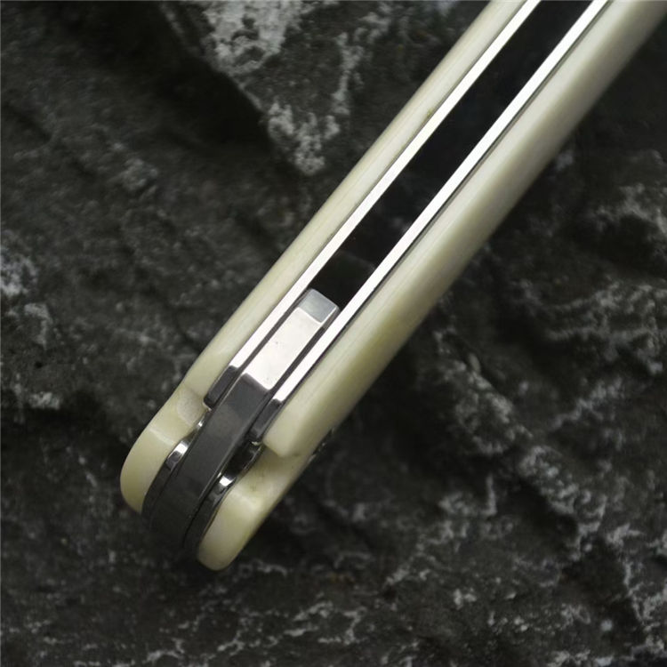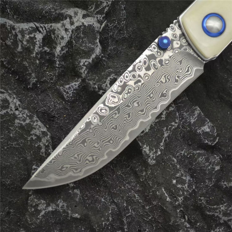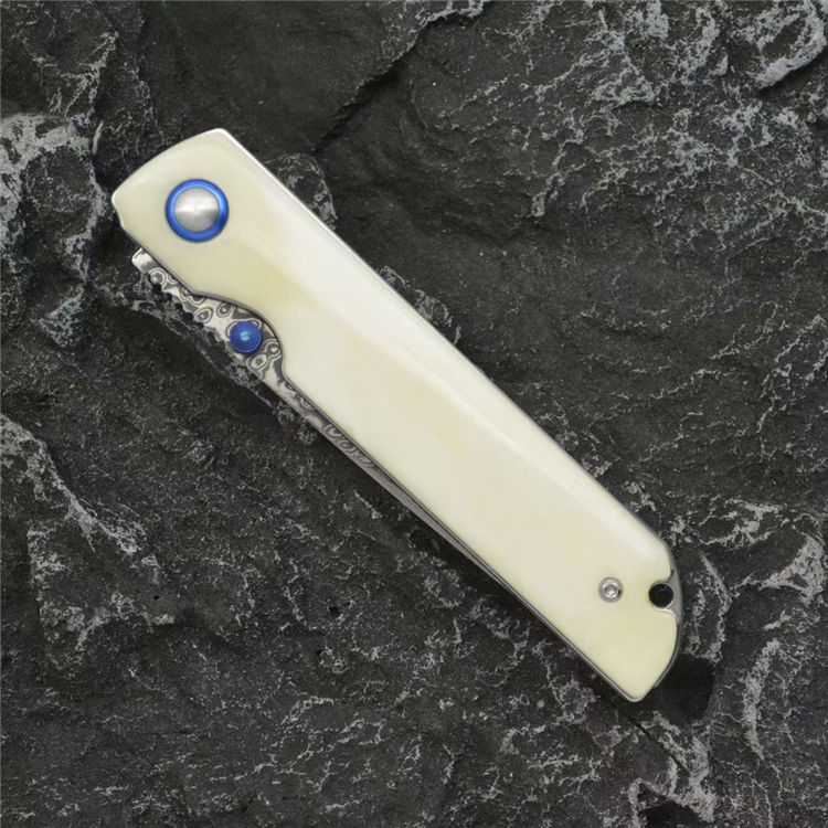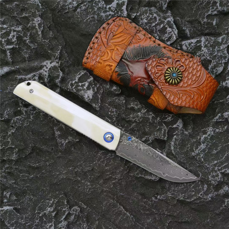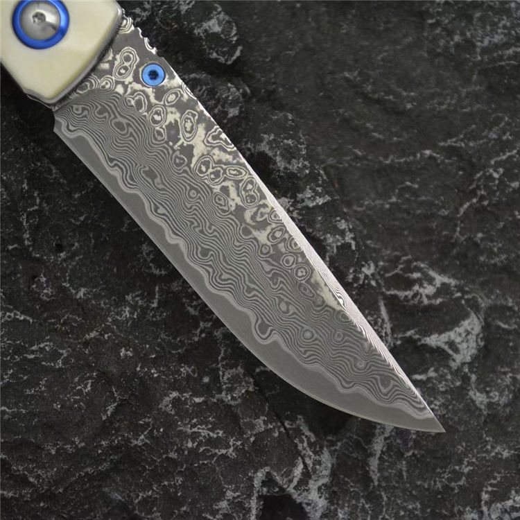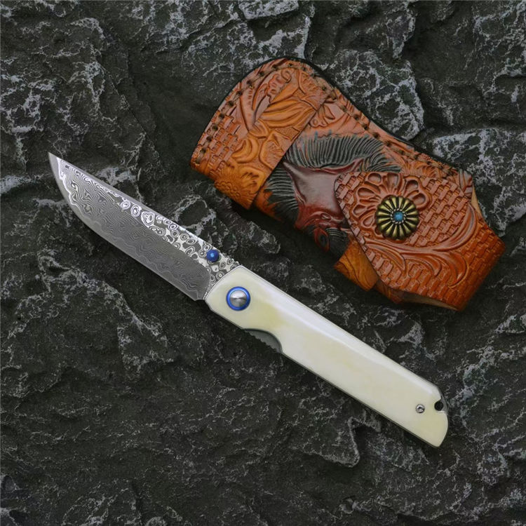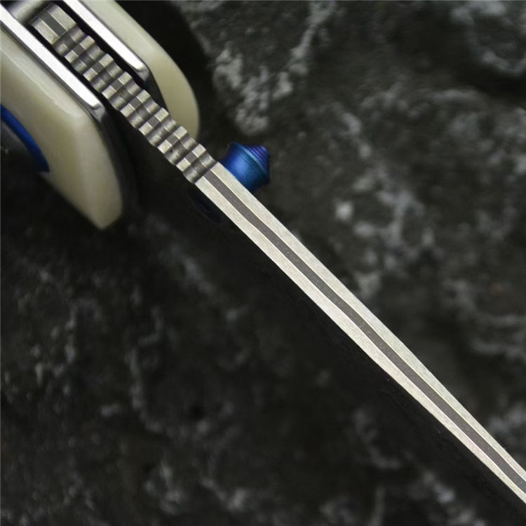 大马士革斩折刀 全长:20.5cm 刃长:8.5cm 刃宽:2.2cm 刃厚:3mm 柄长:112mm 刃材:大马士革钢76层 硬度:59HRC 重量:119.6g(单刀) 包装:黑色礼品盒
