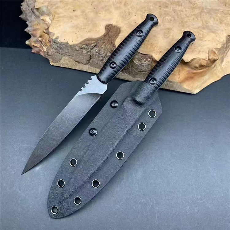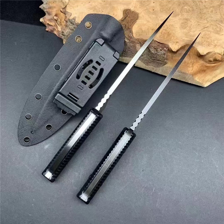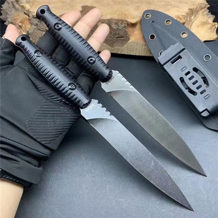 飞羚直刀 全长:229mm 刃长:120mm 柄长:94mm 刃宽:22mm最宽处 刃厚:4.8mm 刃材:DC53钢 热处理:真空深冷高温热处理 刀重:135g/200g含鞘 硬度:59-60HRC 表面:手工精细砂光、沧桑石洗,两种颜色可选 柄材:黑色G10手柄 结构:一体龙骨成型 刀套:战术K鞘 包装:黑盒子