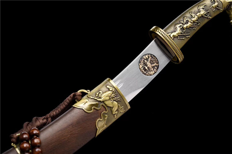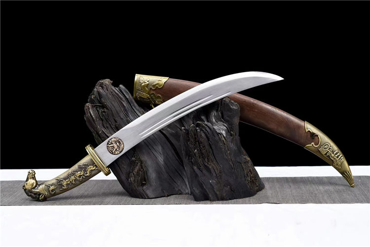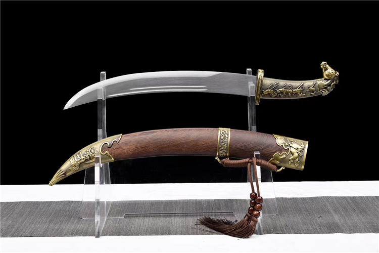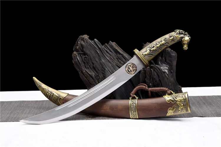 花梨木短款蒙古刀 刃材:极限锰钢手工锻打、双血槽设计、刃身采用纯手工镶嵌纯铜雕浮龙工艺⚠在高性能锰钢上镶嵌 难度系数极高 龙泉独家工艺、纯手工精细研磨工艺 装具:黄古铜蒙古刀装具 柄材:一体金属柄 鞘材:优质海南黄花梨 工艺:刀身千锤百炼、经打胚、热锻、铲、锉、磨、热处理(淬火)回火、初修、精修、等龙泉古法数十道手工制作而成