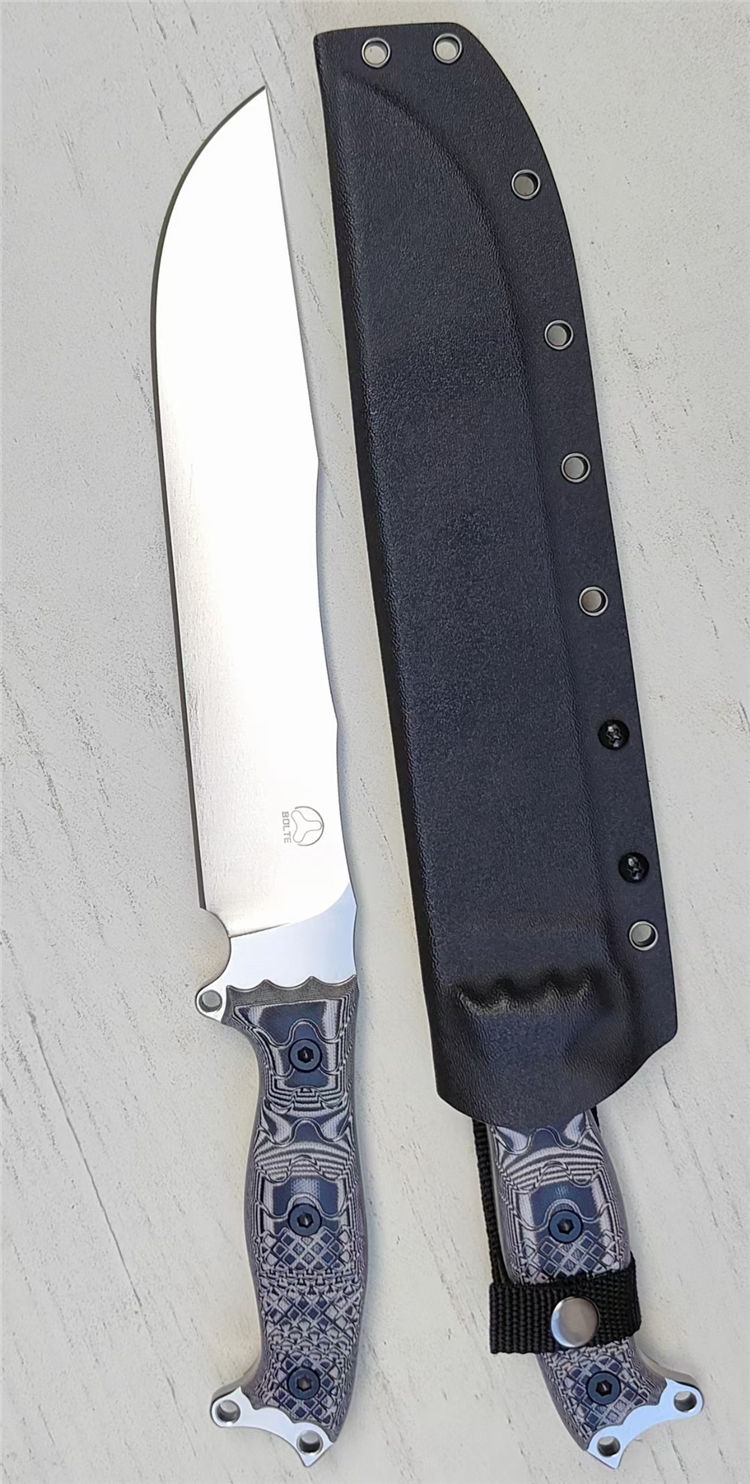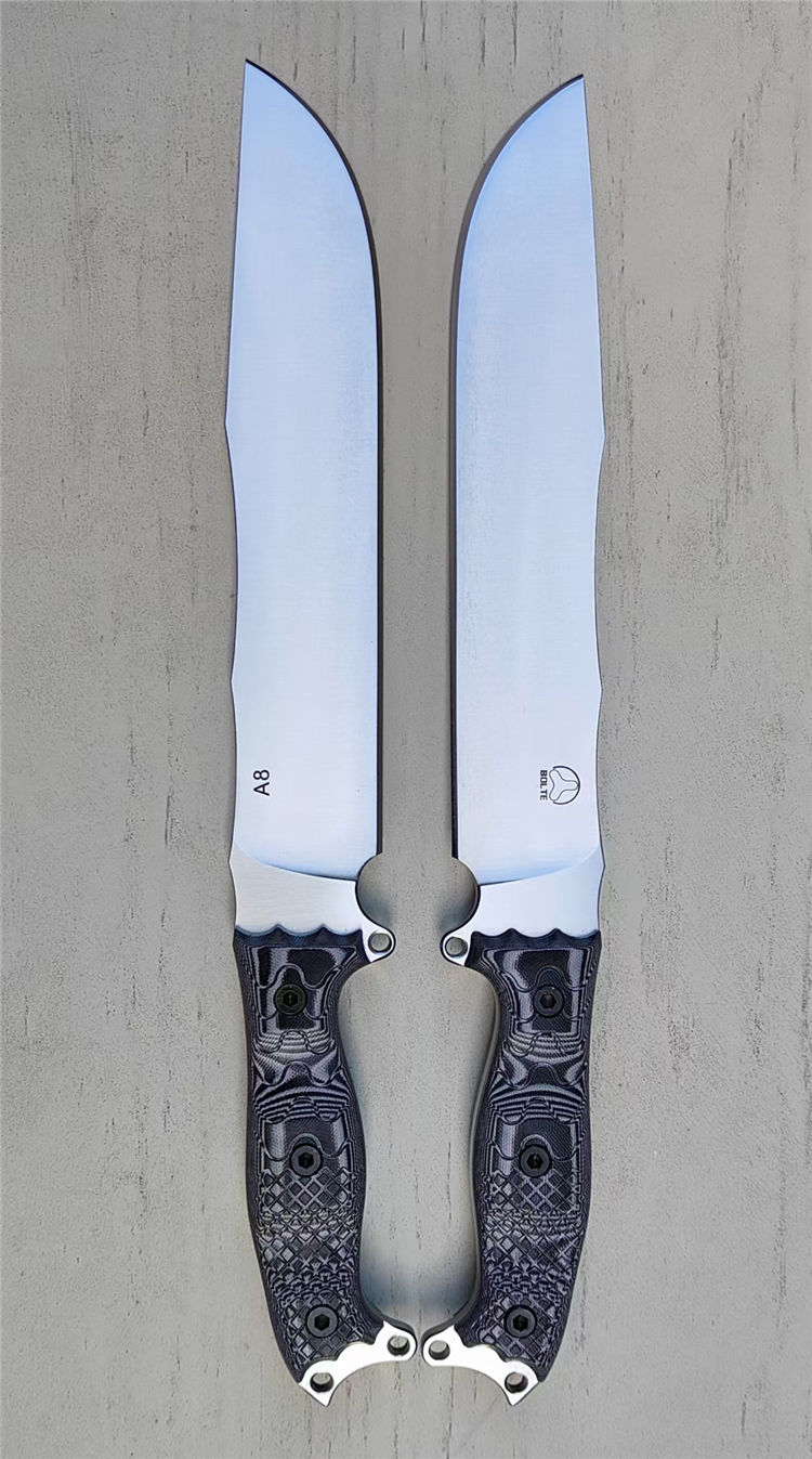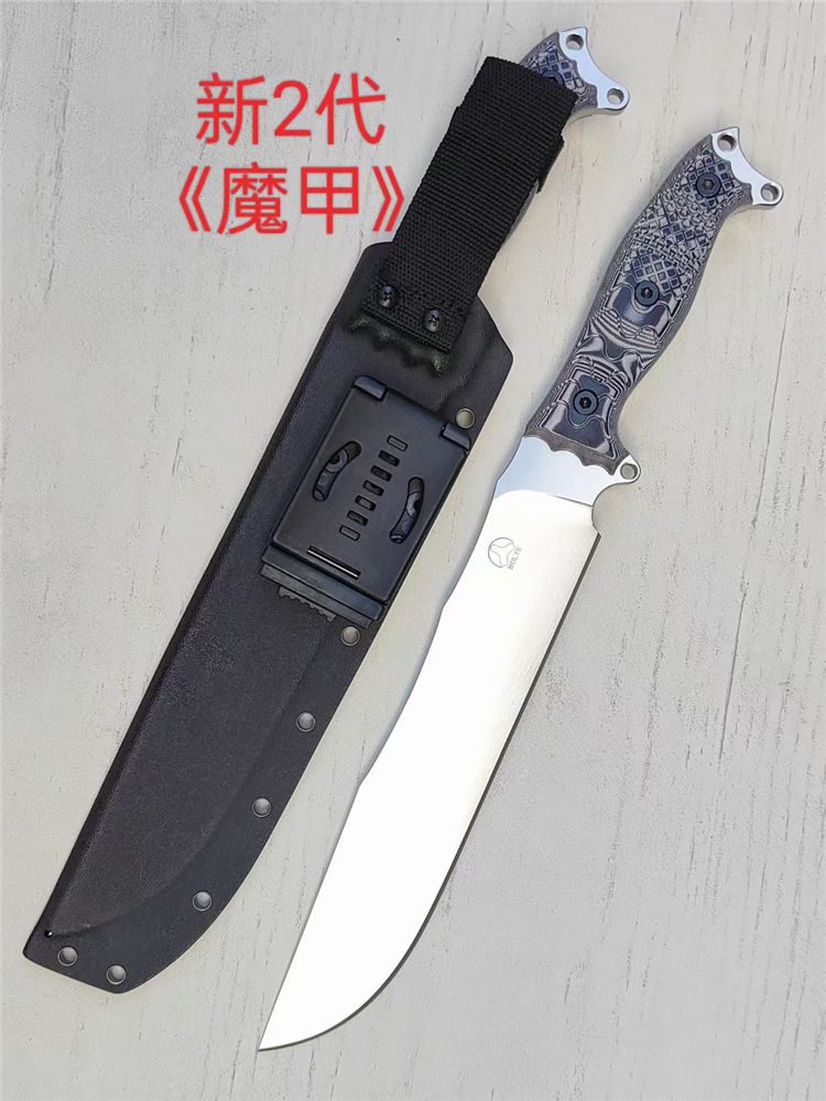 博尔特魔甲Ⅱ直刀 全长:415MM 刃长:269MM 柄长:145MM 刃宽:50MM 刃厚:6.8MM 刃面:精细幼砂光钢本色 类型:以锋利度,重砍度,韧性保持度最出色,防锈性能更佳 开刃:数控V磨,二次开刃 刃材:A8 钢(线切割开料) 热处理:真空油淬深冷热处理+两次回火处理,使钢材韧性,保持性更佳 硬度:60HRC 柄材:灰黑G10+螺丝钉,一体全柄,CNC成型防滑纹,手感更舒适,性能更强悍 包装:精美牛卡飞机盒 净重:680克 刀鞘:进口 2.0K板鞘+背夹+尼布带扣