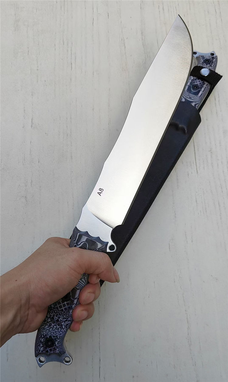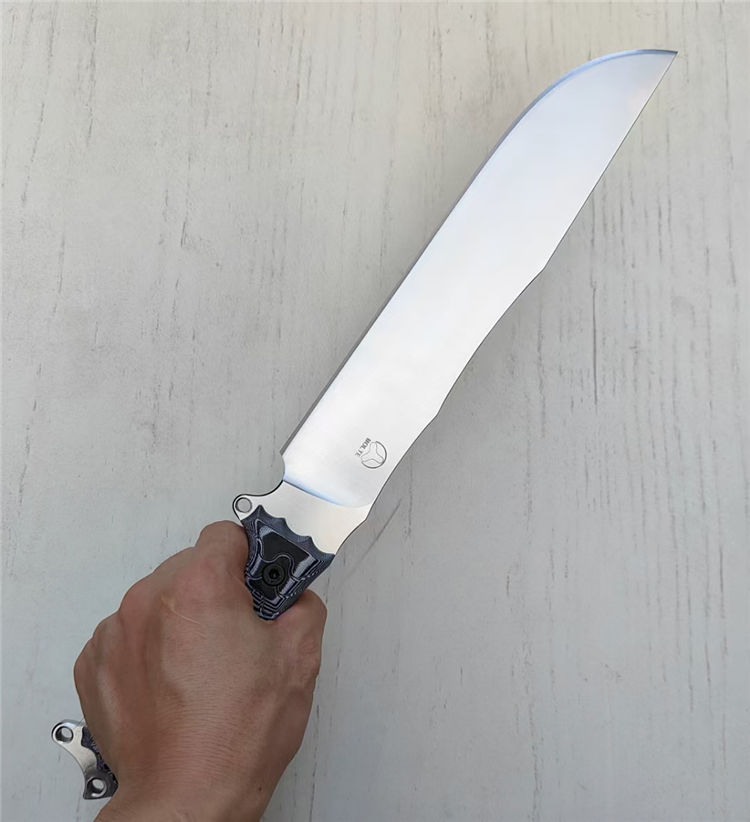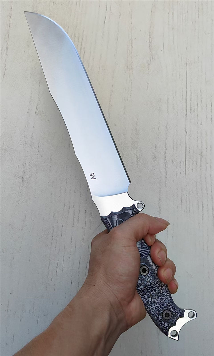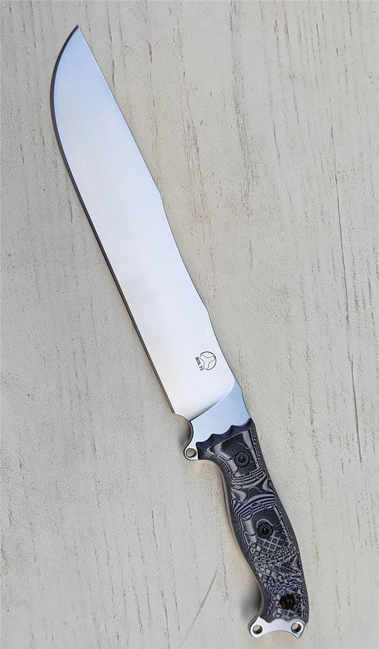 博尔特魔甲Ⅱ直刀 全长:415MM 刃长:269MM 柄长:145MM 刃宽:50MM 刃厚:6.8MM 刃面:精细幼砂光钢本色 类型:以锋利度,重砍度,韧性保持度最出色,防锈性能更佳 开刃:数控V磨,二次开刃 刃材:A8 钢(线切割开料) 热处理:真空油淬深冷热处理+两次回火处理,使钢材韧性,保持性更佳 硬度:60HRC 柄材:灰黑G10+螺丝钉,一体全柄,CNC成型防滑纹,手感更舒适,性能更强悍 包装:精美牛卡飞机盒 净重:680克 刀鞘:进口 2.0K板鞘+背夹+尼布带扣