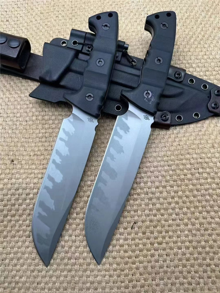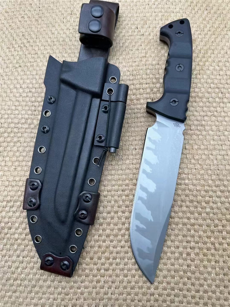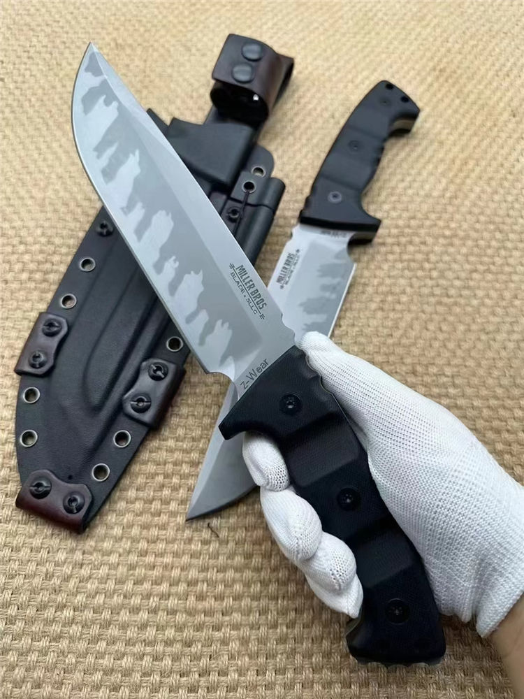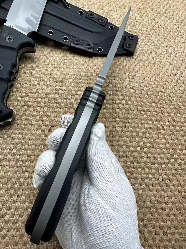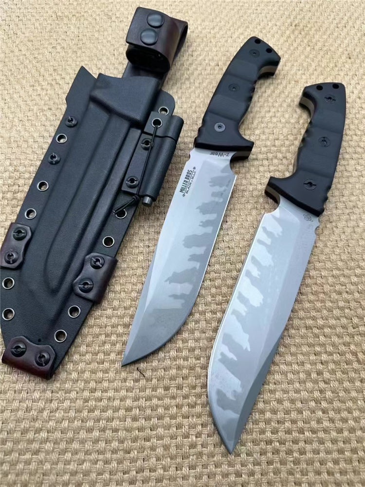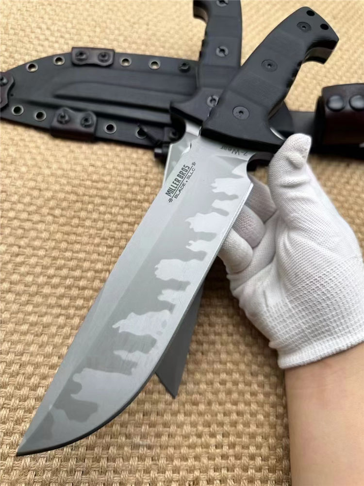 米勒兄弟定制版M33直刀 全长:32cm 刃长:18cm开刃部分 柄长:14cm 刃厚:0.8cm 刃宽:4.4cm 刀重:633(单刀)906g(加套) 钢材:Z-wear 柄材:G10 硬度:62-63HRC LOGO:CNC精雕 包装:黑色手工盒子 刀鞘:手工进口K版鞘+意大利进口植鞣皮手工制作