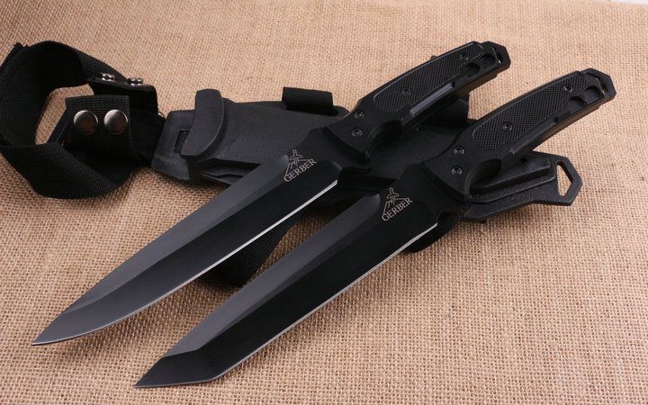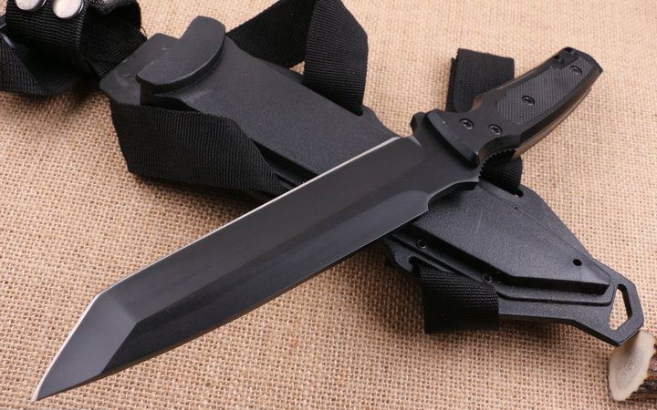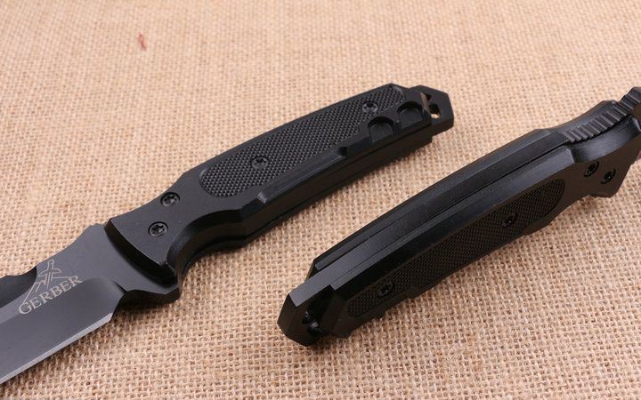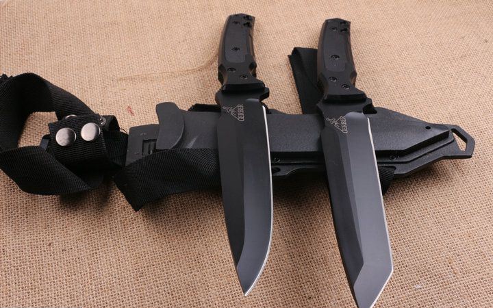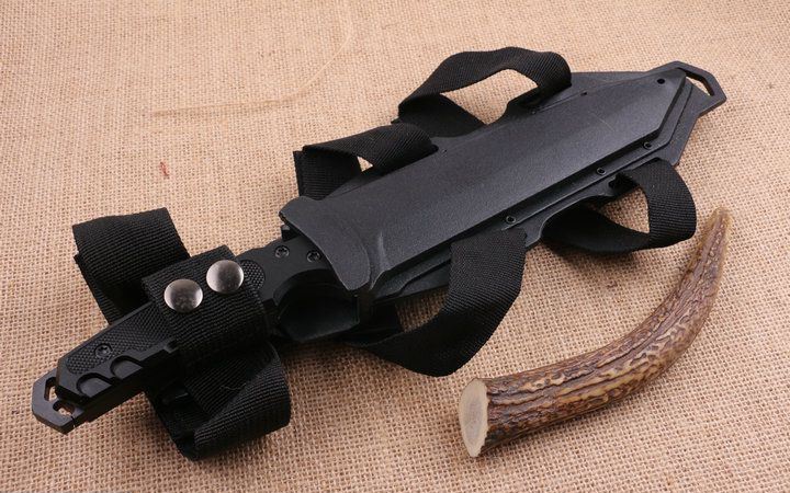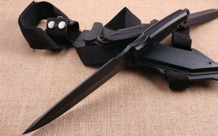 超精仿-戈博1406战术直刀(尖头) 全长:34cm 刃长:20cm 刃厚:6.2mm 刃材:5CR15MOV 刀重:490g 总重:710g 表面:发黑,尖头和平头两款,下单注明 硬度:58-60HRC 柄材:加厚铝材 包装:玻纤刀套