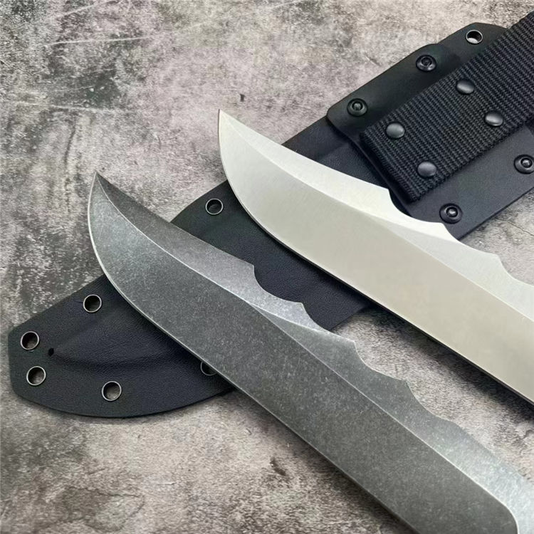 DC53金刚侠直刀 全长:340mm 刃长:215mm 柄长:116mm 刃宽:42mm最宽处 刃厚:6mm 刃材:DC53钢 热处理:真空深冷高温热处理 刀重:490g/635g含鞘 硬度:59-60HRC 表面:手工精细砂光、沧桑,石洗,两种颜色可选 柄材:黑色G10手柄CNC精雕防滑纹 结构:一体龙骨成型 刀套:战术K鞘+真皮+尼龙织带 包装:黑盒子