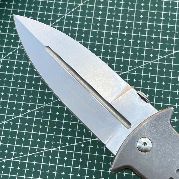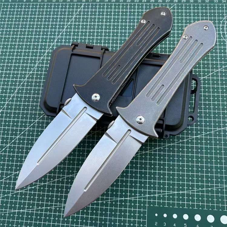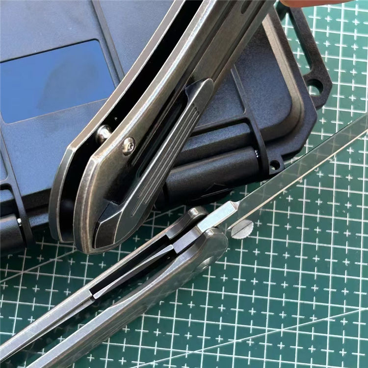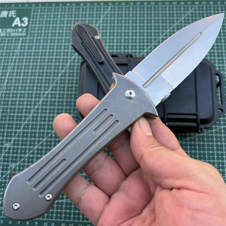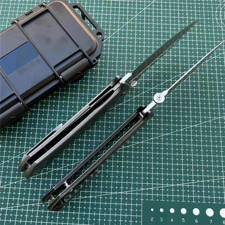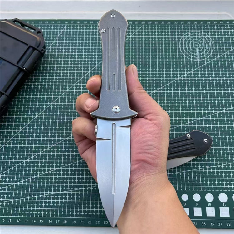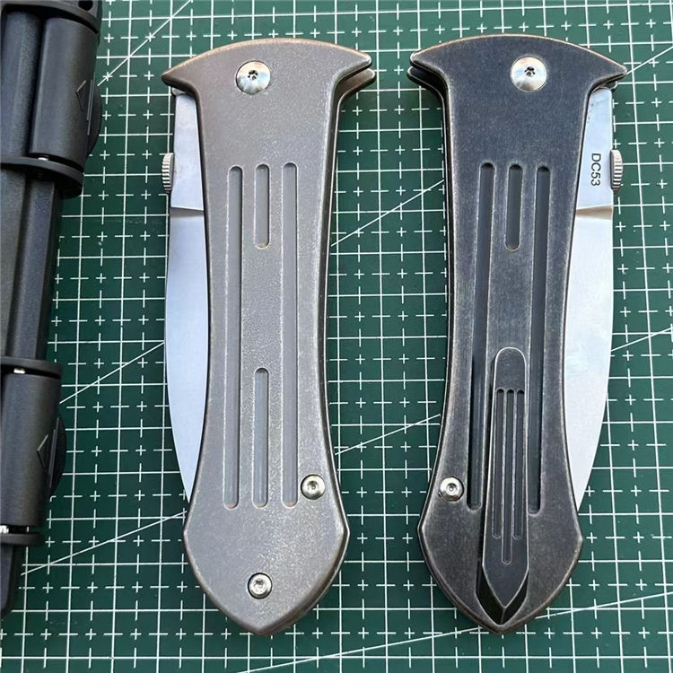 DC53大剑型折刀 全长:23.3cm 刃长:9.8cm 柄长:13cm 刃厚:4.2mm 刃宽:3.5cm 刃材:进口DC53 硬度:60HRC 柄材:TC4钛合金(镀钛石洗做旧处理) 背夹:TC4钛合金 系统:滚珠轴承 包装:防水盒 刀重:215克