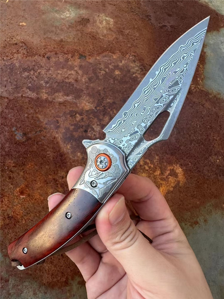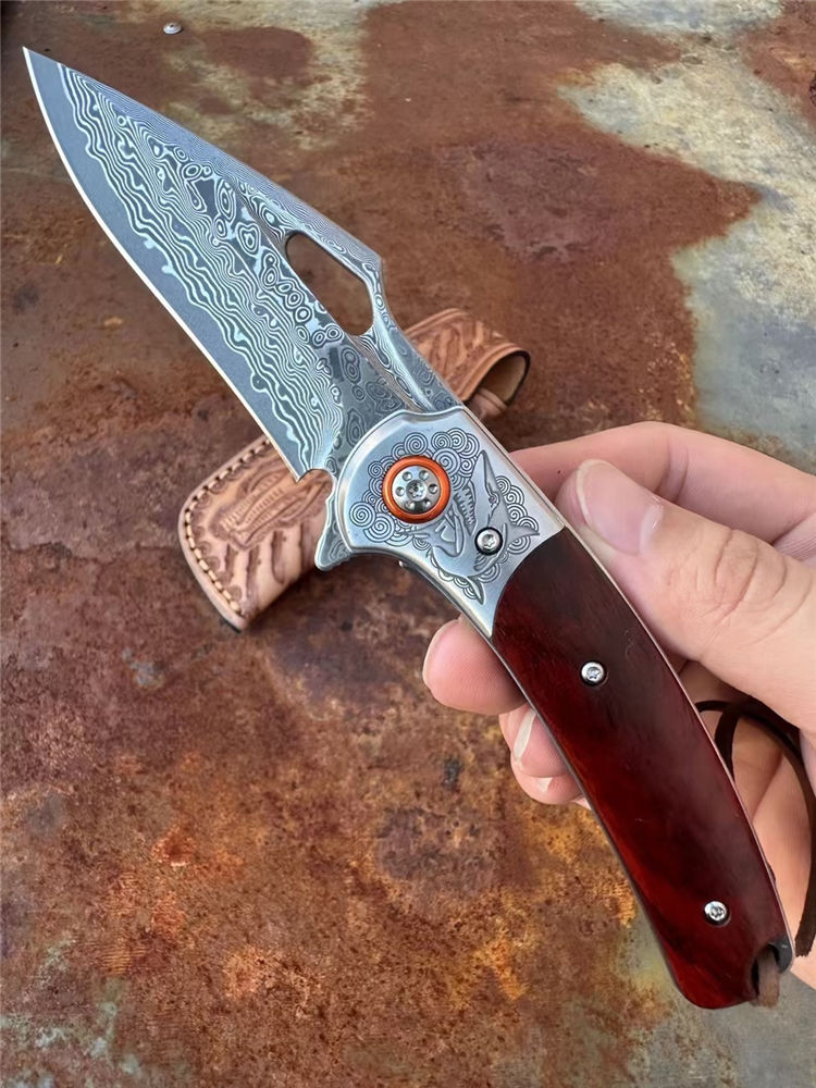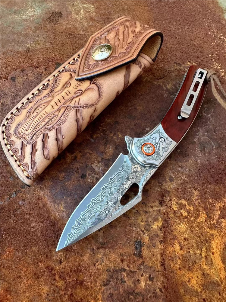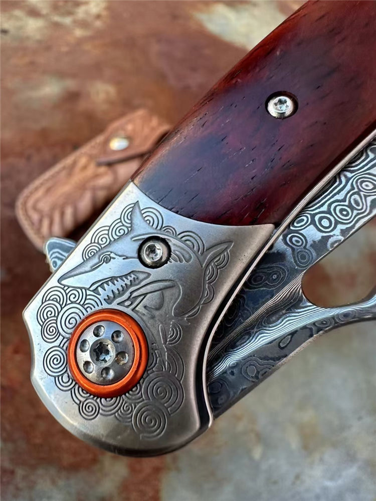 大马士革大白鲨折刀 总长:18.2cm 刀片:8.2cm 手柄:10cm 刃厚:3mm 刃宽:2.9cm 钢材:锻造大马士革钢(78层) 硬度:60HRC 柄材:钢头雕刻+老料黄檀木 内置:滚珠轴承 重量:133g 皮套:意大利植鞣皮手工刀套 包装:黑色手工盒