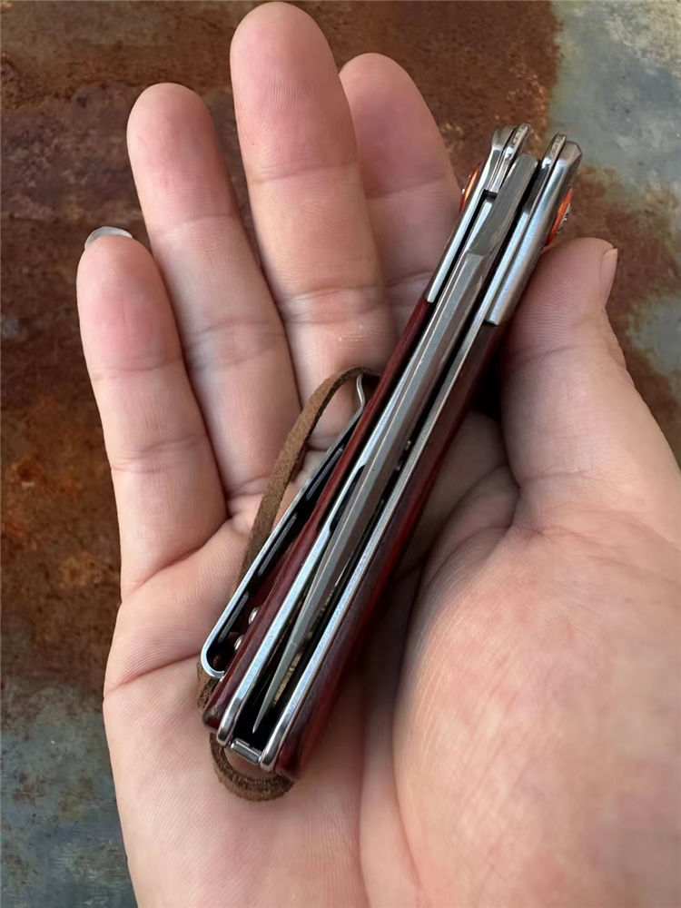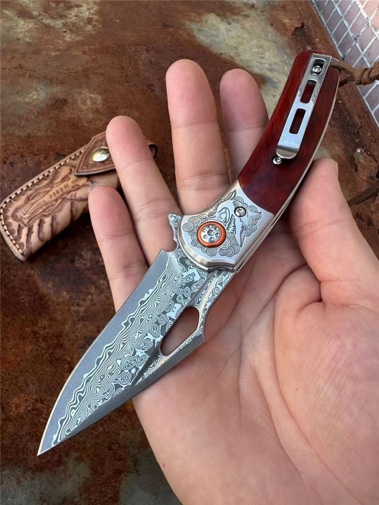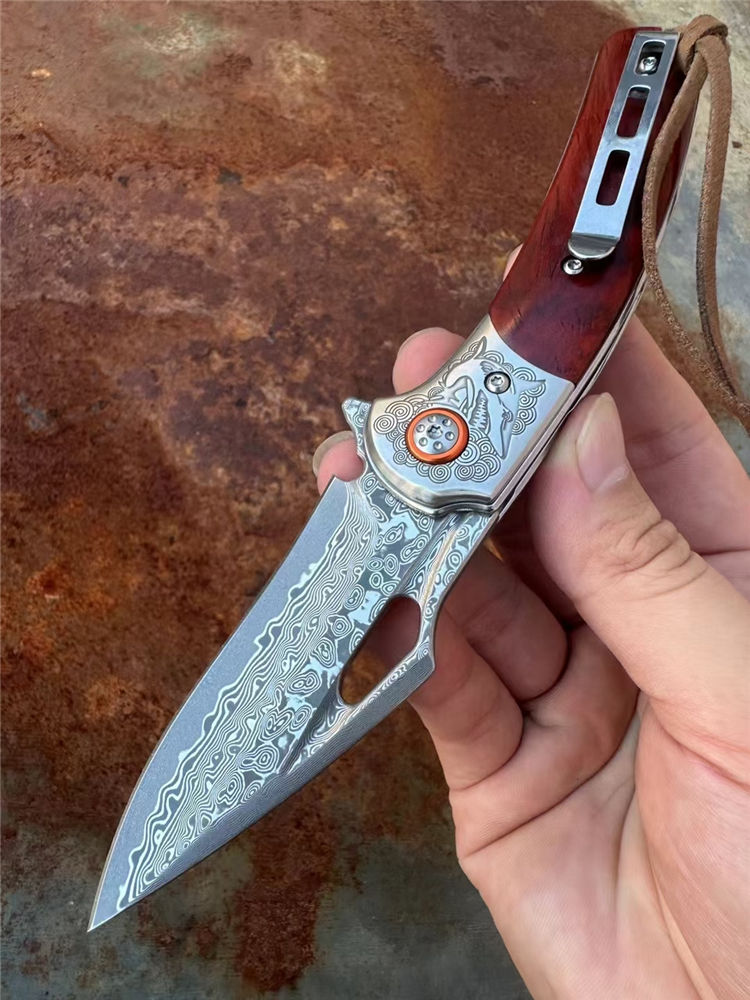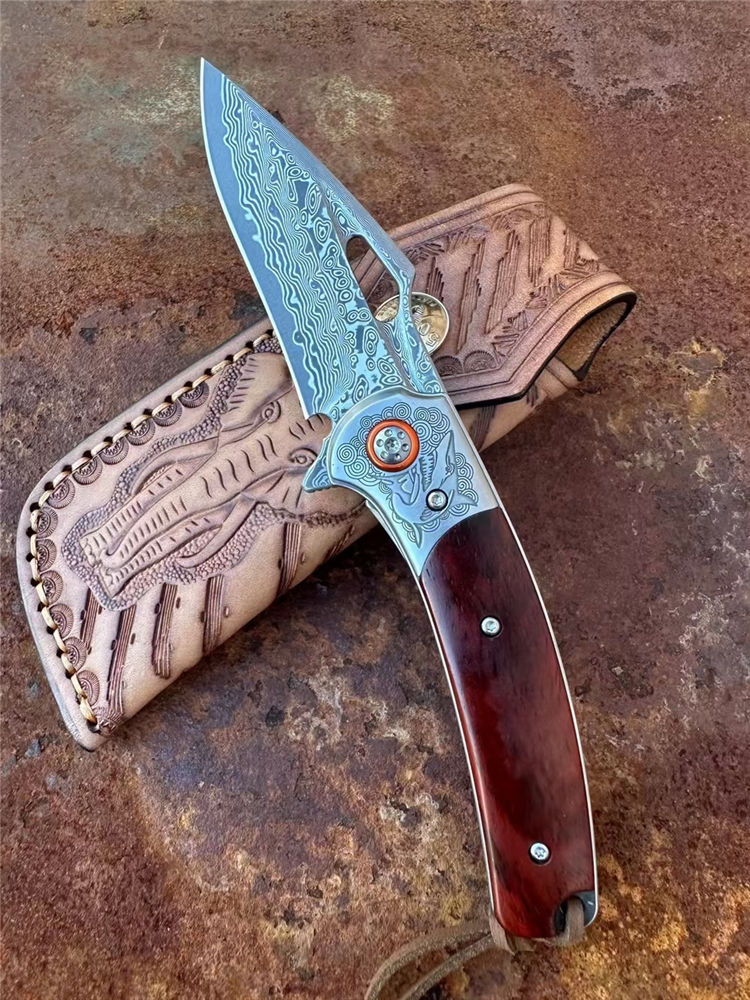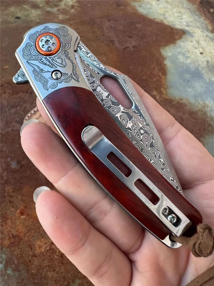 大马士革大白鲨折刀 总长:18.2cm 刀片:8.2cm 手柄:10cm 刃厚:3mm 刃宽:2.9cm 钢材:锻造大马士革钢(78层) 硬度:60HRC 柄材:钢头雕刻+老料黄檀木 内置:滚珠轴承 重量:133g 皮套:意大利植鞣皮手工刀套 包装:黑色手工盒
