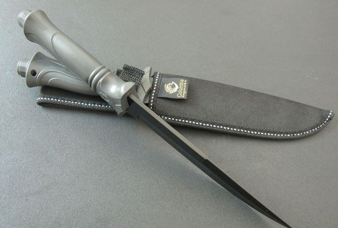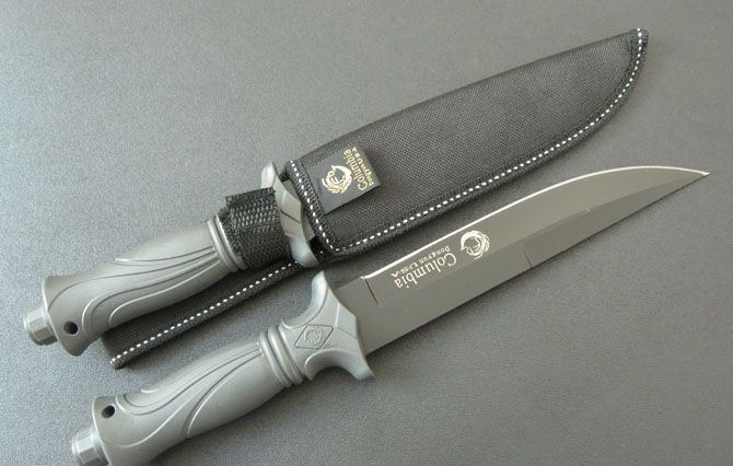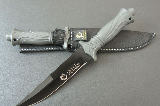 哥伦比亚.营地战刀2号 全 长:29.8cm 刃 长:16.0cm 柄 长:13.0cm 刃 厚:3.4mm 刃 材:440 硬 度:56HRC 刀 柄:橡塑手柄,手感非常好 表 面:发黑 重 量:140.0克 备 注:带尼龙套