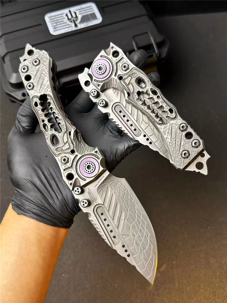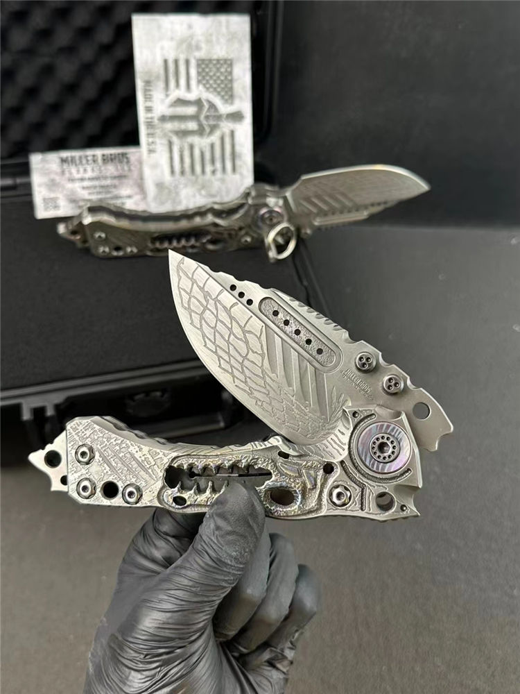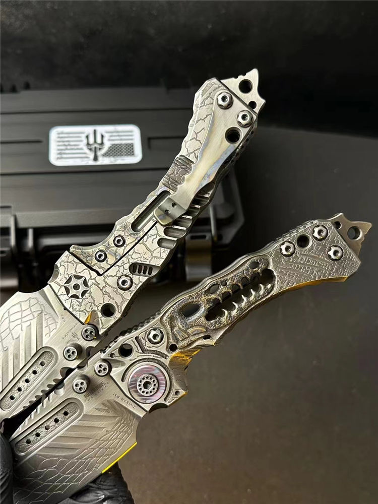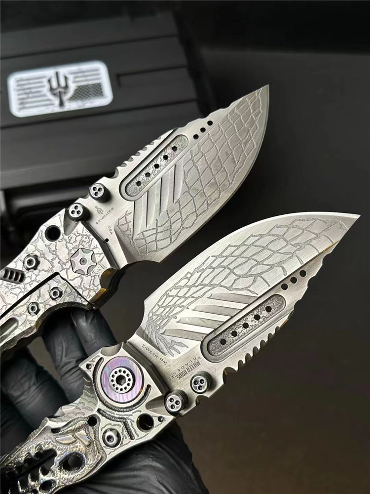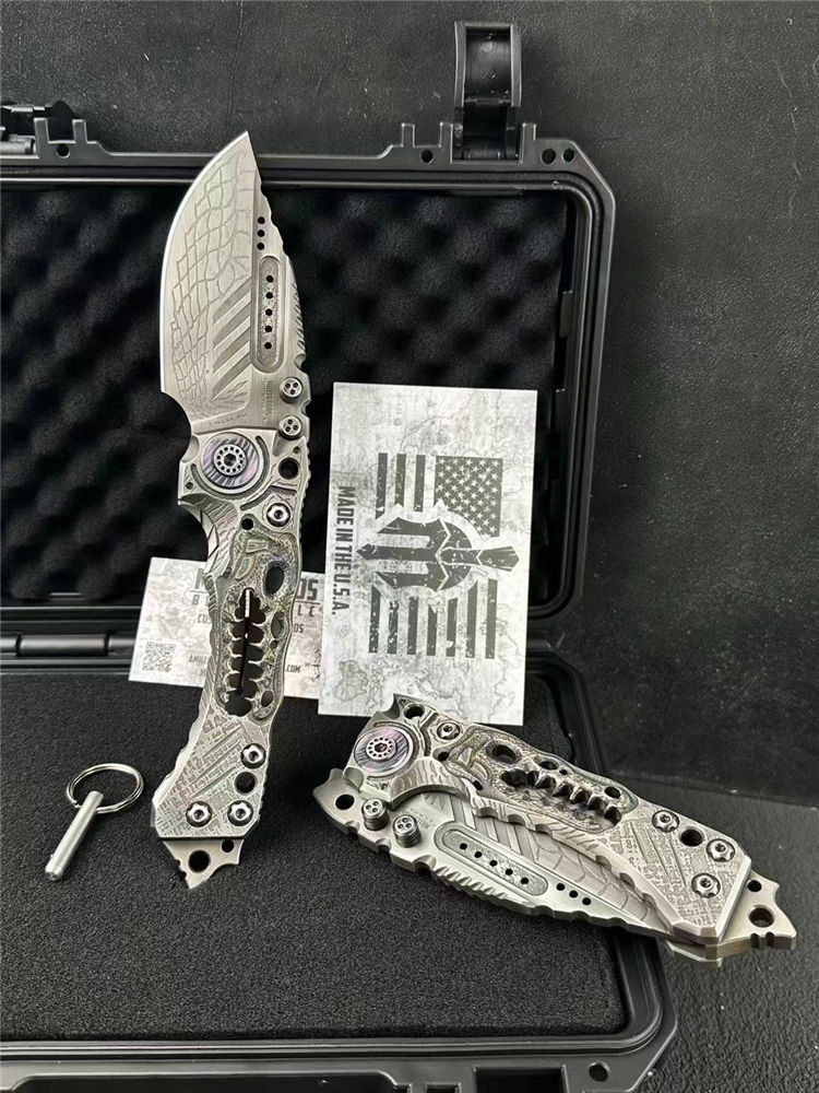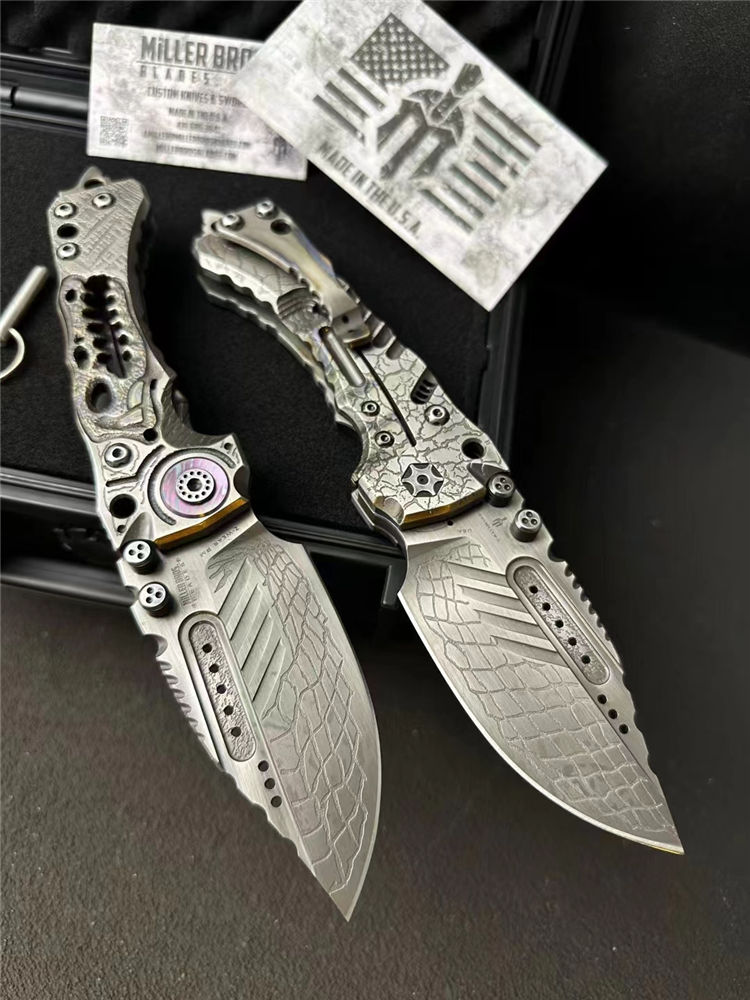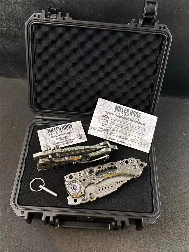 米勒T1侏罗纪折刀 总长:25.5cm 刀刃:10.5cm 手柄:15cm 厚度:6.5MM 宽度:4.7cm 钢材:Z-Wear粉末钢 硬度:63HRC 刀柄:TC4钛合金 +CNC 刀夹:TC4钛合金手工 重量:455g 表面:镀钛发黑石洗做旧 包装:刀具证书+高端防水盒
