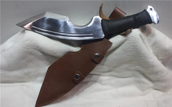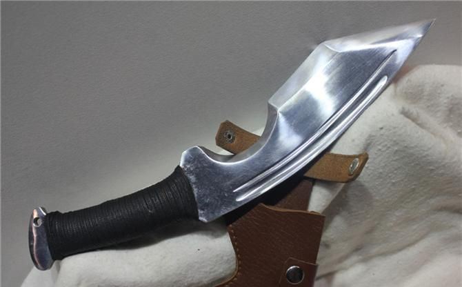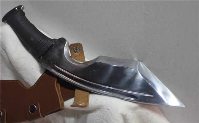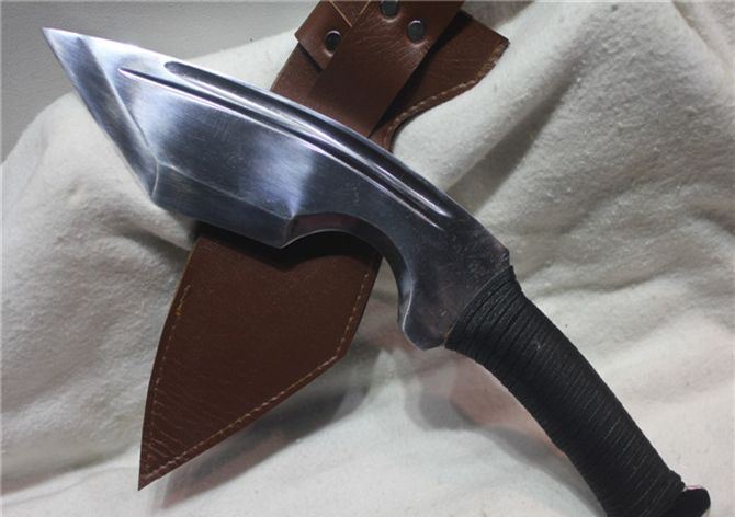 TL005高猛钢手工弧形霸气狗腿 全长:30 cm 刃长:20 cm 柄长:10 cm 刃宽:6 材质;高锰钢 硬度区间:60HRC 性能:全开锋,削纸断竹砍铁 备注:手工产品存在误差,规格仅供参考,请以实物为准!