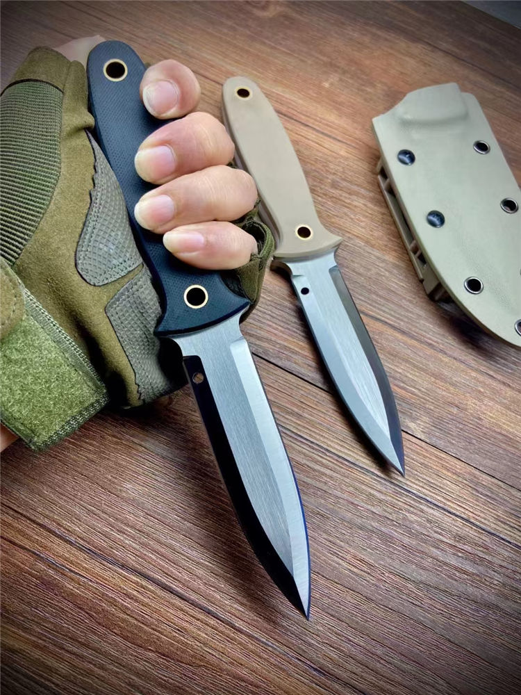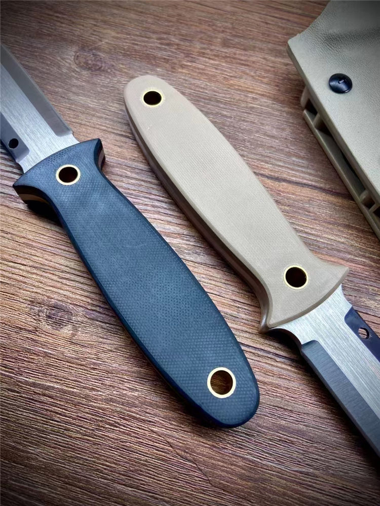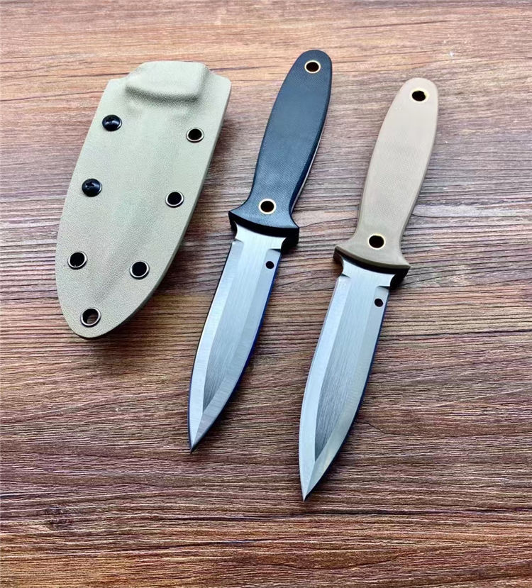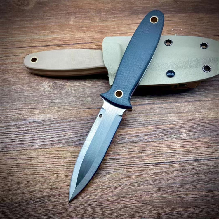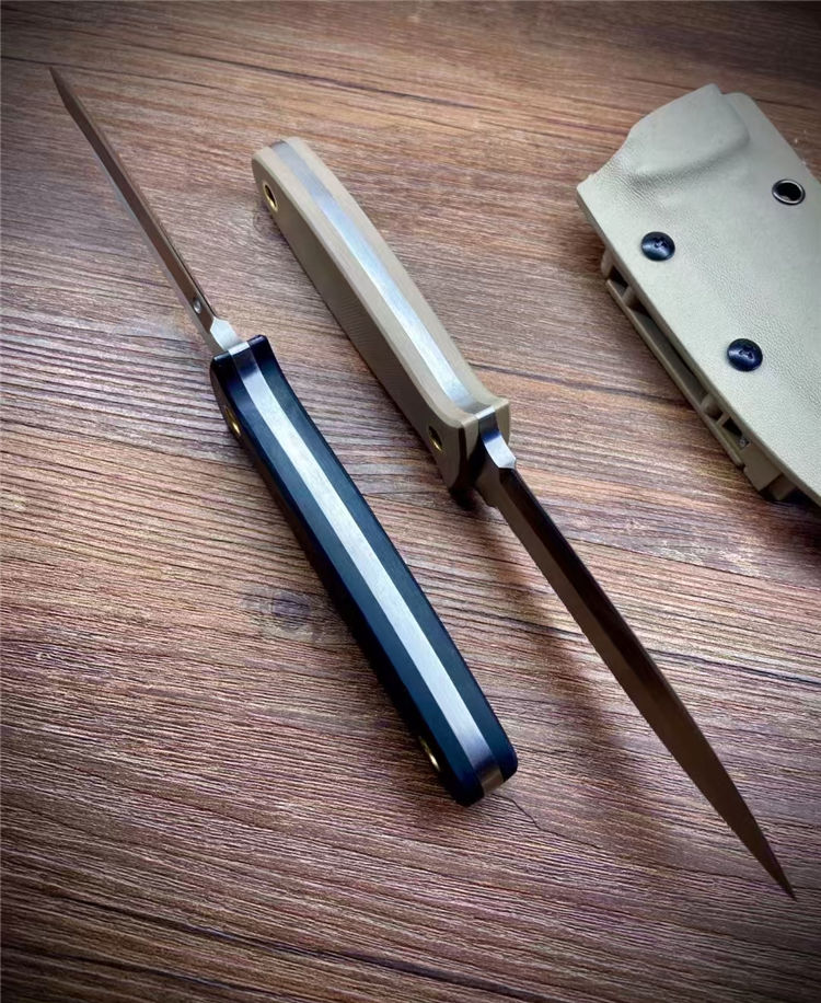 蜘蛛FB47GP双刃直刀 全长:226mm 刃长:110mm 柄长:116mm 钢材:DC53 净重:220克 表面:手工拉丝效果 柄材:沙色G10➕黑色G10 热处理:真空热处理 刀鞘:沙色鞘➕黑色鞘➕夹子 包装:精美包装
