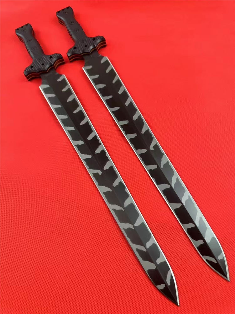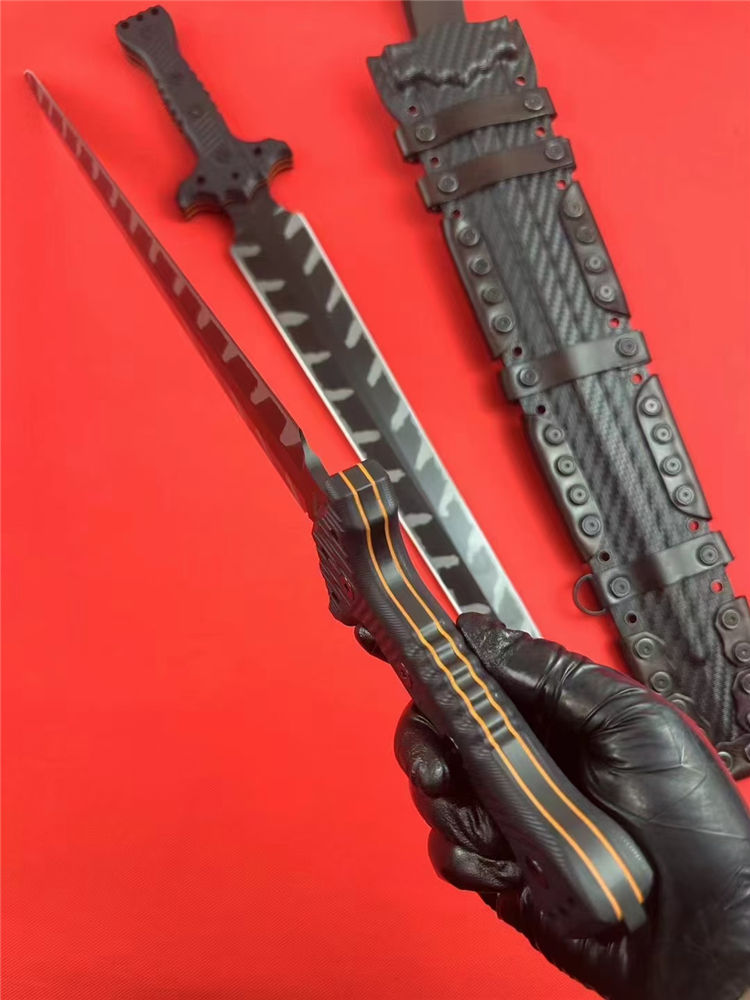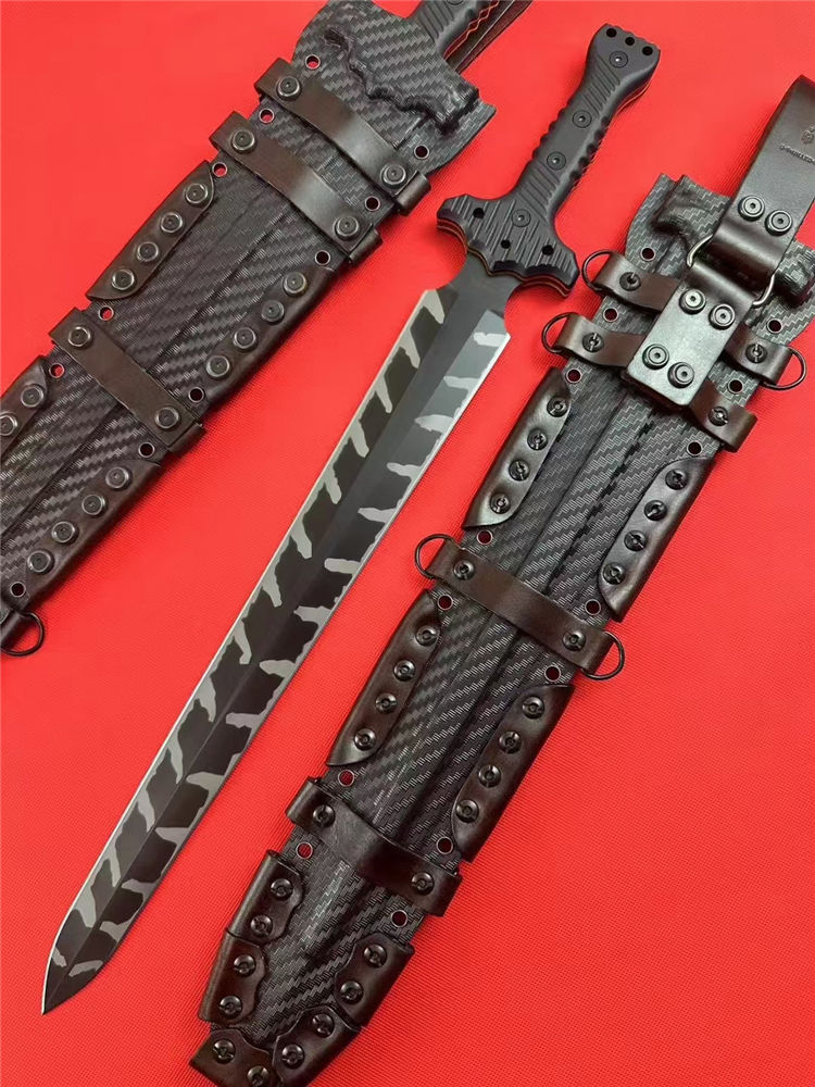 米勒m18罗马剑直刀 全长:600mm 刃长:440mm 柄长:160mm 刃宽:53mm 刃厚:5.8mm 刃材:DC53钢 刀重:900g 毛重:1480 (含鞘) 硬度:60+HRC 热处理:专业真空深冷让处理油淬二次 表面:真空镀钛虎纹 柄材:进口双色G10 结构:一体龙骨成形 配套:进口K鞘+进口意大利手工制作植鞣皮