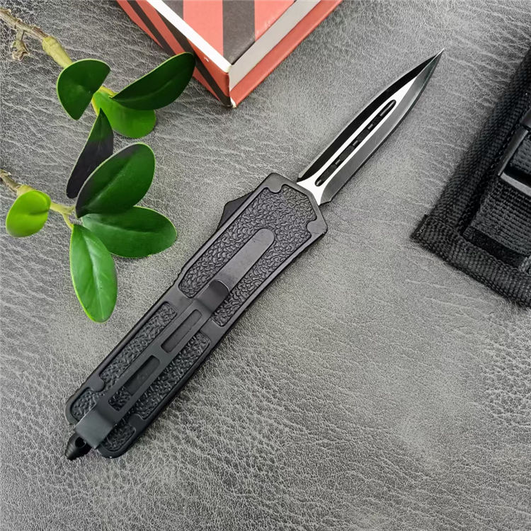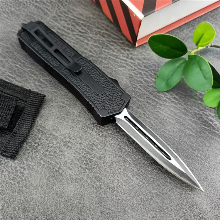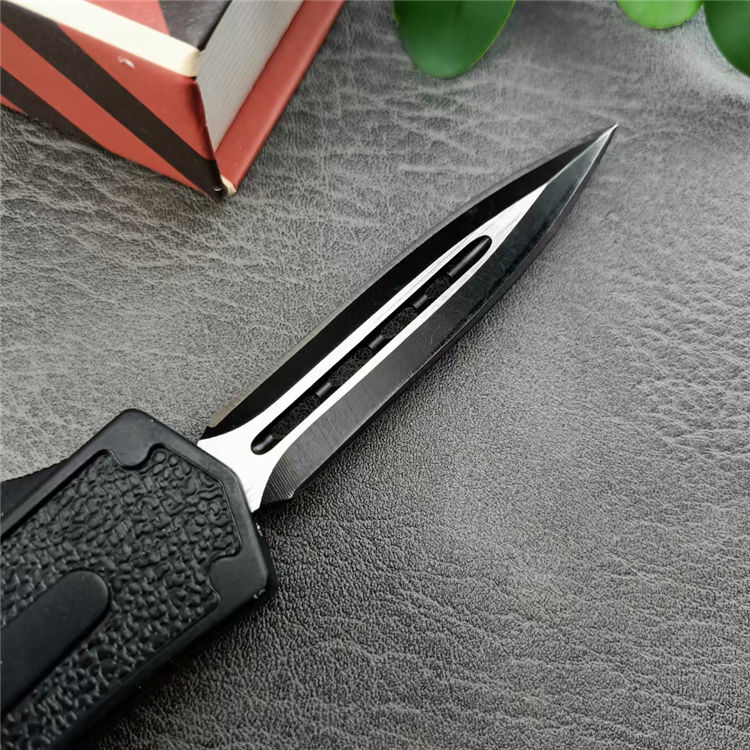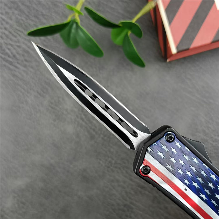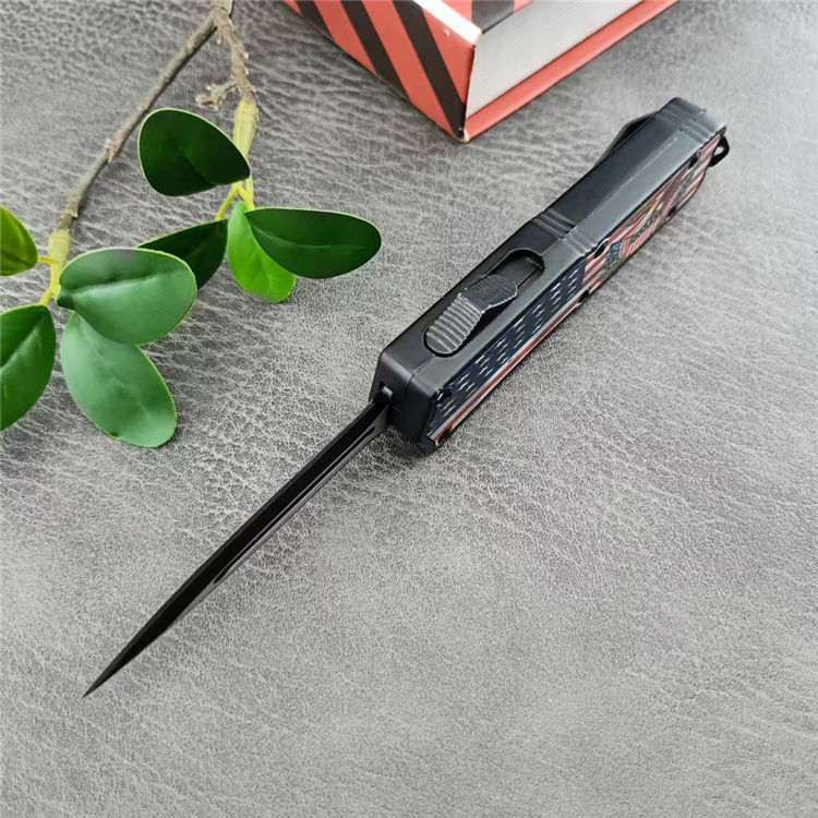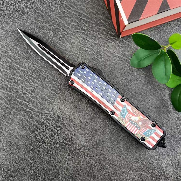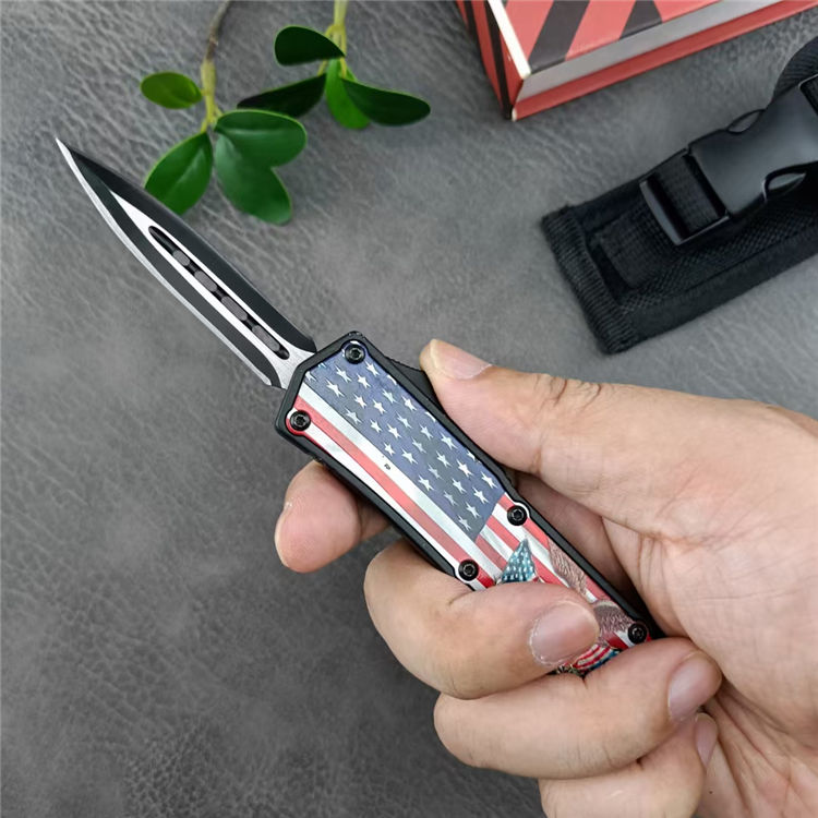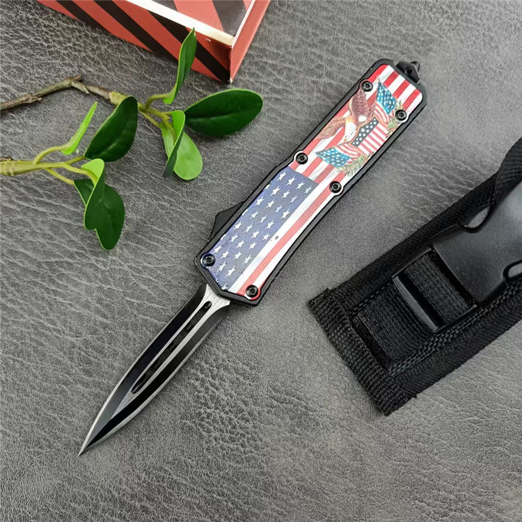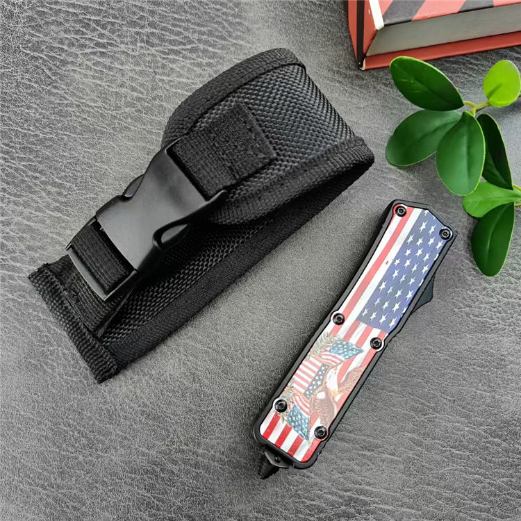 美国飞鹰直出跳刀 总长:17.5cm 刃长:6.6cm 刃宽:1.3cm 刃厚:2.5mm 刃材:440c 柄材:锌合金 柄长:10.8cm 柄宽:2.8cm 柄厚:12.6mm 重量:152G 刀鞘:尼龙鞘
