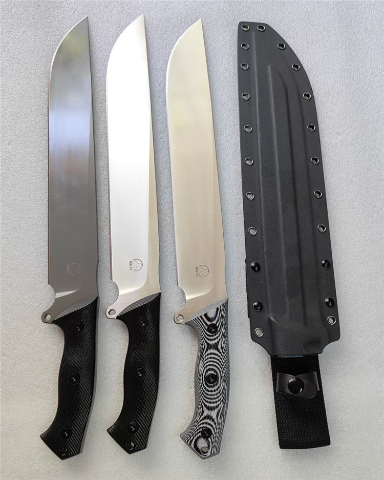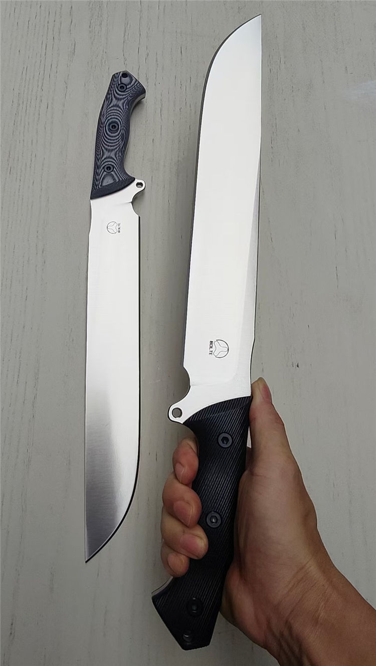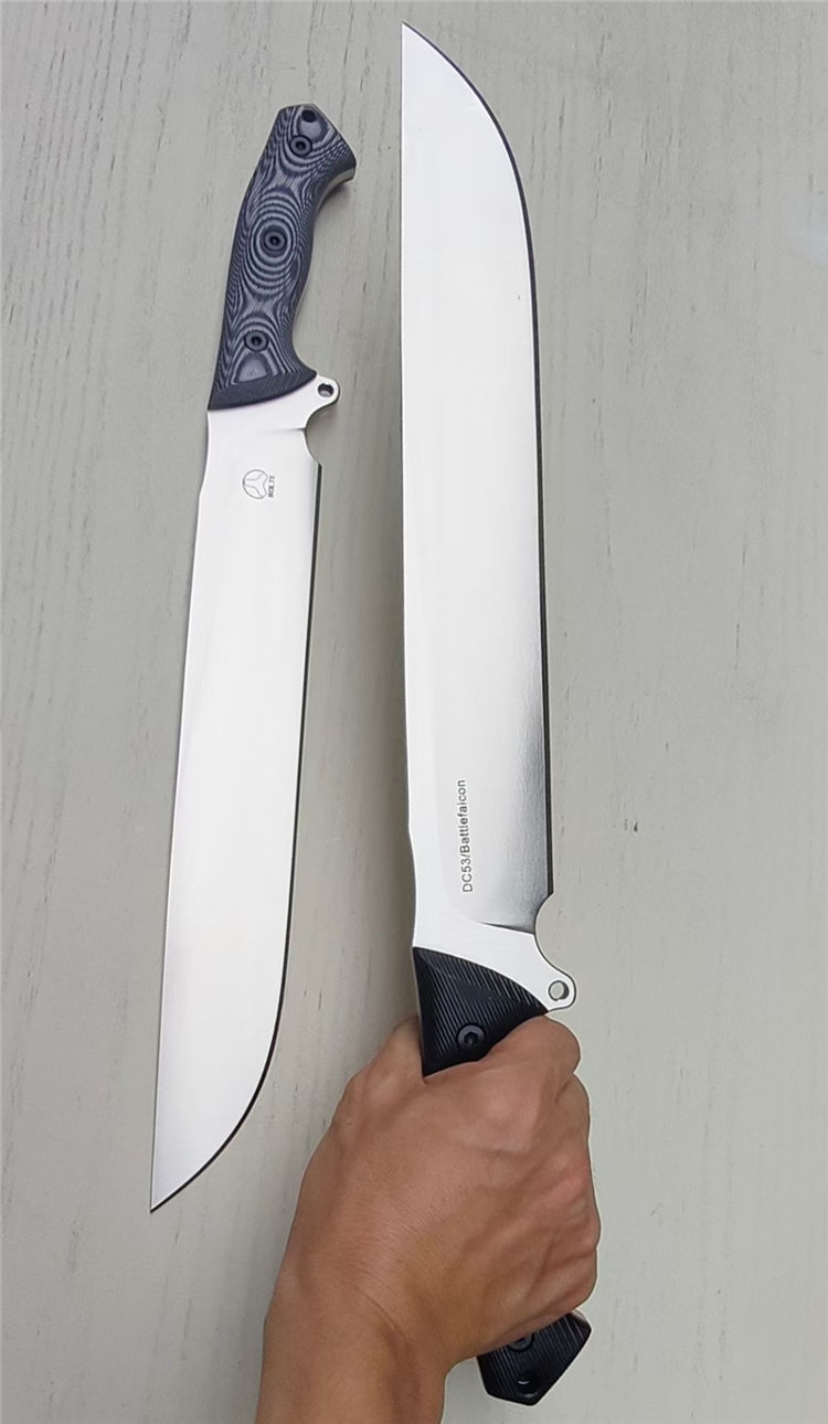 博尔特战隼直刀 全长:481mm 刃长:329mm 柄长:152mm 刃宽:51.5mm 刃厚:5.8-5.9mm之间 刃面:精细幼砂光钢本色《限量镀灰钛涂层》 类型:以锋利度,重砍度,韧性保持度最出色 开刃方式:二次开刃 刃材:DC53模具钢 热处理:真空淬油热处理和2次回火处理使钢材韧性保持性更佳 硬度:61+-0.5HRC 柄材:灰黑G10+螺丝钉,一体全柄、握感更舒服、性能更强悍 包装:精美黑纸盒+护刀油+伞绳 净重:760+-10克 刀鞘:配置2.0K鞘+皮扣尼龙带