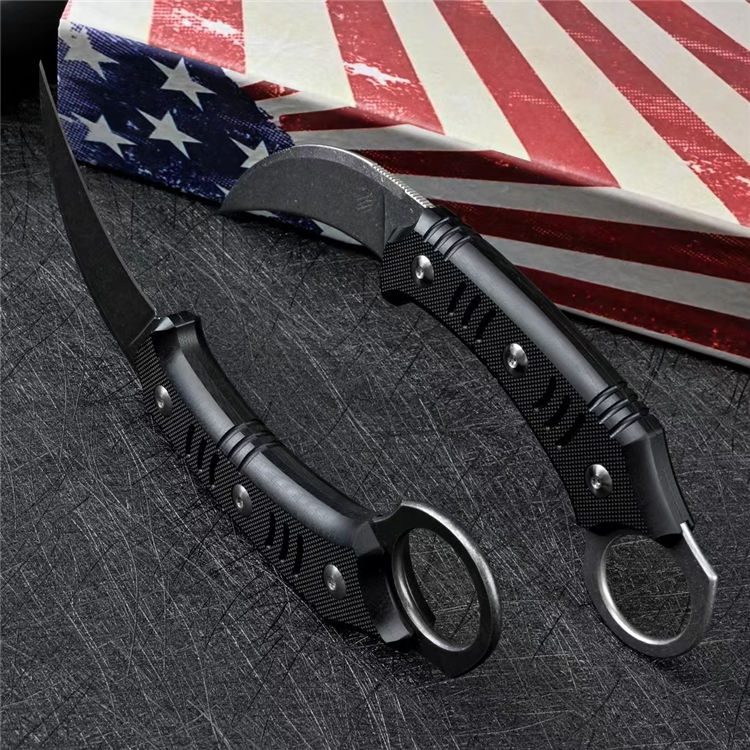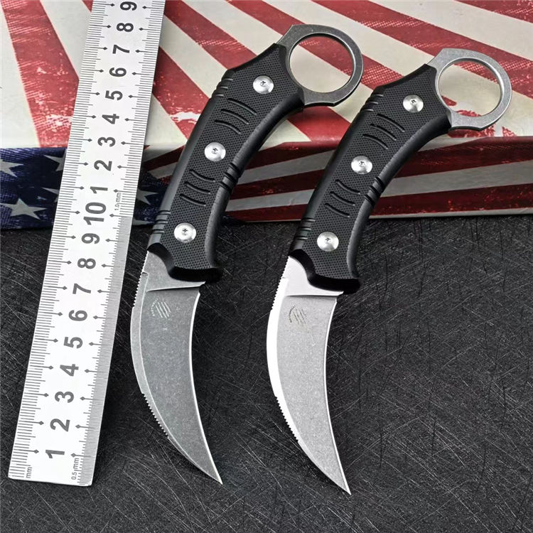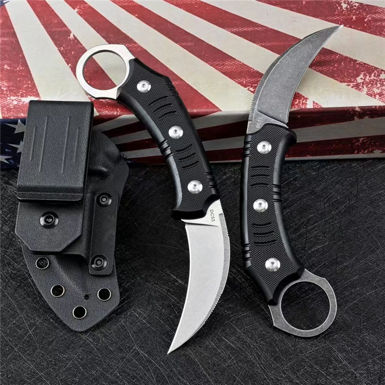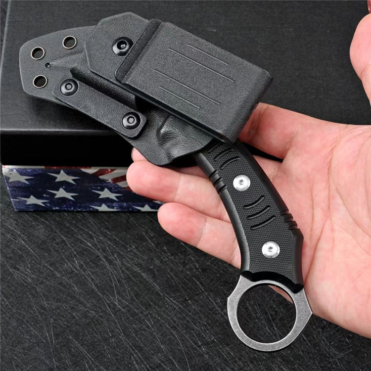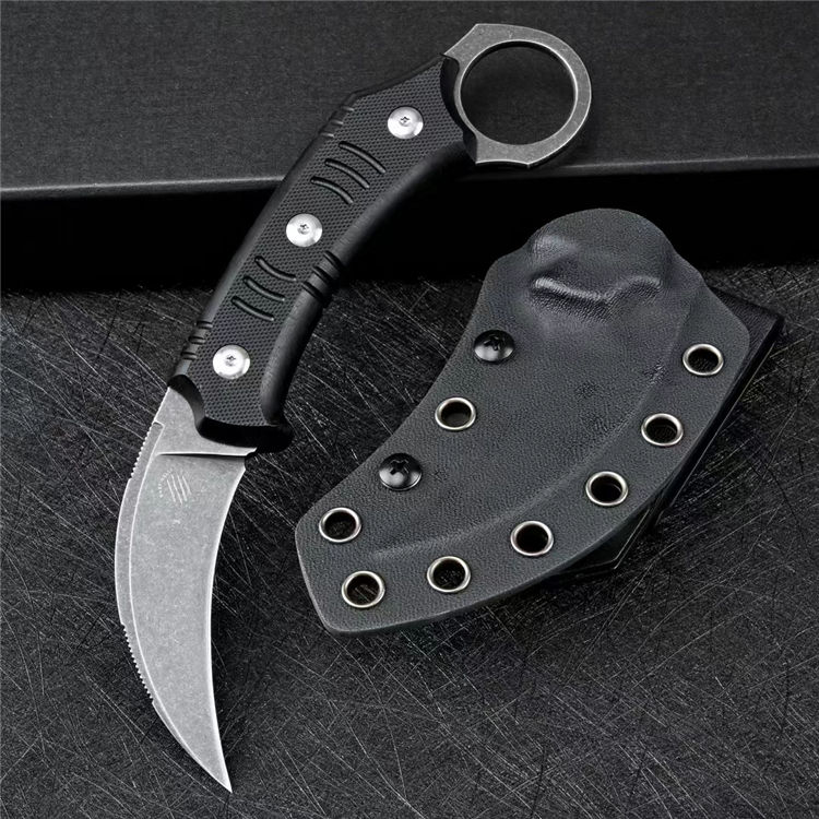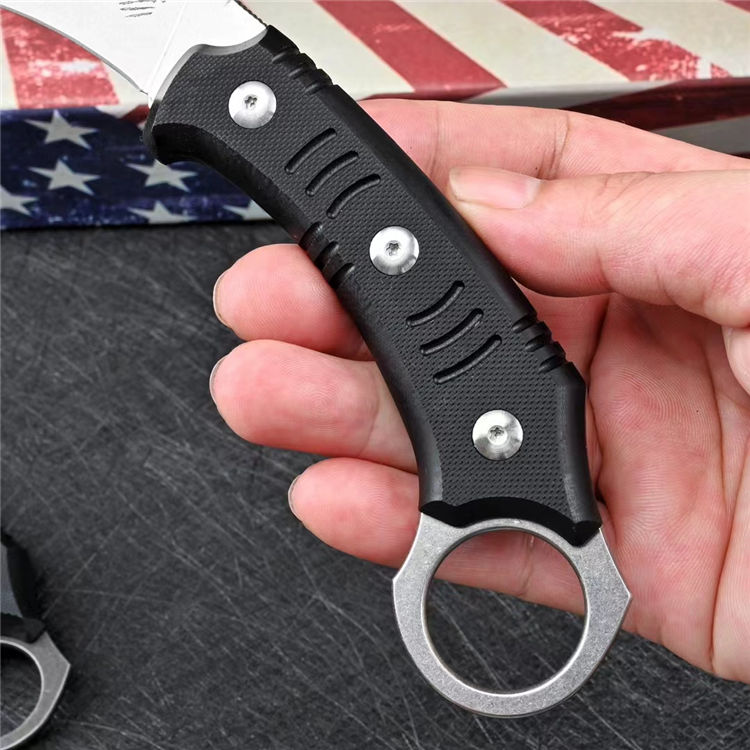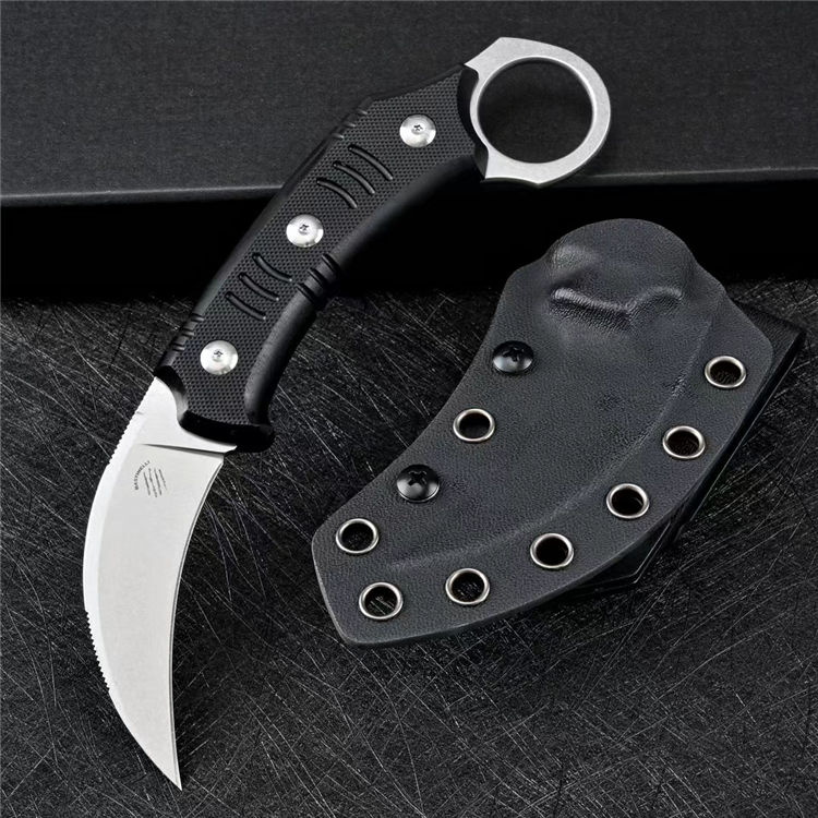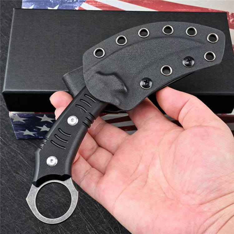 巴斯蒂内利愤怒爪刀 全长:18.5cm 刃长:7cm 柄长:12.2cm 刃厚:0.3cm 刃宽:2.28cm 刀重:122g (单刀),184 g(刀+鞘) 毛重:273g 钢材:DC53 柄材:G10 硬度:60-61HRC 表面:石洗/黑色石洗 包装:礼盒 刀鞘:美板K鞘+360度旋转夹