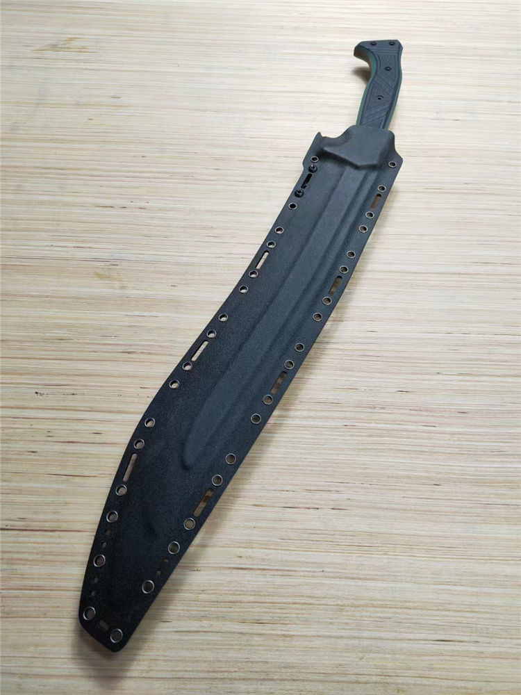 捕食者狗腿开山刀 全长:700mm 刃长:470mm 刃宽:57mm 刃厚:5.8mm 单重:1200g 总重:1500g+- 硬度:60HRC 刃材:5160钢 独家分段热处理一体龙骨设计 柄材:双色G10 表面:进口黑色teflon涂层 刀鞘:进口美标2.0K鞘