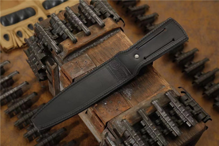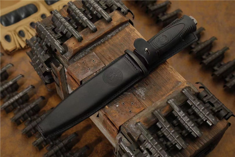 俄罗斯基兹利亚尔连长现役直刀 全长:305mm 刃长:170mm 厚度:4.8mm 硬度:59HRC AUS-8钢全龙骨Elastron手柄 ,凹磨,皮鞘包裹内置PP塑料保护套