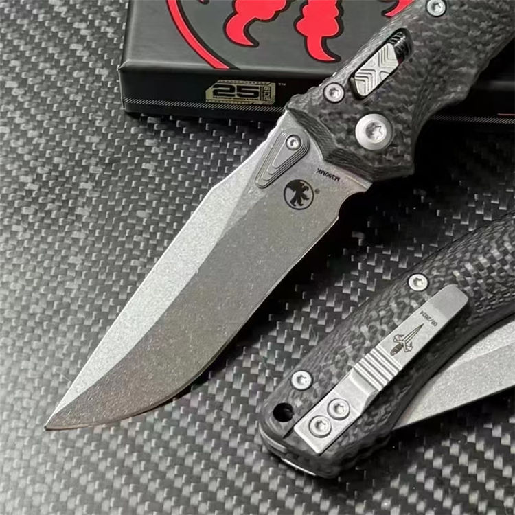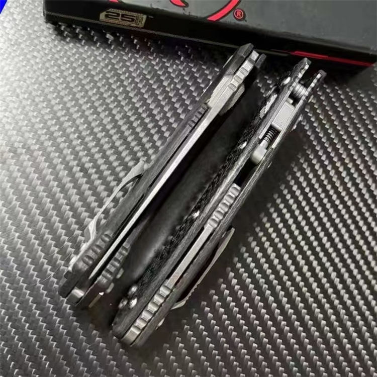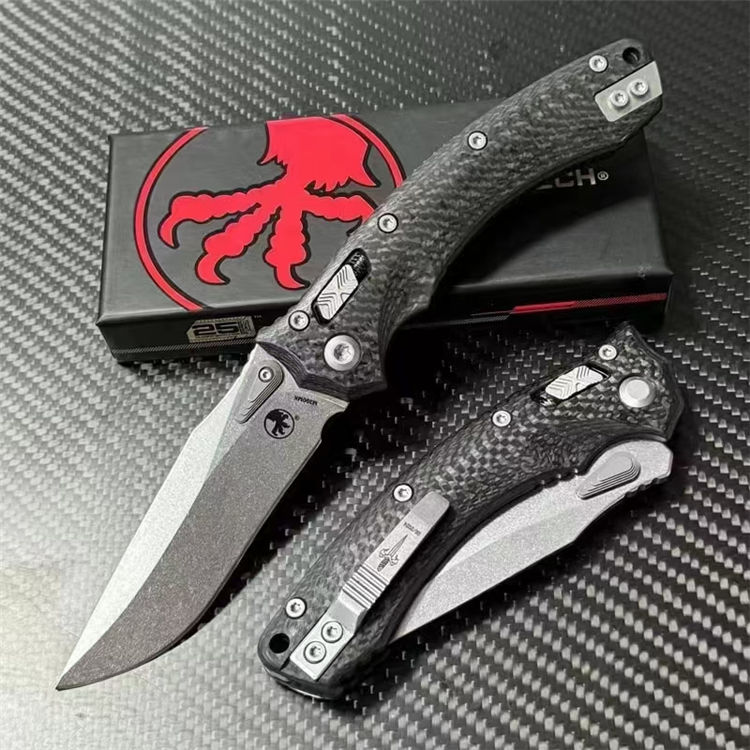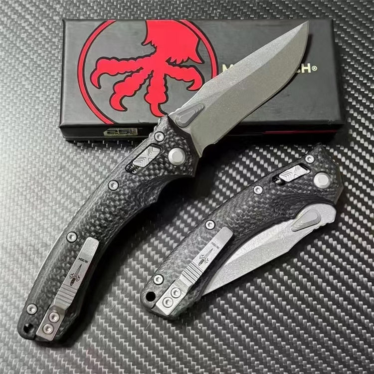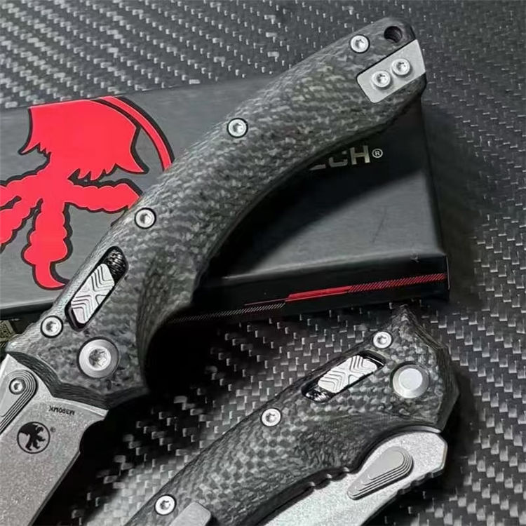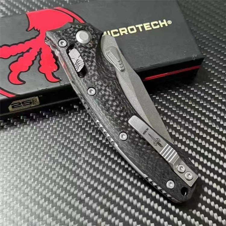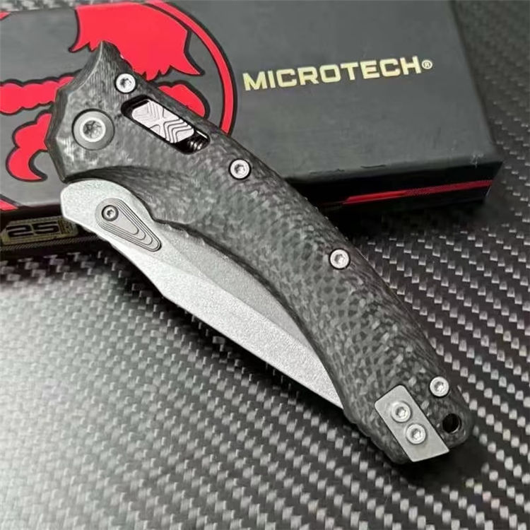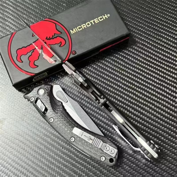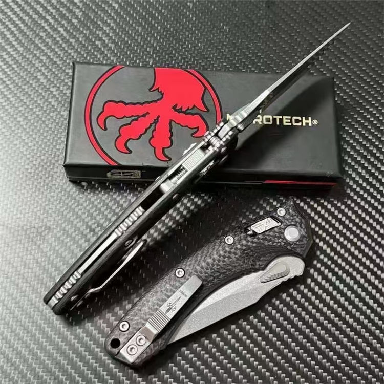 微技术碳纤维两栖折刀 总长:22.9cm 刃长:9.5cm 宽度:2.9cm 厚度:4mm 材质:M390 柄材:G10 柄长:12CM 重量:160克 陶瓷轴承彩盒包装