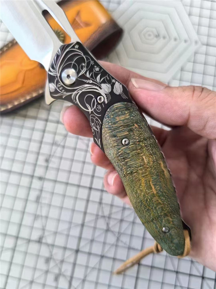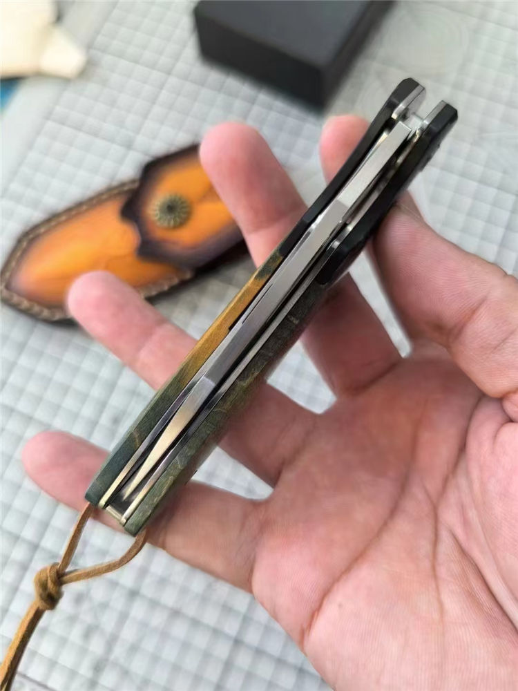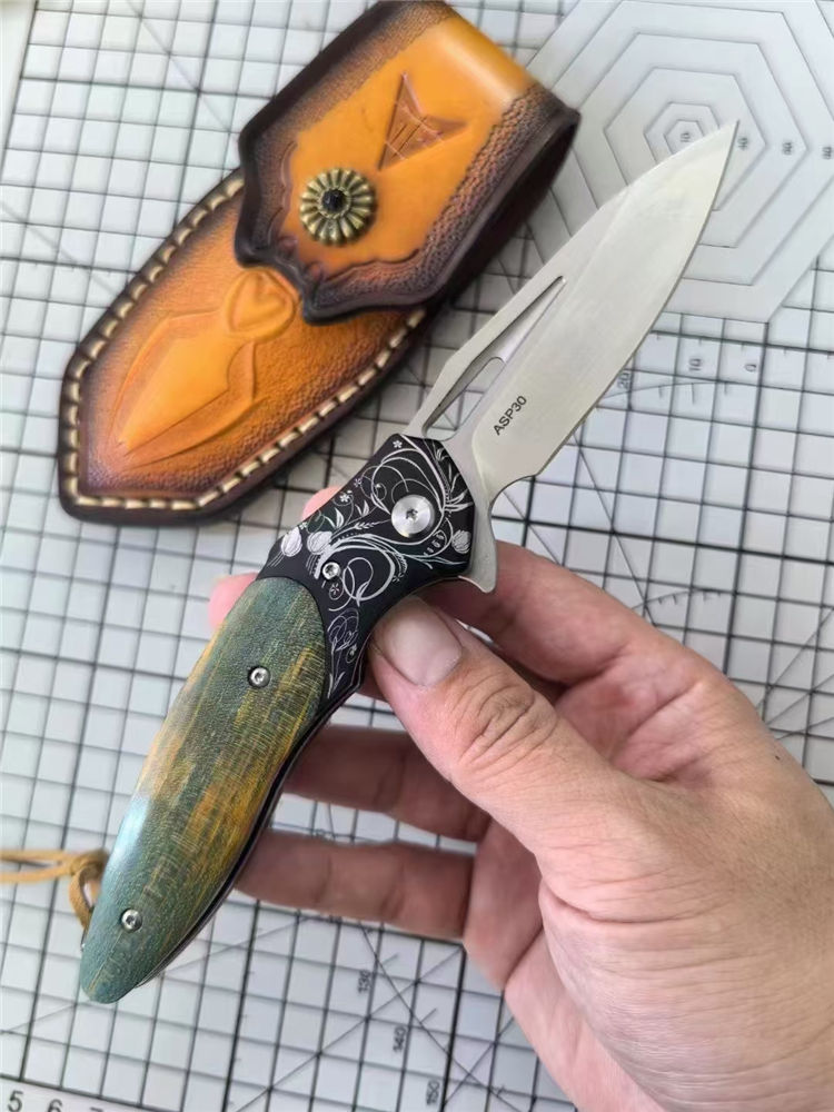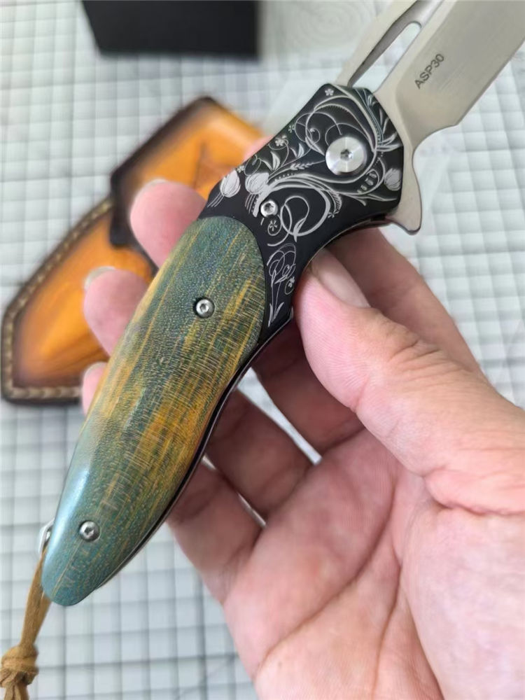 稳定木ASP钢折刀 全长:19cm 柄长:11.5cm 刃宽:2.8cm 刃厚:0.3cm 刃长:8.5cm 刃材:ASP30 柄材:稳定固化木 硬度:60-61HRC 刀重:179克 刀加皮套:221克