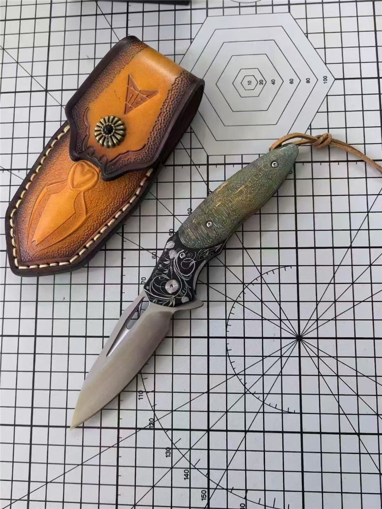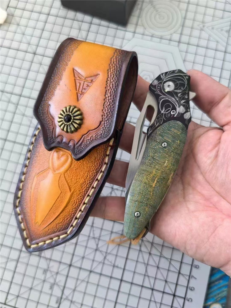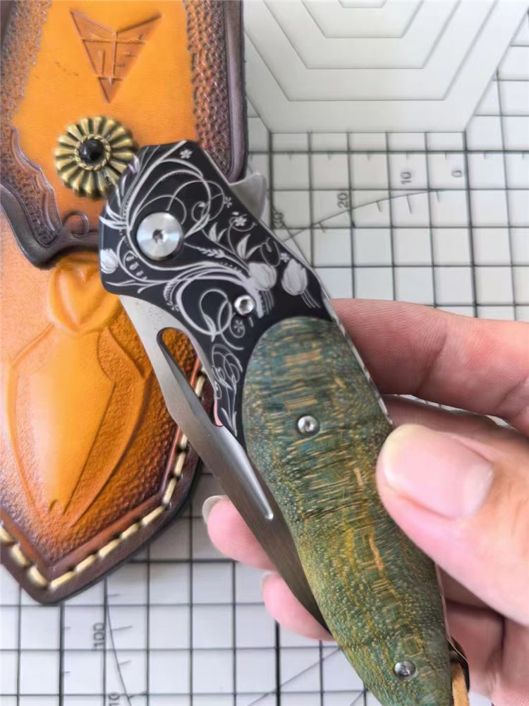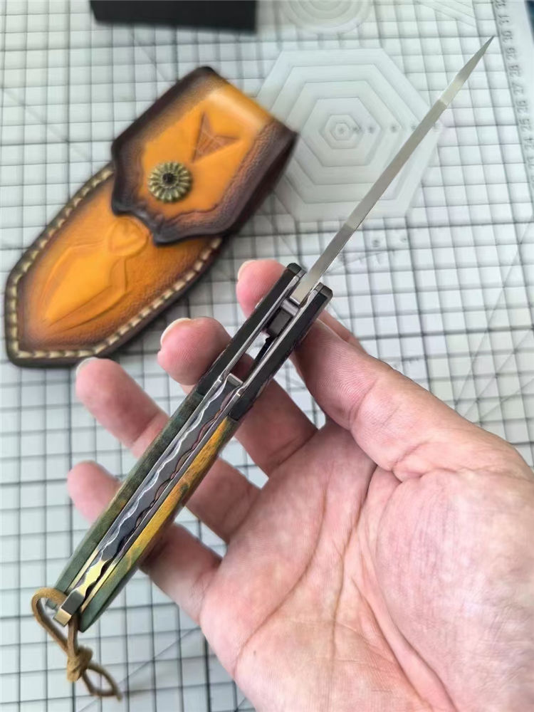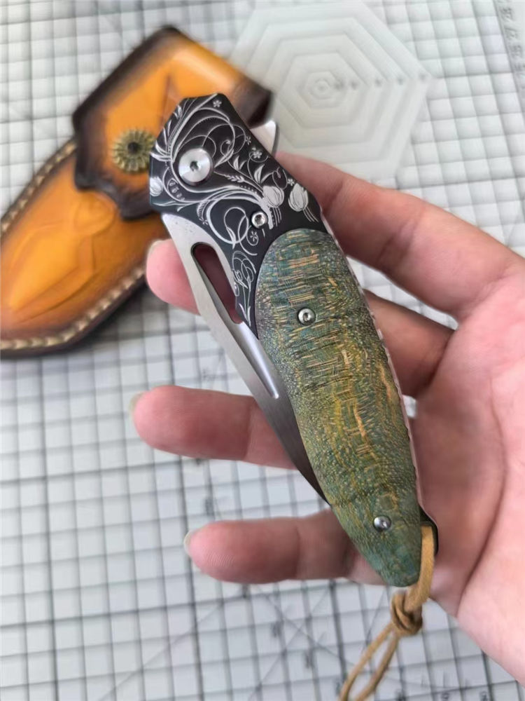 稳定木ASP钢折刀 全长:19cm 柄长:11.5cm 刃宽:2.8cm 刃厚:0.3cm 刃长:8.5cm 刃材:ASP30 柄材:稳定固化木 硬度:60-61HRC 刀重:179克 刀加皮套:221克