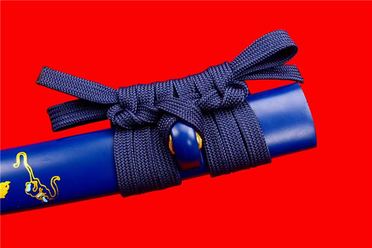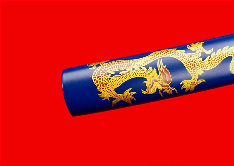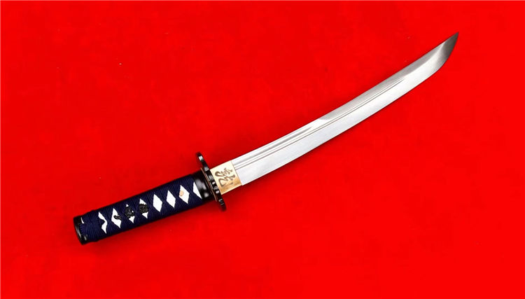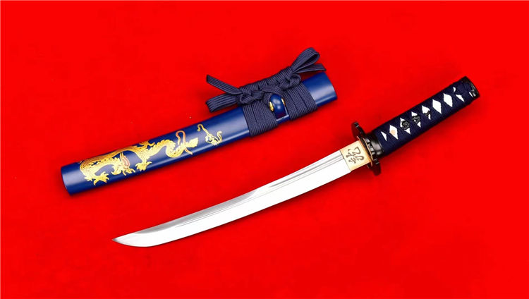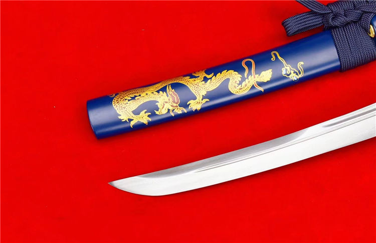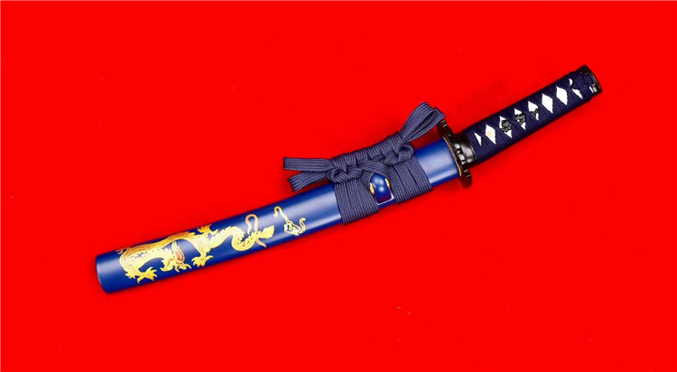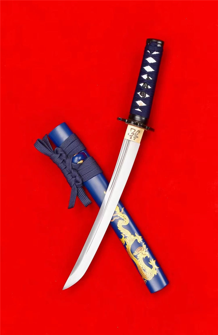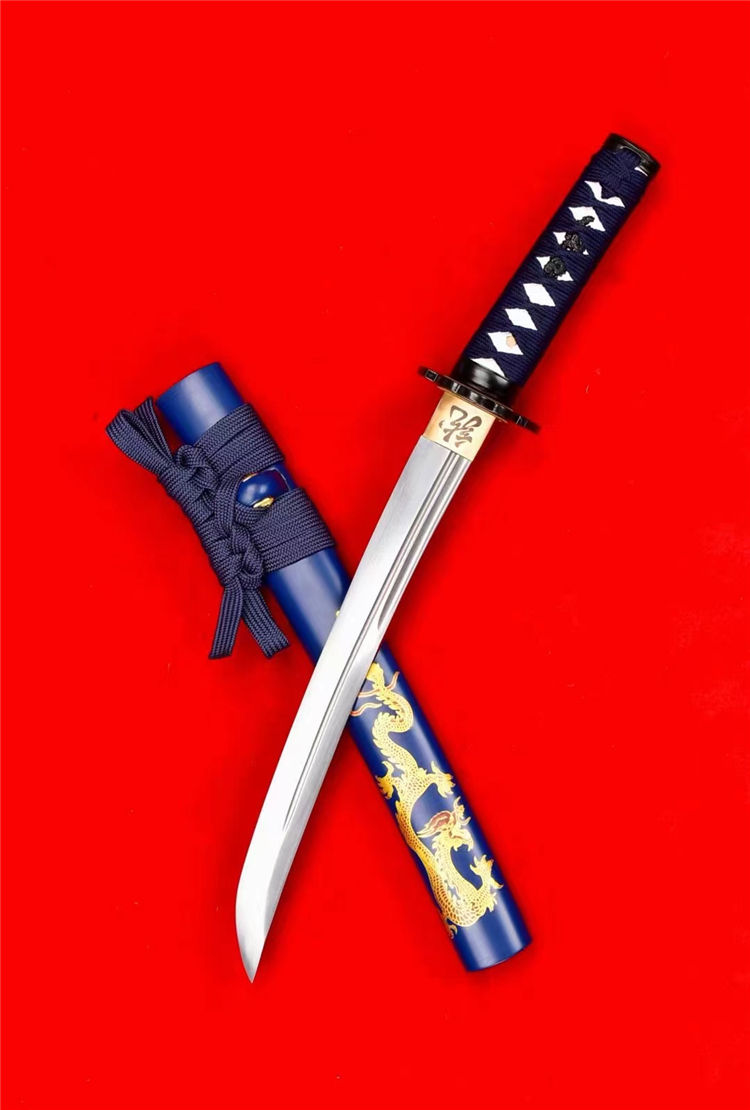 龙字烧刃武士刀 全长:53cm 刃长:30cm. 刃材:折叠钢锻打 手工开槽研磨,实木包皮鞘,铁装具