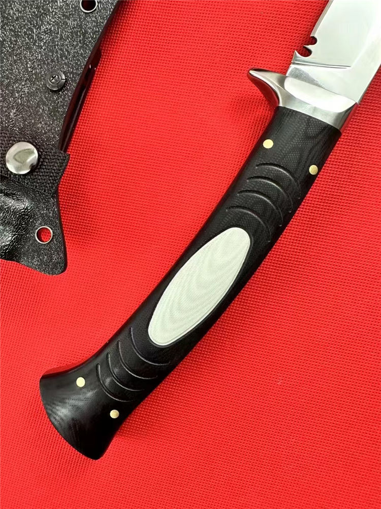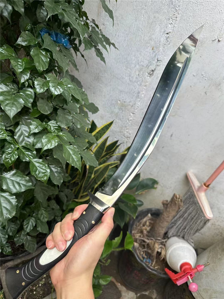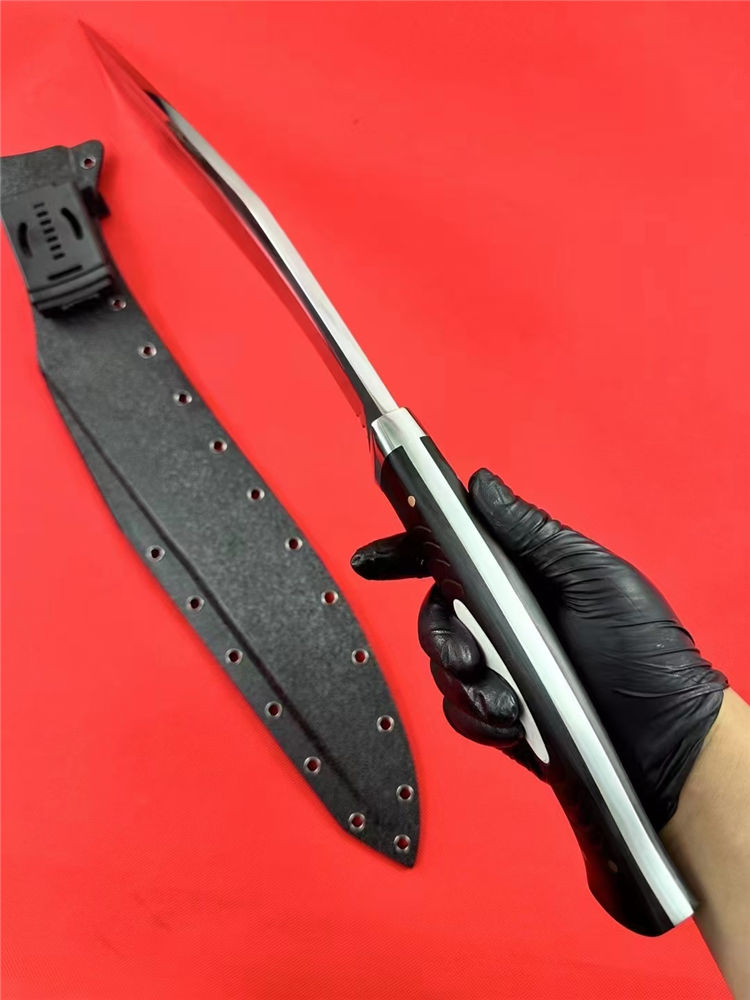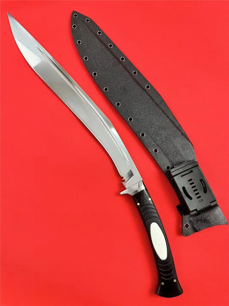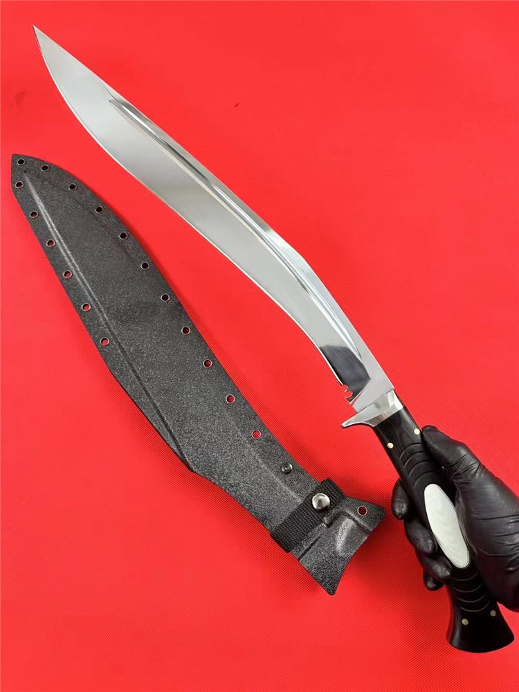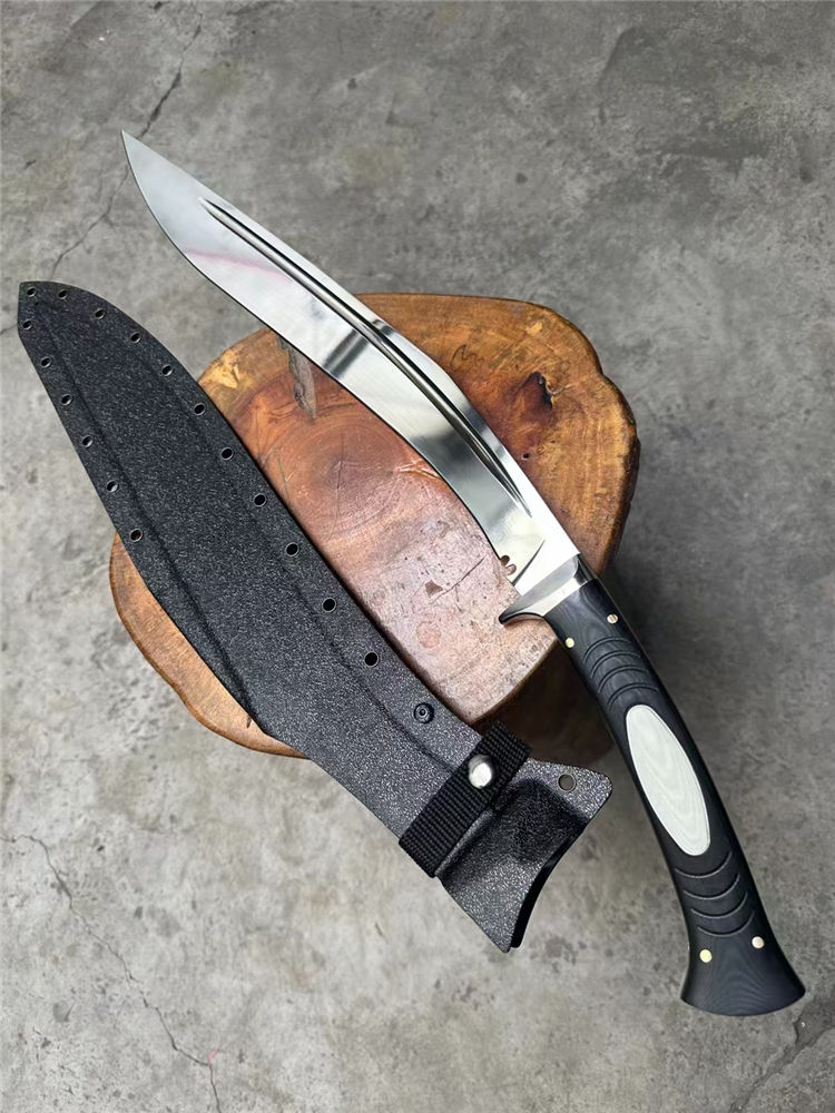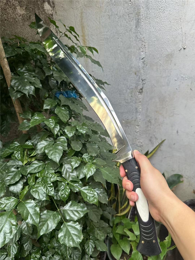 尼泊尔武士狗腿弯刀 全长:67CM 刃长:45CM 刃厚:0.75CM 柄长:21CM 材质:DC53真空热处理 柄材:进口G10 重量:1.25kg含鞘1.5kg 硬度:60-61HRC 刀套:K鞘 柄厚:2.3CM 表面:手工镜光