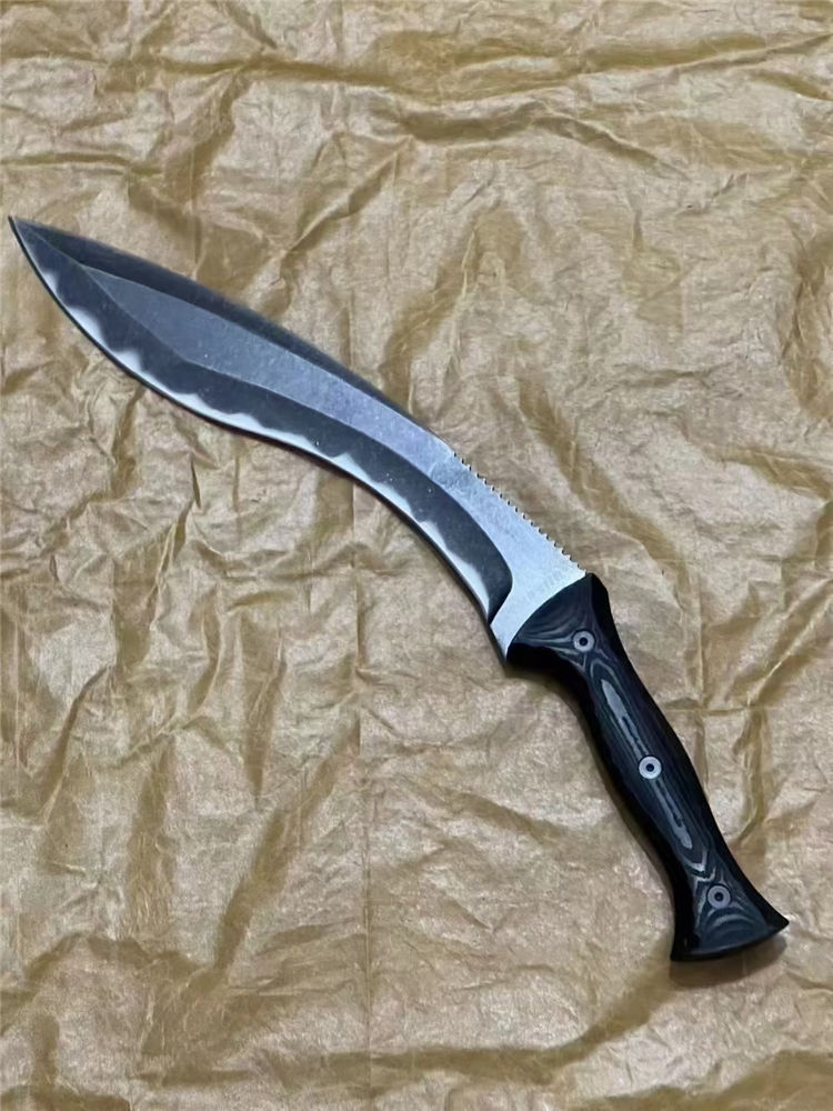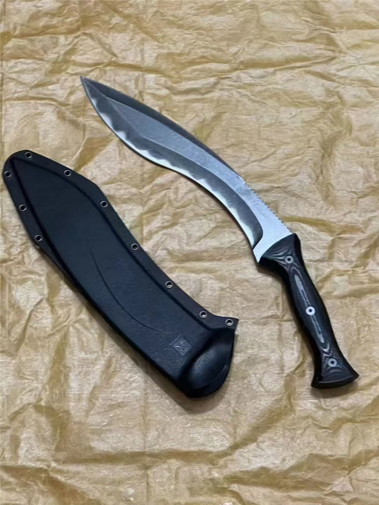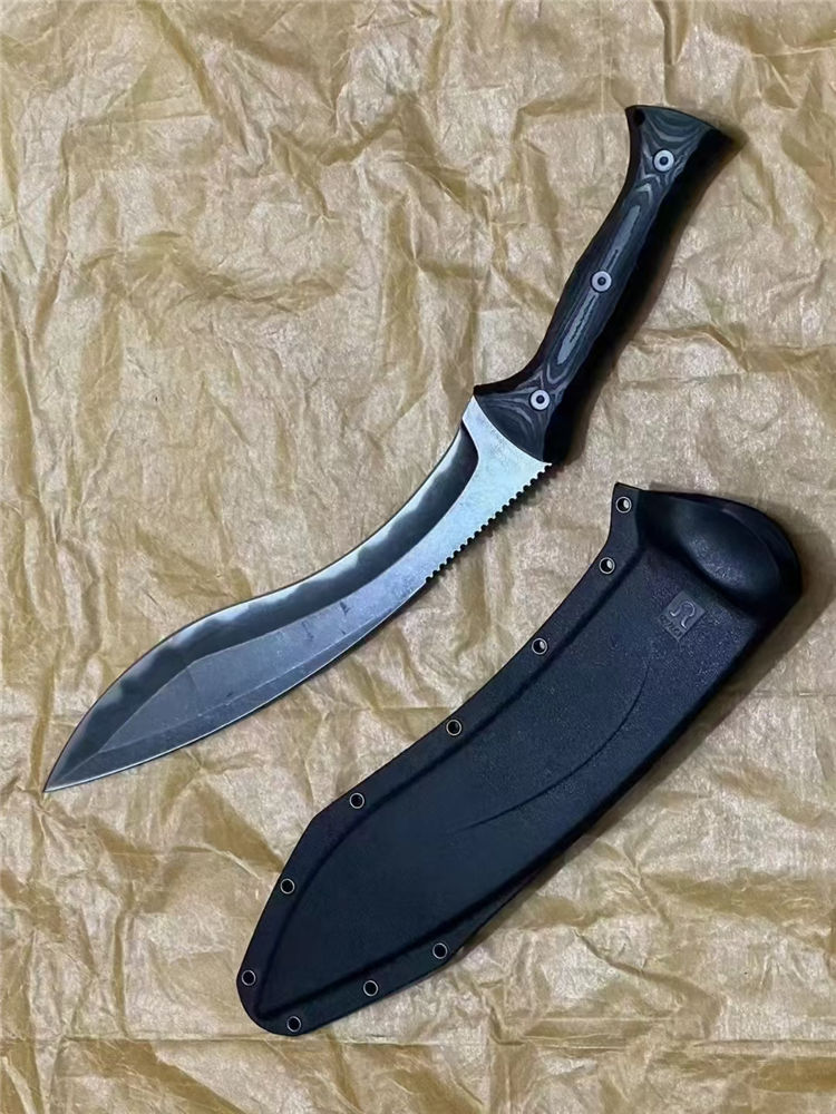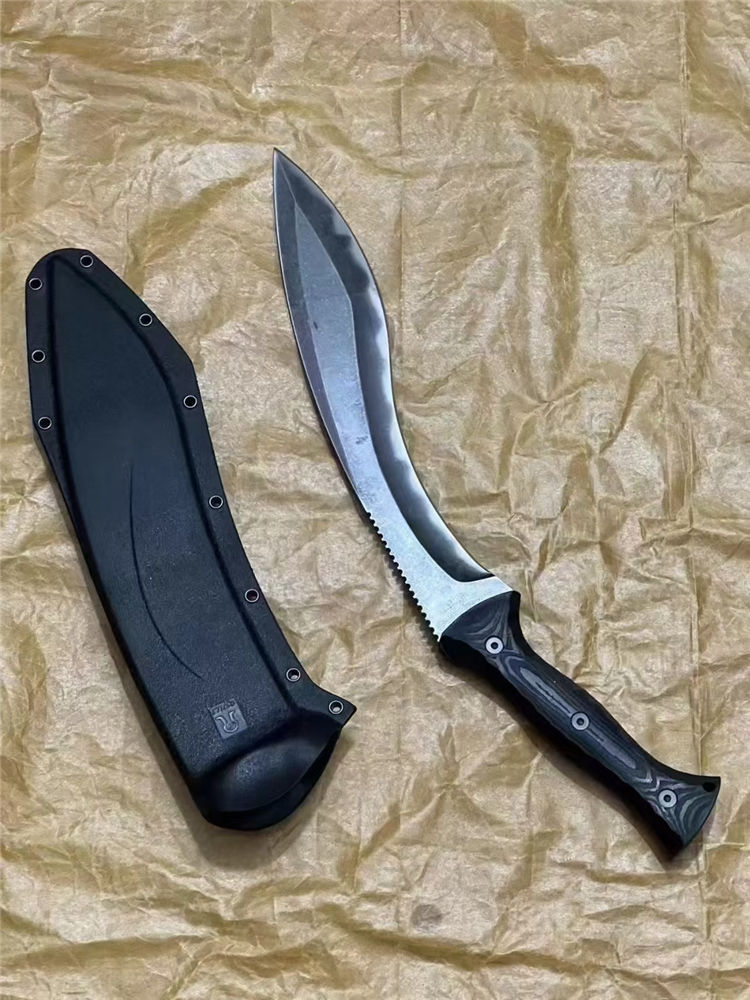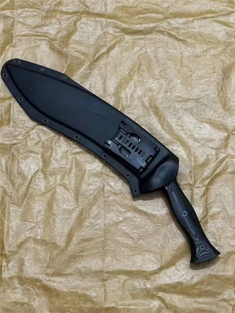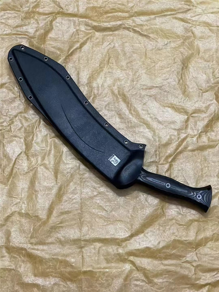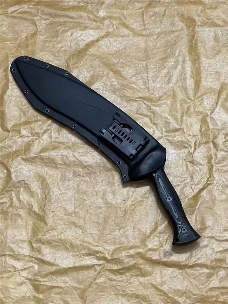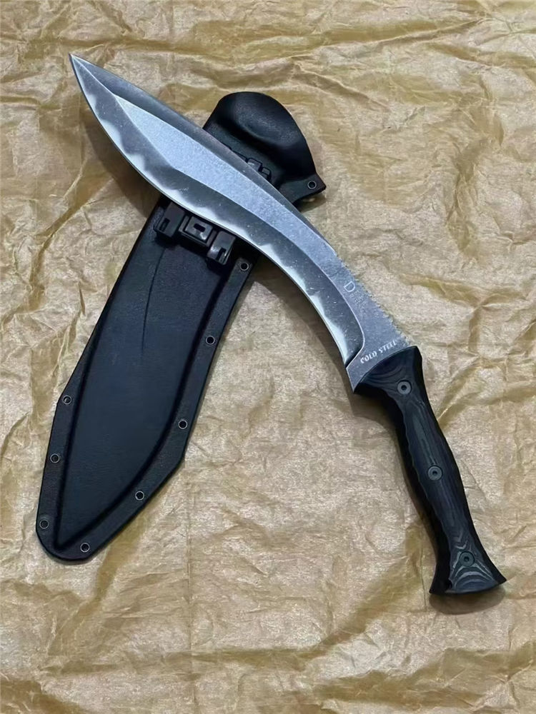 冷钢极度深寒狗腿刀 全长:46cm 刃长:30cm 柄长:16cm 刃厚:7.2mm 刃材:9cr18mov 硬度:59-60HRC 重量:950g 表面:3D喷塑(不掉色) 柄材:高强尼龙聚合物 刀鞘:K鞘