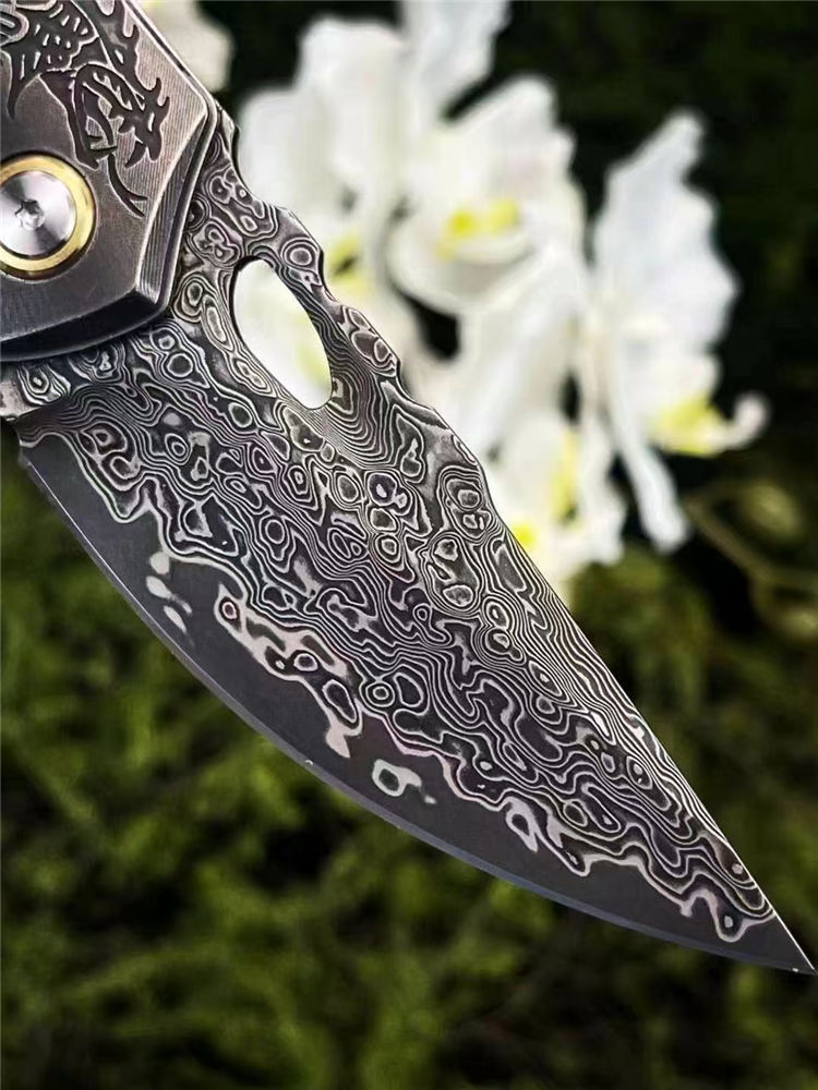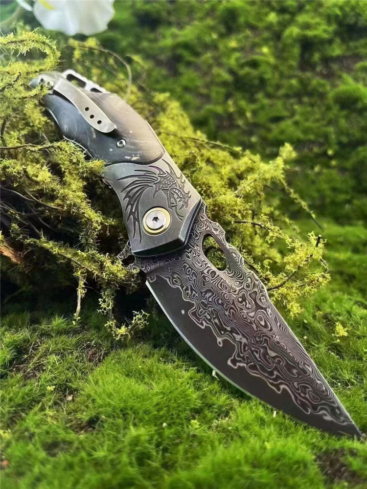 大马士革小盗龙折刀 全长:18cm 刃长:7.5cm 刃厚:0.3cm 材质:VG10刃钢大马士革锻打祥云纹 柄材:刀柄精选多彩固化稳定木手工多道打磨抛光 硬度:60HRC