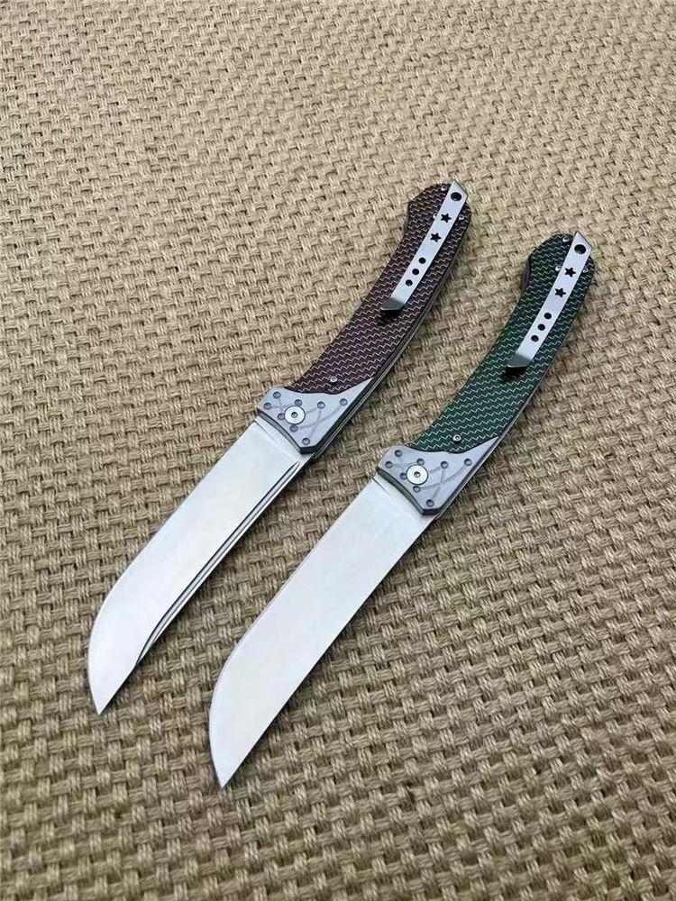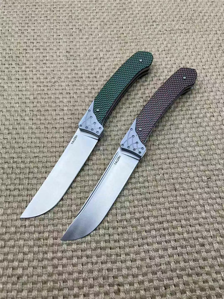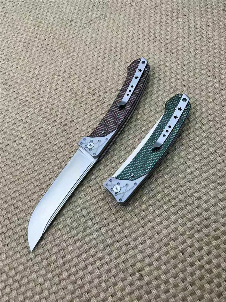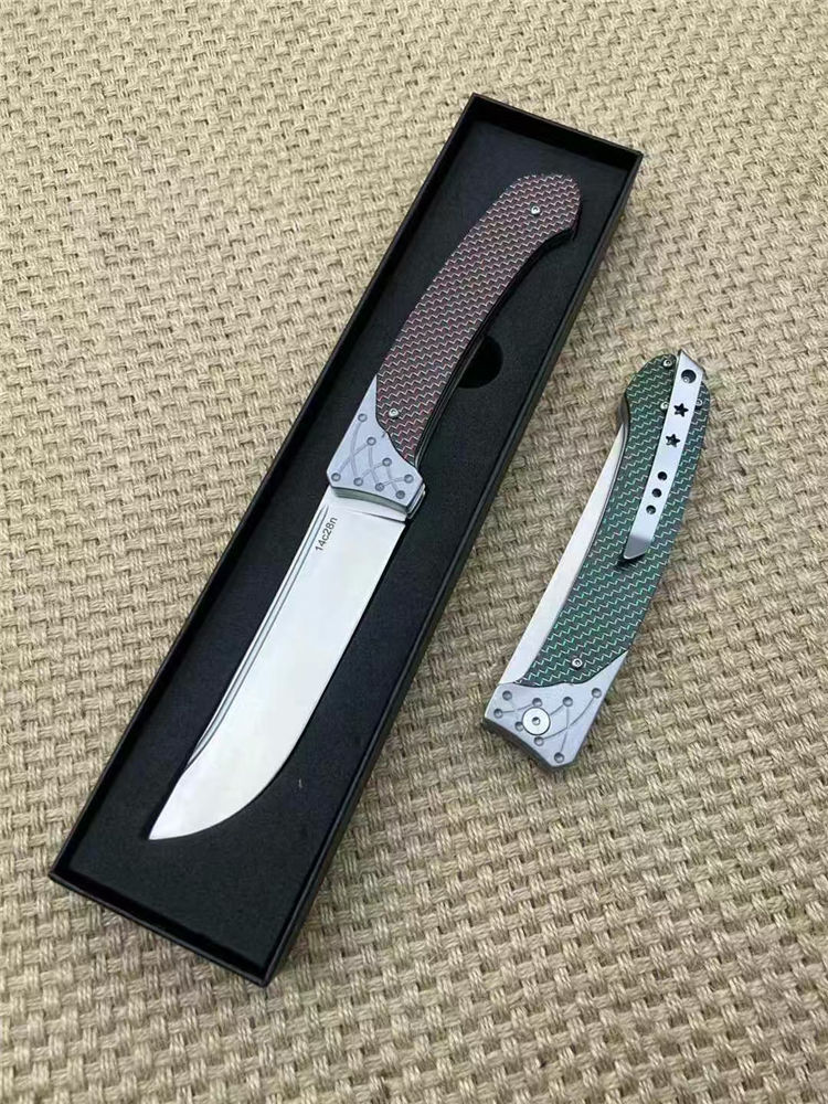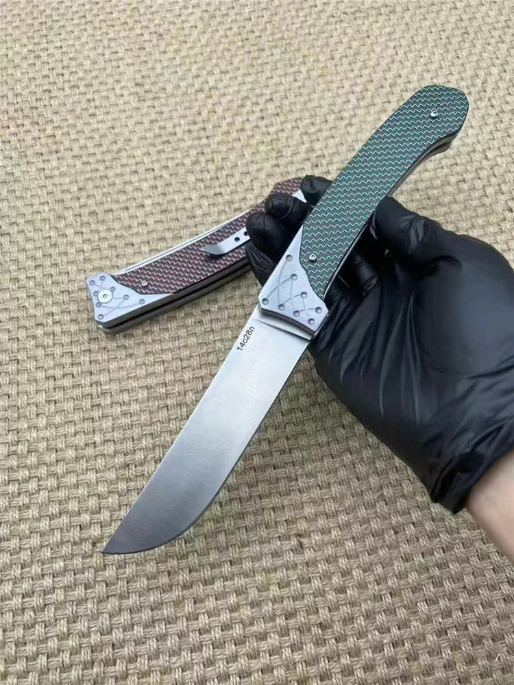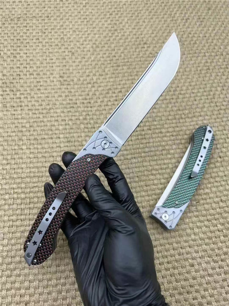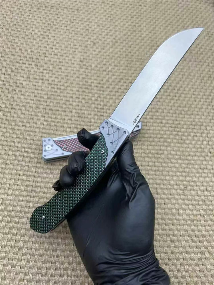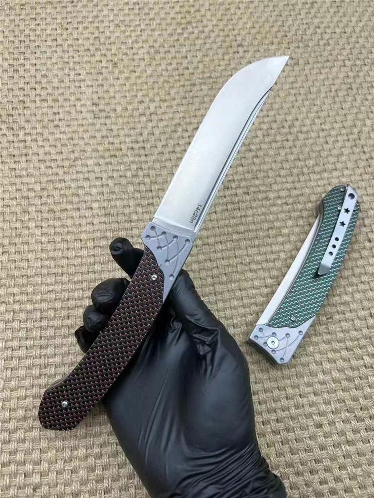 机制解锁大折刀 全长:26.5cm 刃长:11.5cm 刀厚:3.5mm 闭合:14cm 刃材:14c28n 柄材:航空铝合金+高级彩色碳钎维 总重:267g 表面:数控光面+高强度氧化黑 工艺:刀身采用精准的数控水磨处理,手柄整体采用数控电脑逻