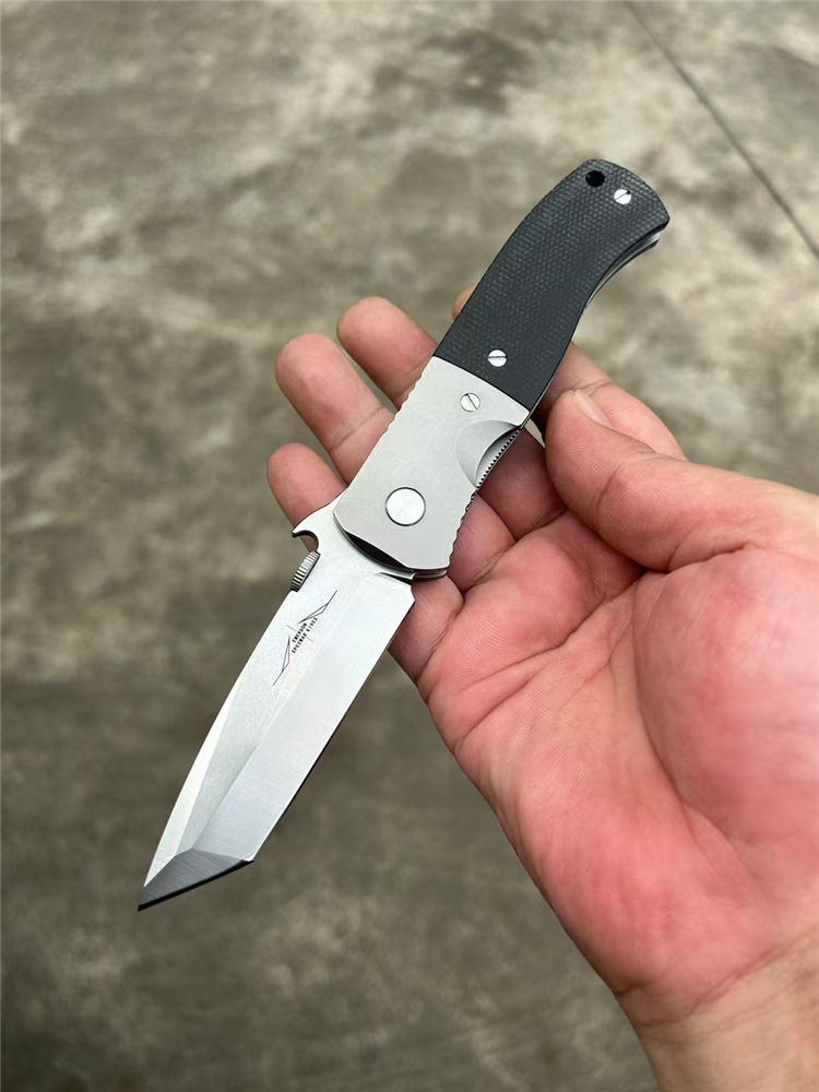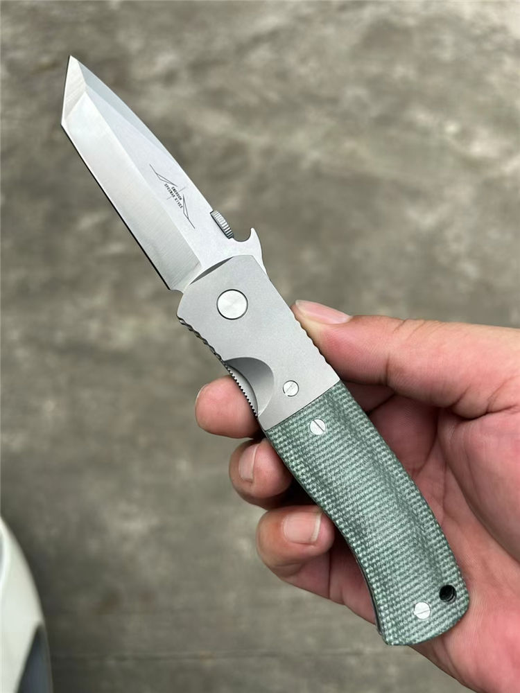 艾默生CQC-7折刀 全长:21.5cm 刃长:8.2cm 刃厚:0.3cm 钛合金刀枕,N690钢刀刃,钢衬锁,陶瓷滚珠轴承系统 单面刃,钢内衬锁,钛和亚麻布贴片,亚麻布尾骨,钛夹子