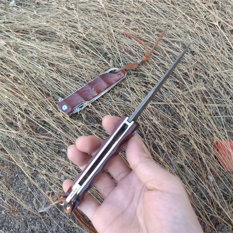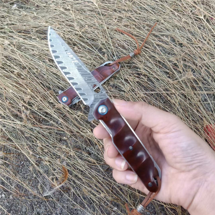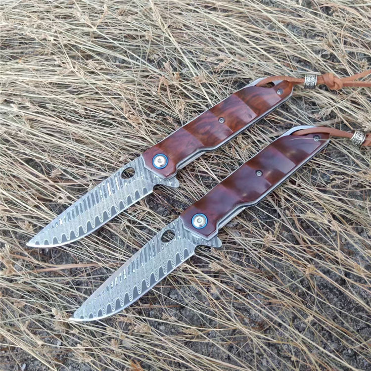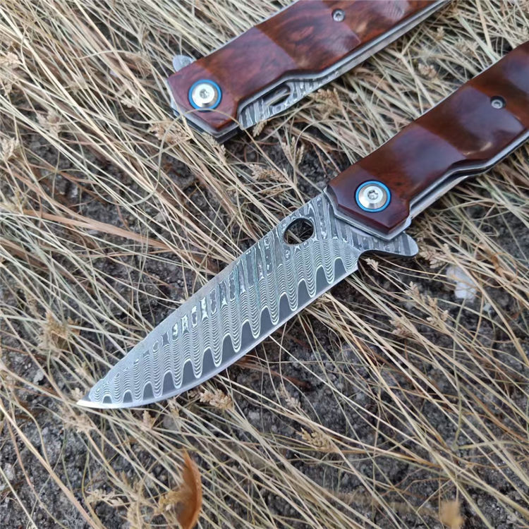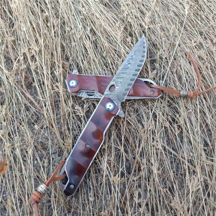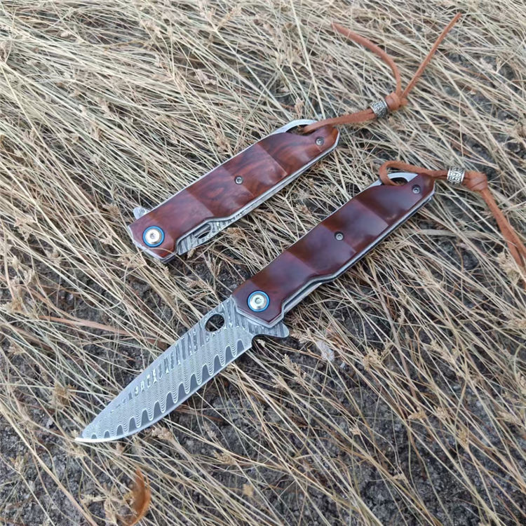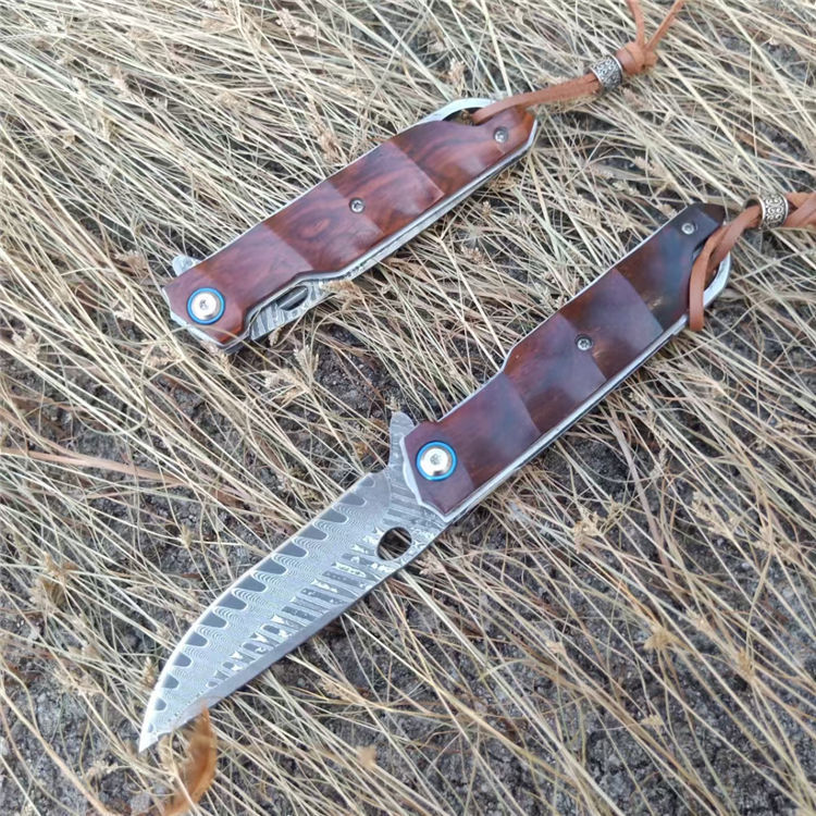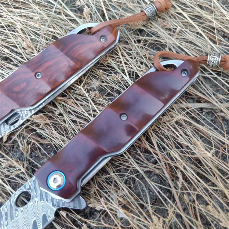 大马士革红檀木折刀 全长:18.2cm 刃长:7.8cm 柄长:10.2cm 刃宽:2.3cm 刃厚:2.8mm 刃材:大马士革钢 刀重:85g 重量:117g (含包装物) 硬度:58-60HRC 表面:大马士革原有纹路 柄材:微粒红檀木手柄 锁型:线锁 其他:黑色纸盒
