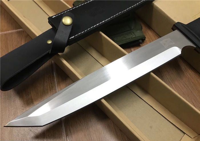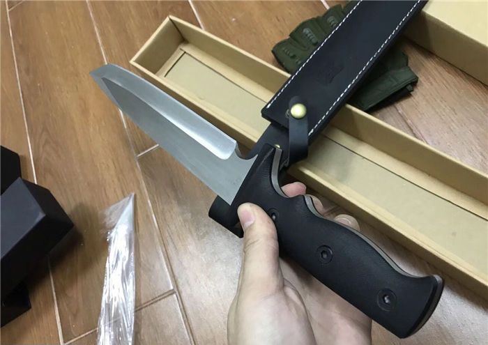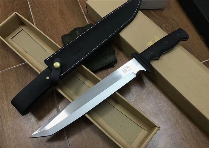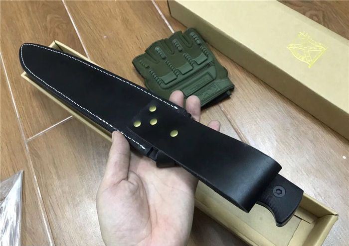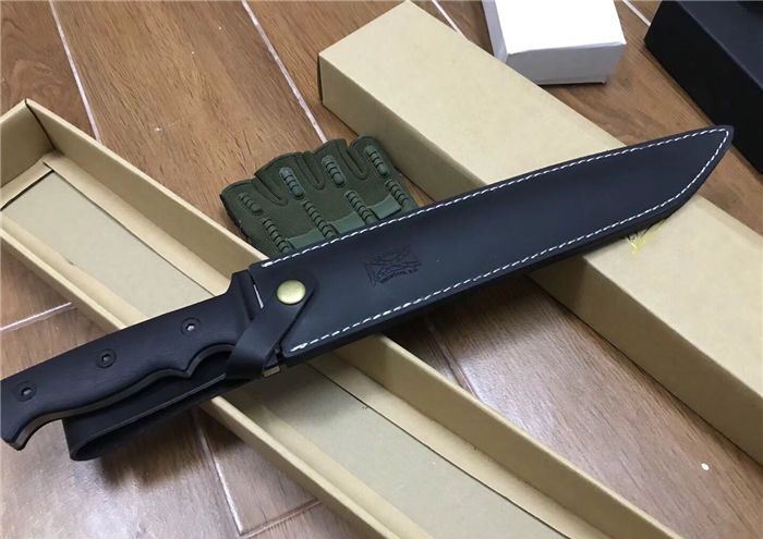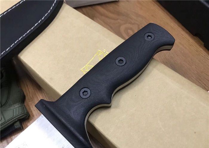 布兰登M9(白版) 全长:42cm 刃长:28.5cm 柄长:13.5cm 刃厚:5.7mm 刃宽:4cm 刃材:5Cr13 柄材:米克塔 硬度:57HRC 净重:610克 毛重:1040克 表面处理:砂光