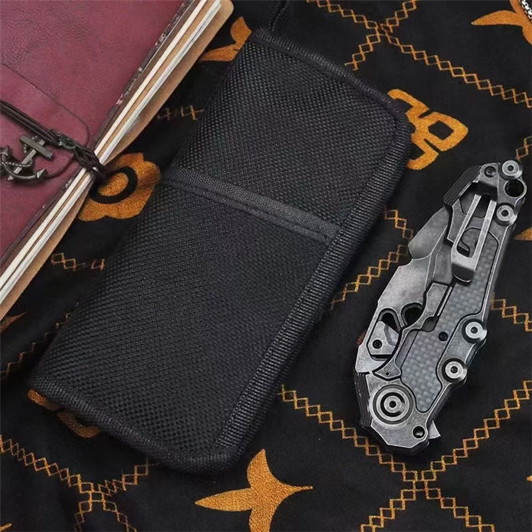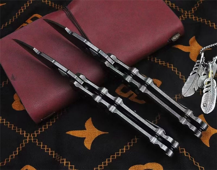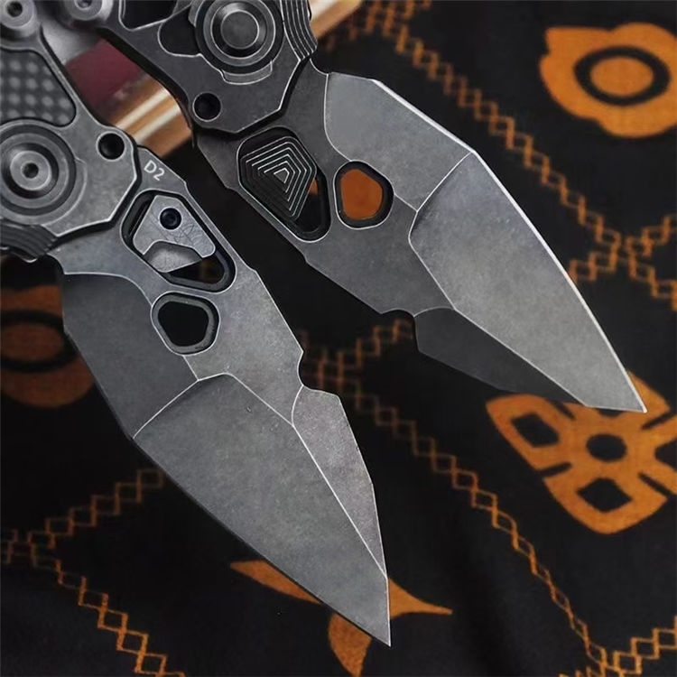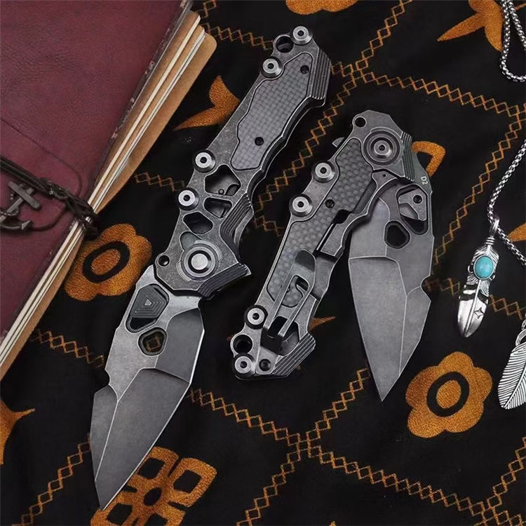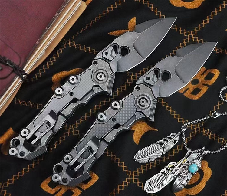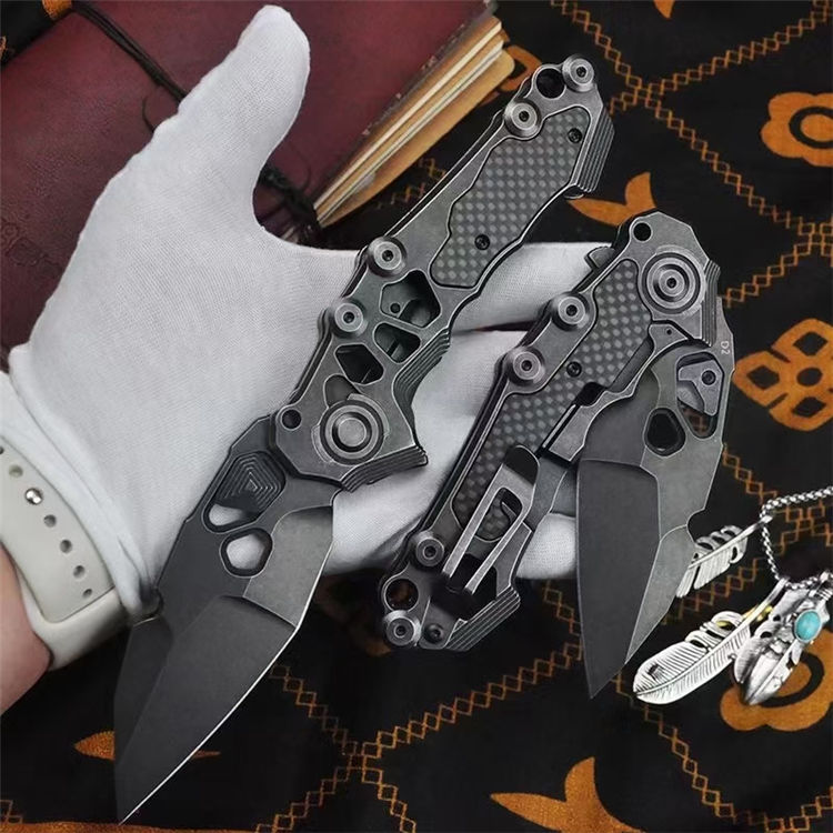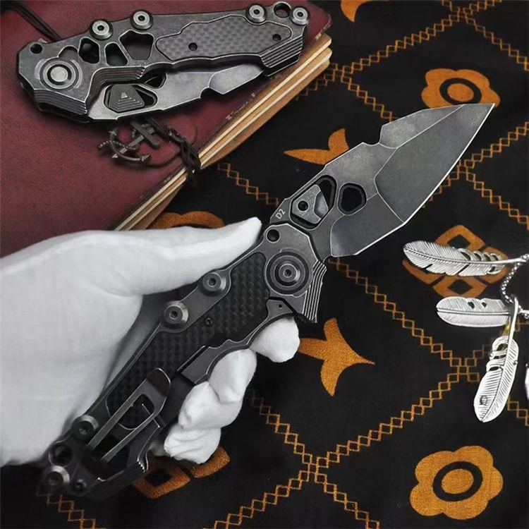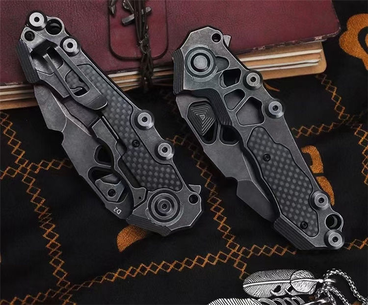 机甲师重型折刀 全长:22.5cm 刃长:8.6cm 柄长:13cm 刃宽:3.65cm(最宽处) 刃厚:4.5mm 刃材:D2 刃面:黑工艺石洗 手柄:石洗处理+镶嵌碳纤 硬度:59-60HRC 重量:254g/300g(含包装)