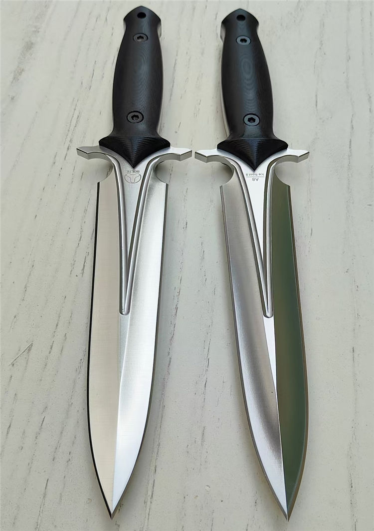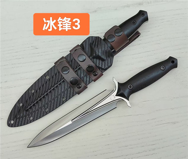 博尔特冰锋3直刀 全长:326mm 刃长:186mm 柄长:140mm 刃宽:40mm 刃厚:5.7-5.8mm 刃面:钢本砂光拉丝 类型:具有硬度高、锋利度、韧性保持度最出色 开刃方式:二次开刃 刃材:A8钢 热处理:真空淬油热处理和2次回火处理,使钢材韧性保持性更佳 硬度:61+-0.5HRC 柄材:黑色G10+强螺丝,一体柄、握感舒服、性能强悍 包装:精美黑纸盒+护刀油+伞绳 净重:410克 刀鞘:2.0美板黑色、碳纤维纹K鞘可选+头层牛皮皮扣带