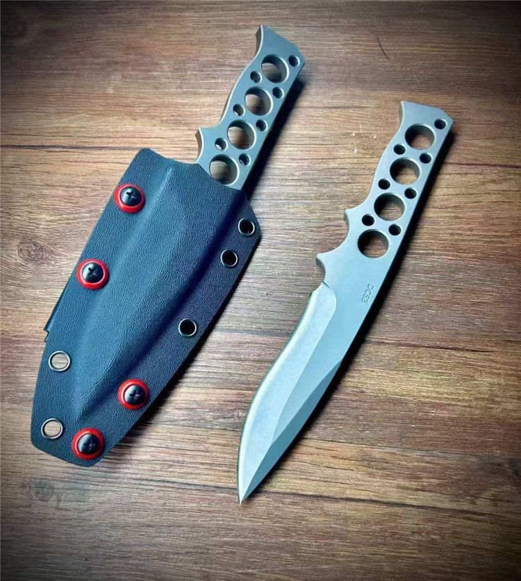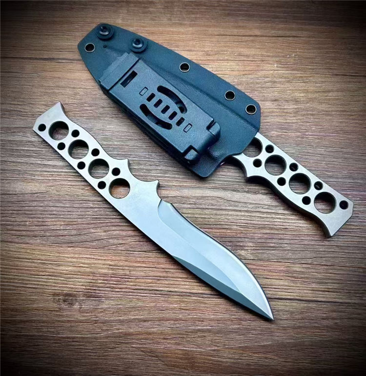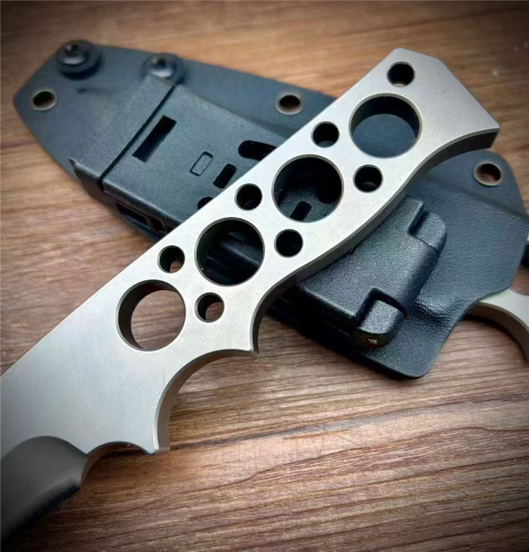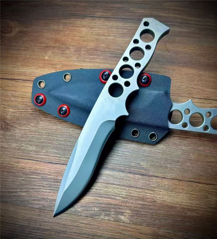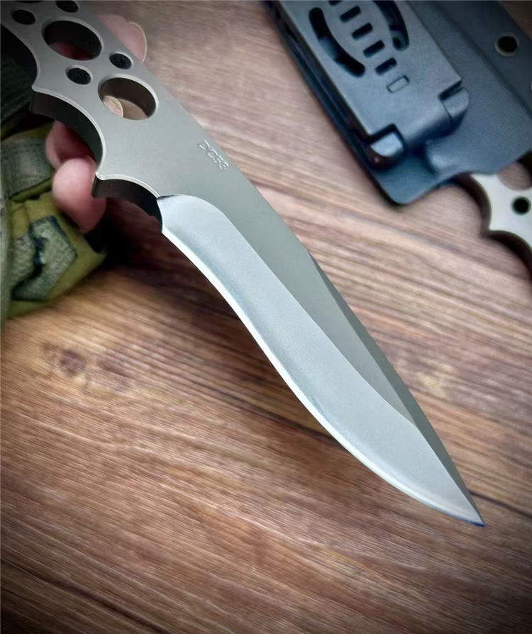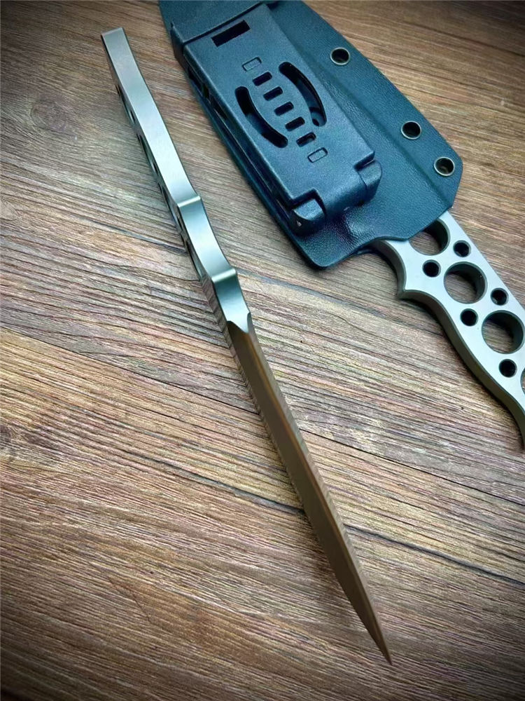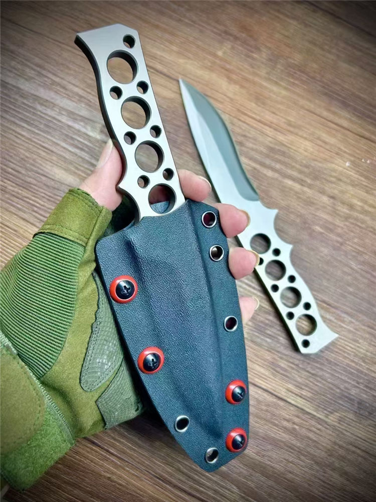 沃尔特布兰登直刀 全长:210mm 刃长:99mm 柄长:111mm 钢材:DC53 热处理:真空热处理(粹油)刃面数控开V 刃厚:8mm 净重:215克 手柄电脑锣光边:几个减重空孔加强好手感 刀鞘:K鞘➕背夹 包装:精美合子
