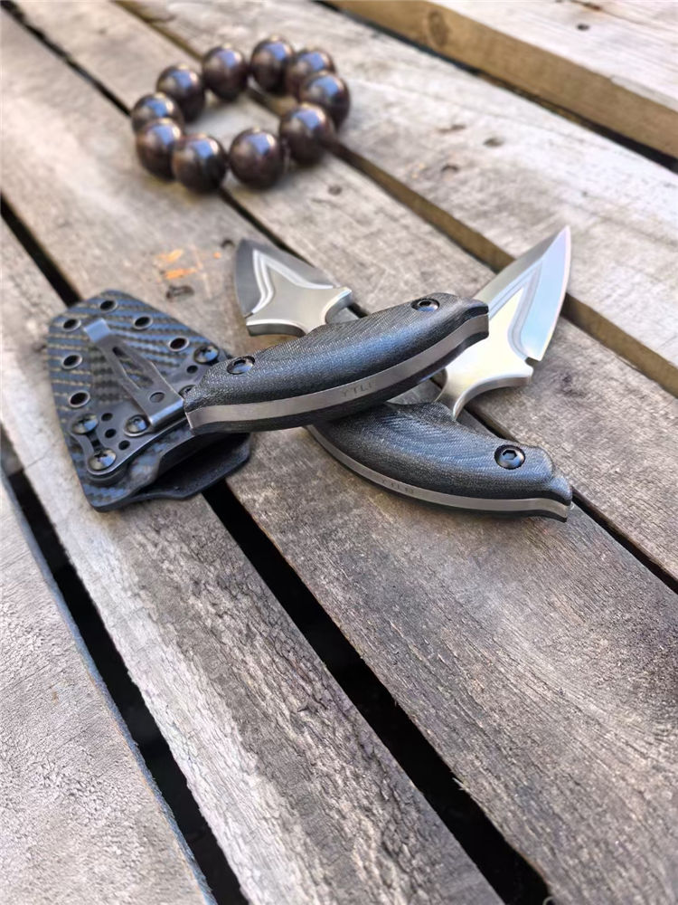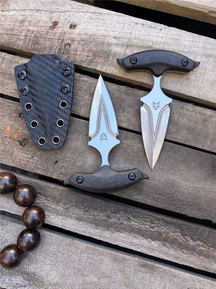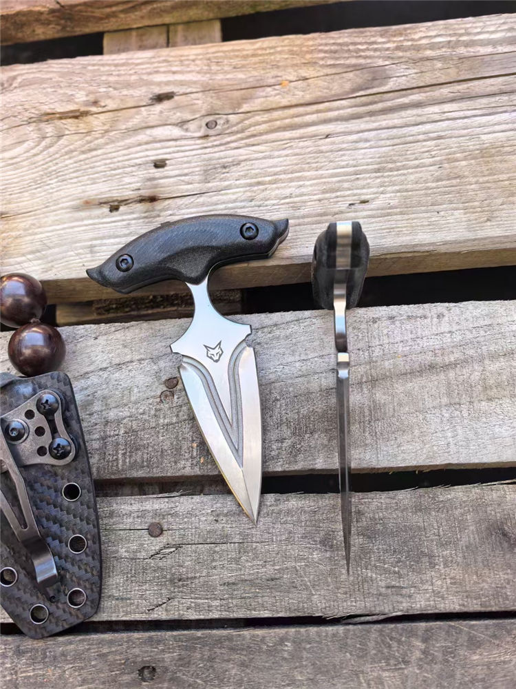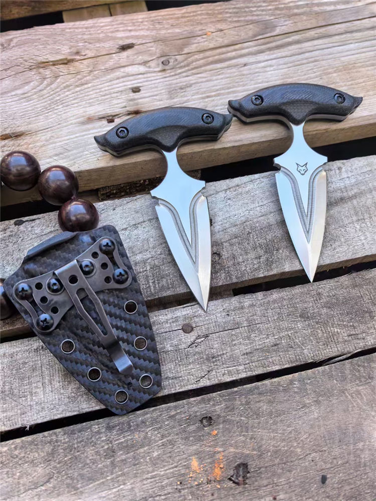 华匠坊银狐手刺 全长:137MM 柄宽:92MM 刃厚:5.2MM 刃长:73.5MM 刃宽:35MM 材质:YTL8 硬度:60 柄材:亚麻黑灰美卡塔 2.0碳纤维纹刀套(不锈钢一体反夹方便携带和隐蔽性完美)刀刃钢本砂光刀条精细石洗刃面CNC两条血槽,凶气凛凛,寒气逼人。四边小倒角,手感舒适,椭圆手柄,握持饱满做工四面对称,工整精确