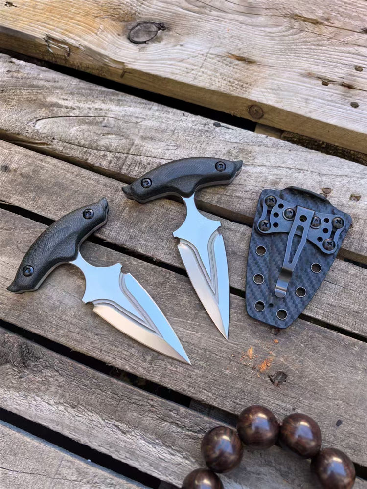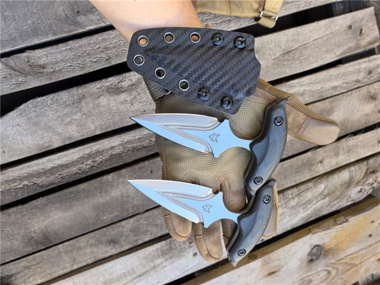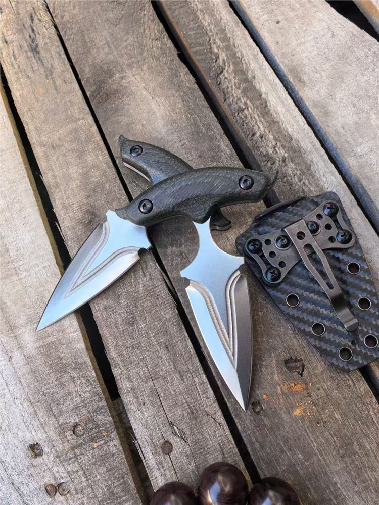 2.0碳纤维纹刀套(不锈钢一体反夹方便携带和隐蔽性完美)刀刃钢本砂光刀条精细石洗刃面CNC两条血槽,凶气凛凛,寒气逼人。四边小倒角,手感舒适,椭圆手柄,握持饱满做工四面对称,工整精确