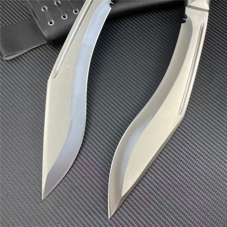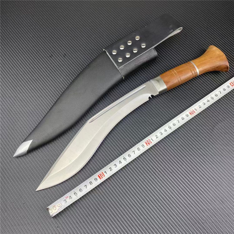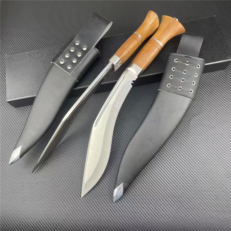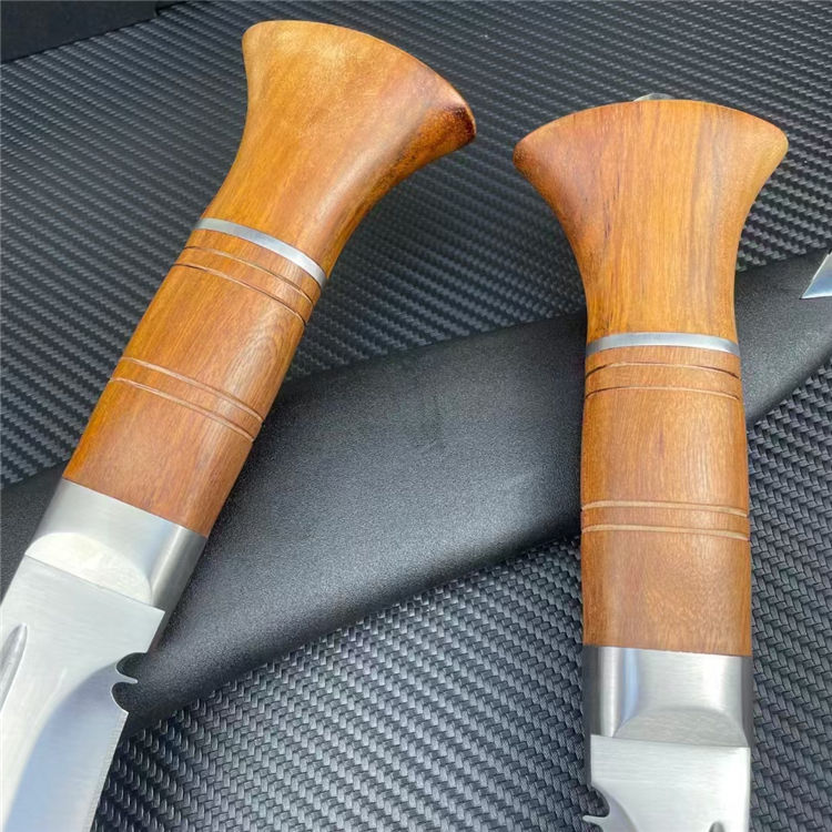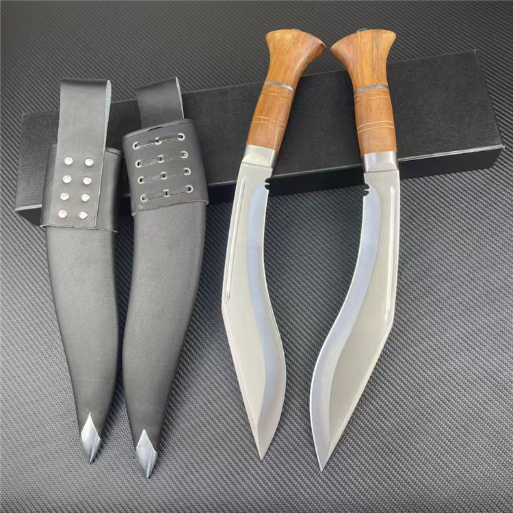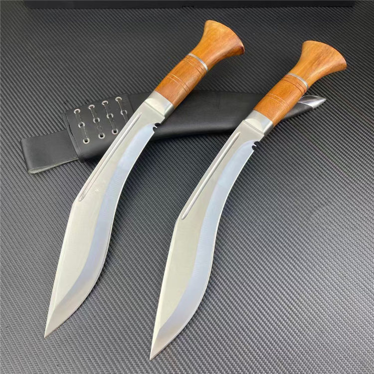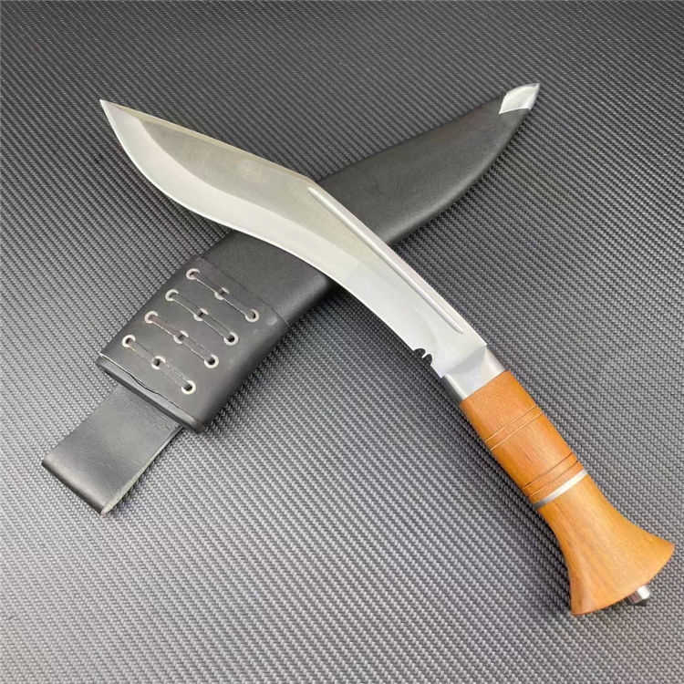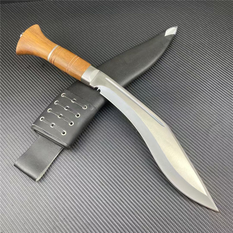 皇室狗腿弯刀 全长:43cm 刃宽:5cm 刃长:26cm 柄长:15cm 刃厚:6mm 刃材:8CR14 柄材:彩木柄(尾带破窗器) 刀重:607G/820G(含套刀) 毛量:1060G 硬度:58-60HRC 包装:礼盒