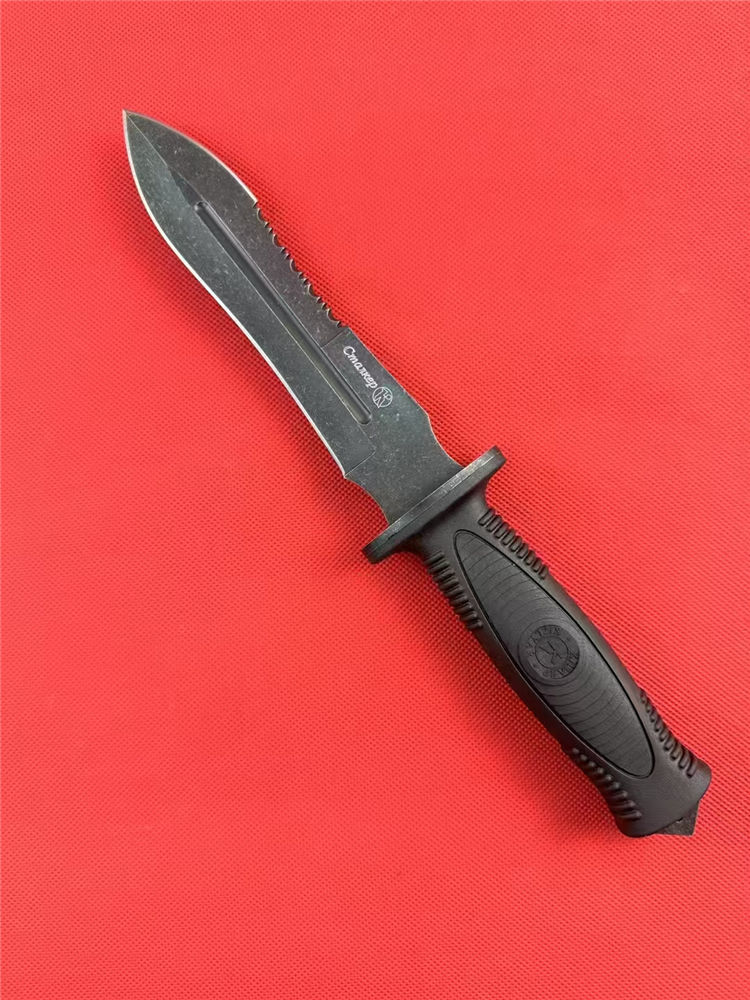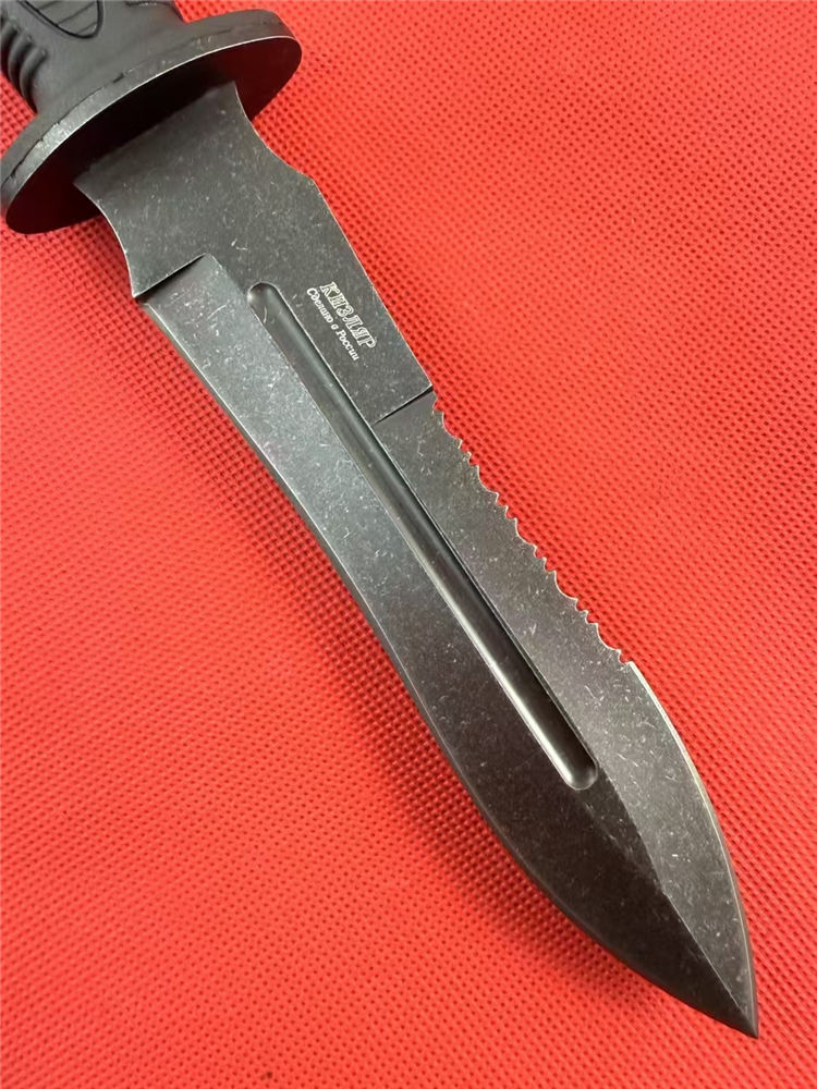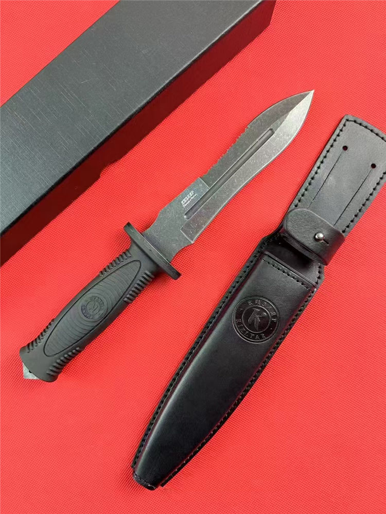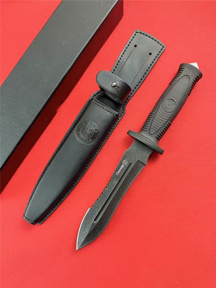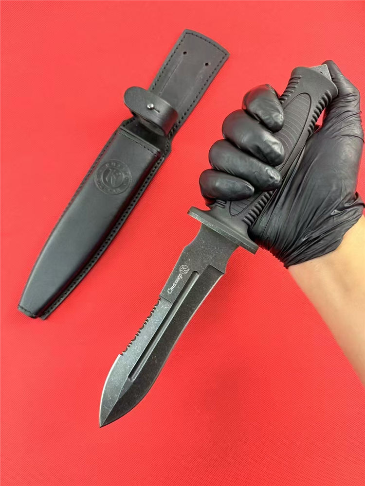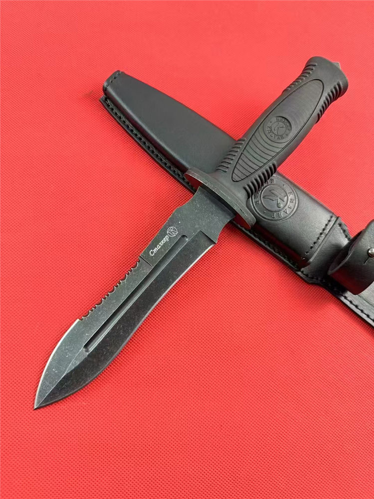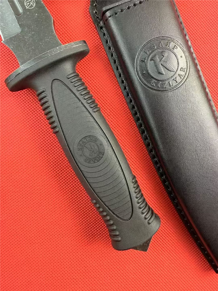俄罗斯基兹利亚尔潜行者直刀 总长:29.8cm 刃长:16.3cm 刃厚:4.7mm 硬度:59HRC 手柄:克拉通手柄 刃材:AUS-8 刀鞘:塑料护套,皮革覆盖