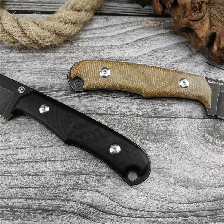 R小直刀 总长:21cm 刃长:10cm 刃宽:3cm 刃厚:3.1mm 刃材:D2 柄材:G10与麻柄 柄长:11cm 柄宽:25mm 柄厚:18mm 重量:121G