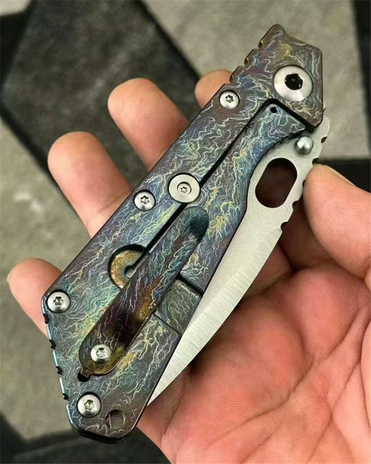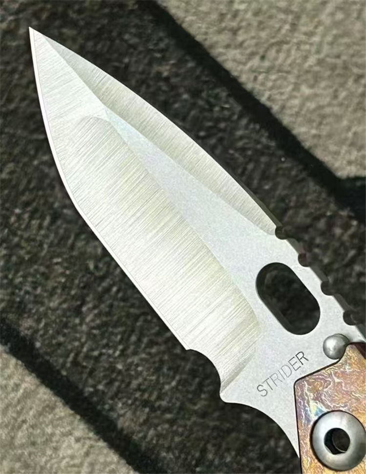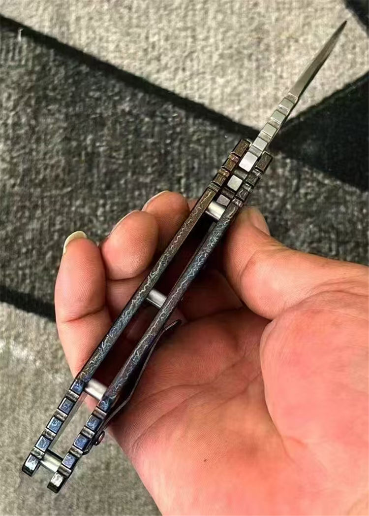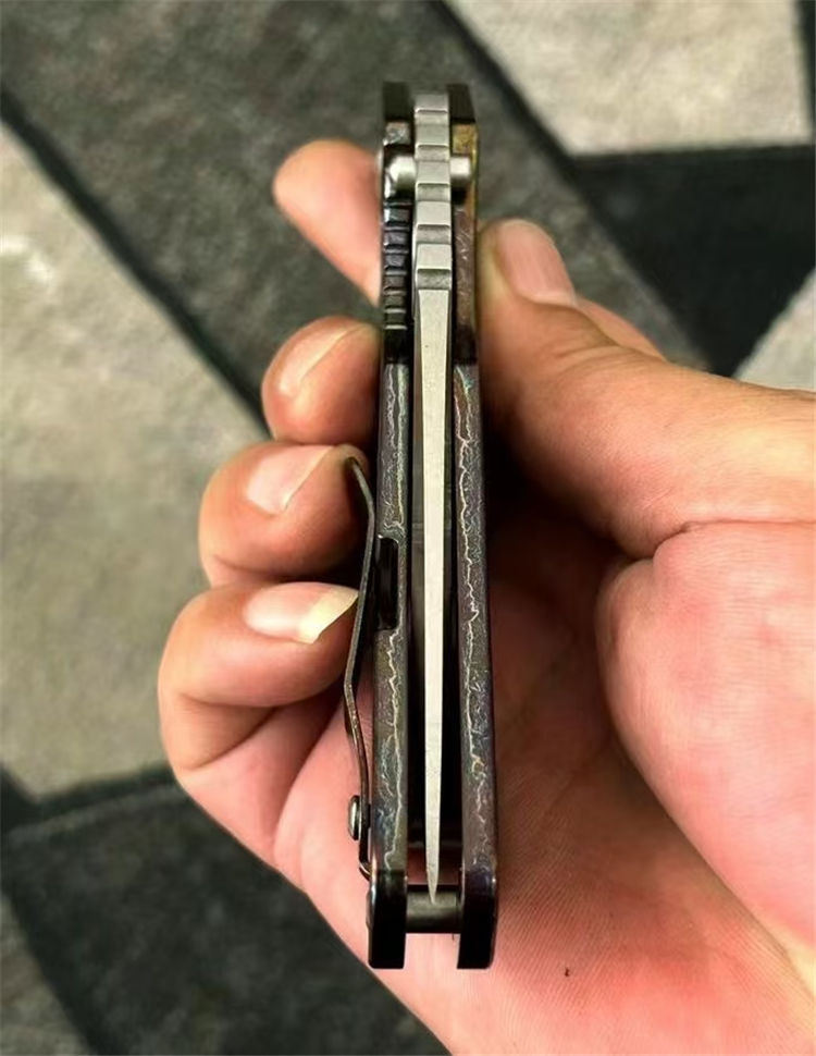 挺进者XL闪电纹折刀 总长:230mm 刃长:80mm 柄长:130mm 厚度:4.5mm 刃宽:34mm 表面:石洗+手工拉锻面 系统:铜垫片带独立钢头 硬度:61-62 HRC 净重:201克 材料:VG10 柄材:钛合金数控切割,成型工艺 柄面:阳极闪电纹
